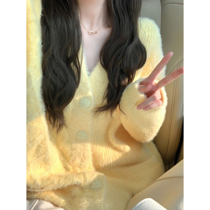 黃色奶系穿搭v領軟糯針織開衫女秋冬超好看溫柔仙女毛衣外套上衣