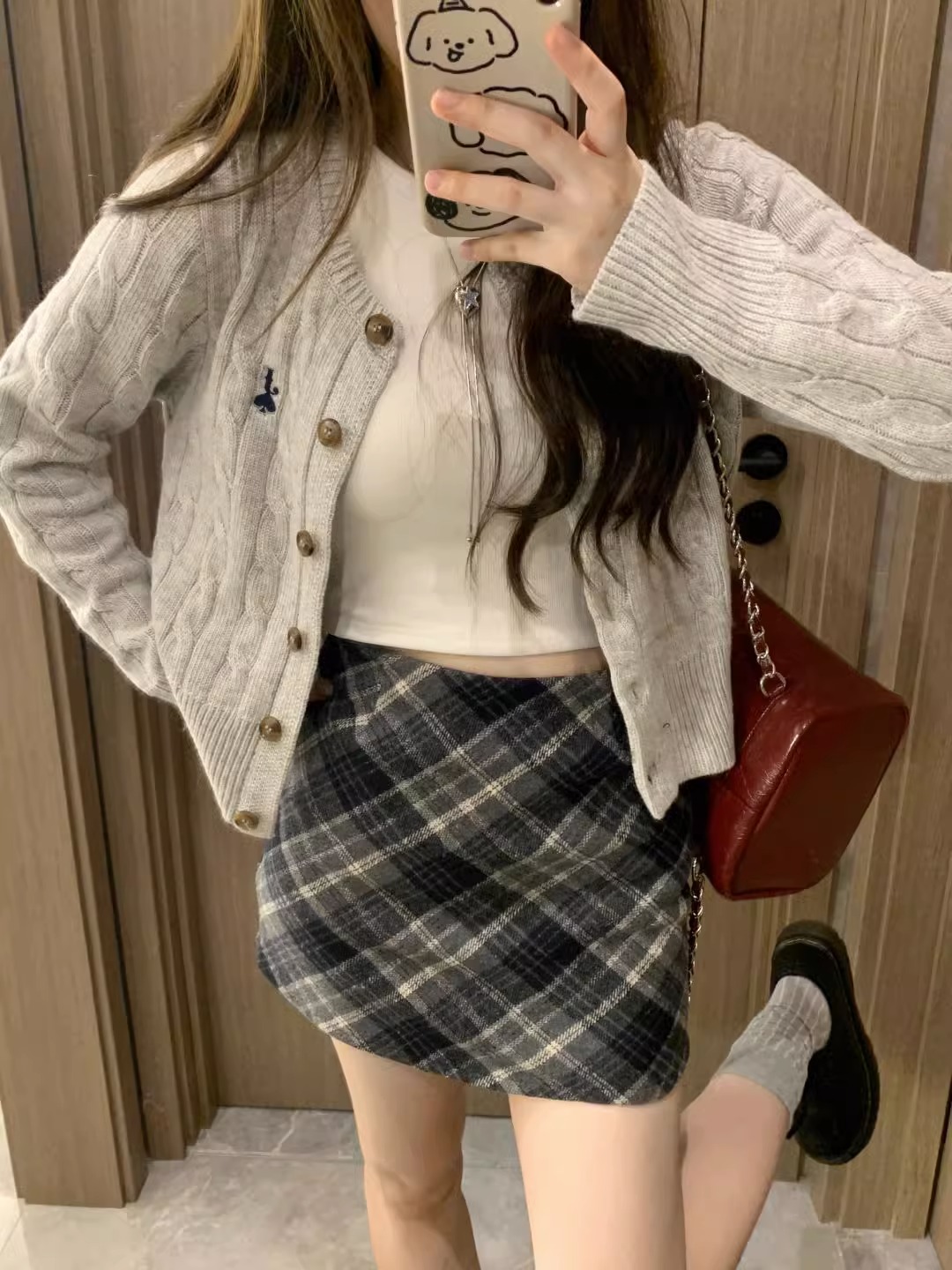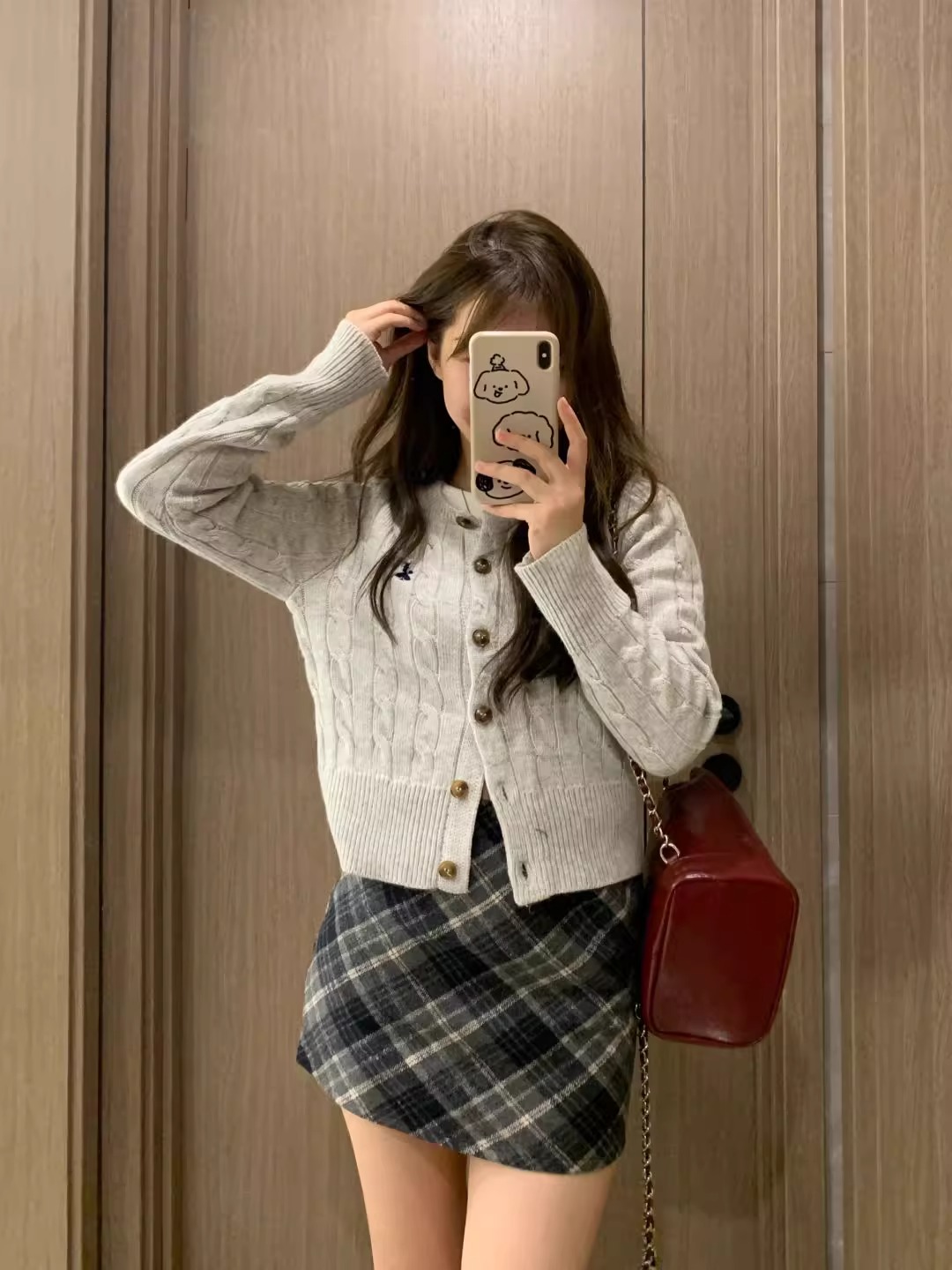 灰色新款韓系粗麻花刺綉針織開衫女2025春秋季學院風短款外套上衣