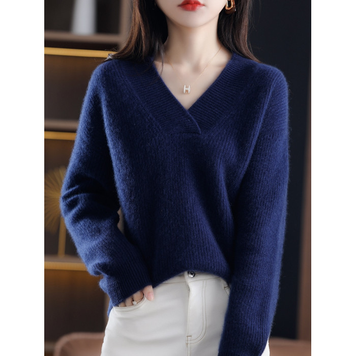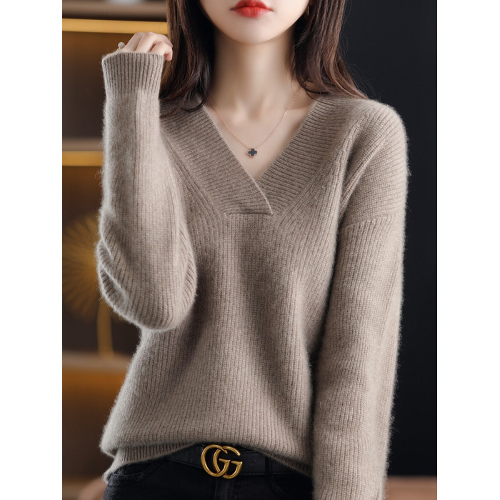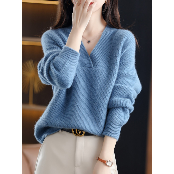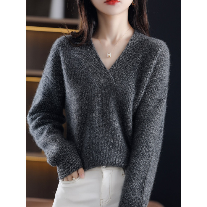 秋冬新款針織衫女寬松加厚V領毛衣韓版慵懶春秋純色套頭寬松上衣