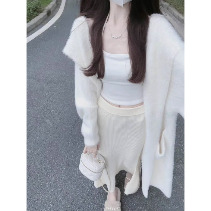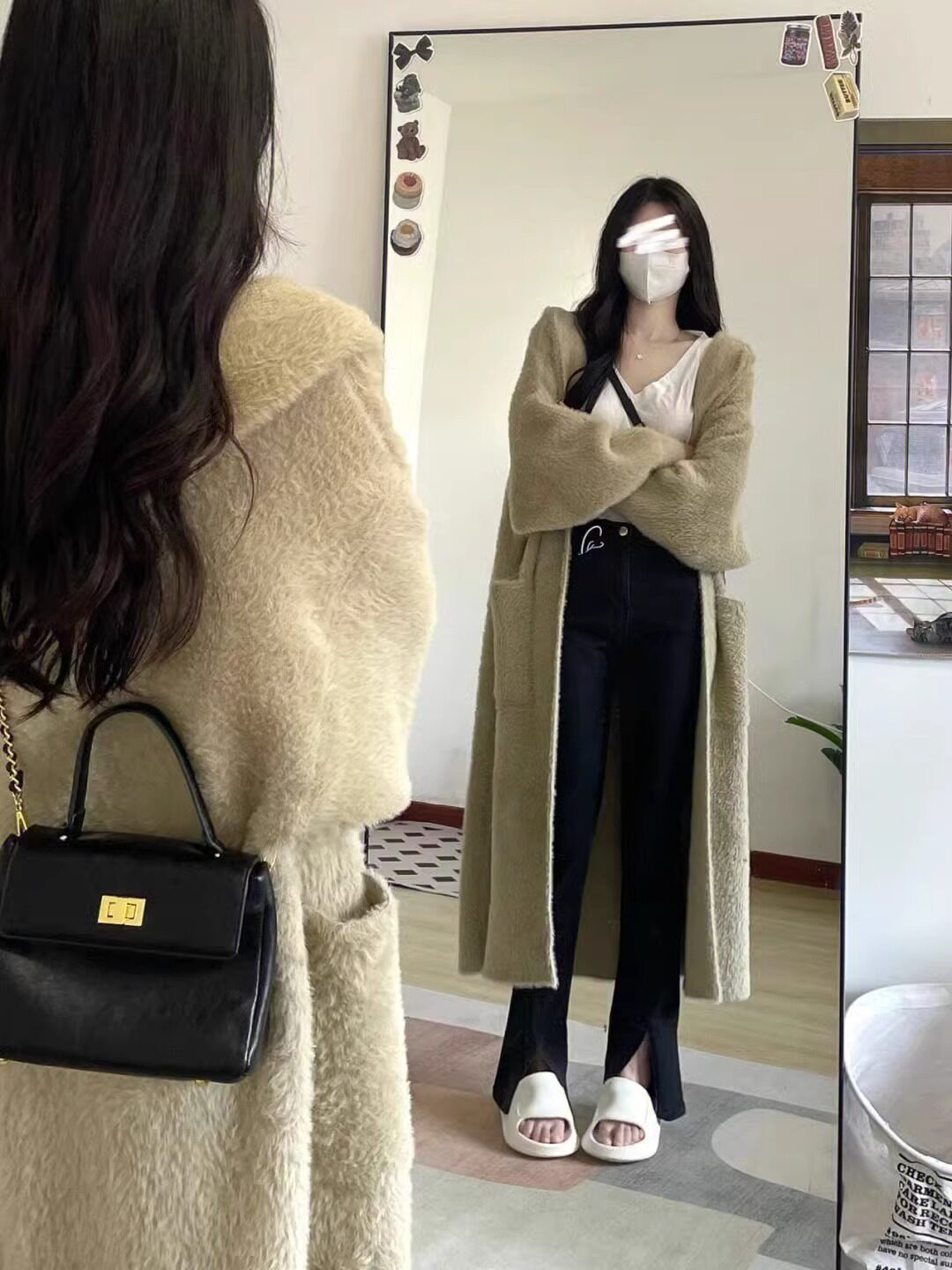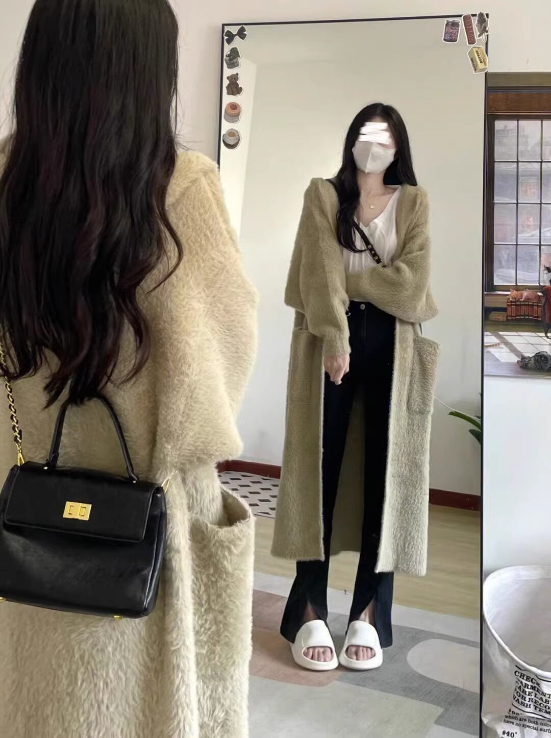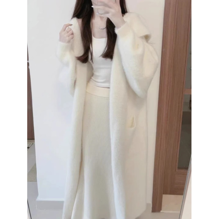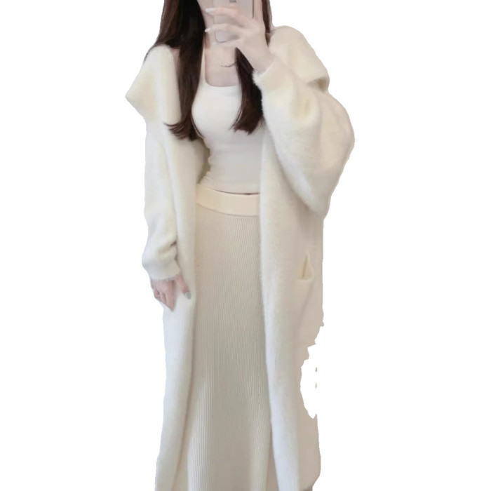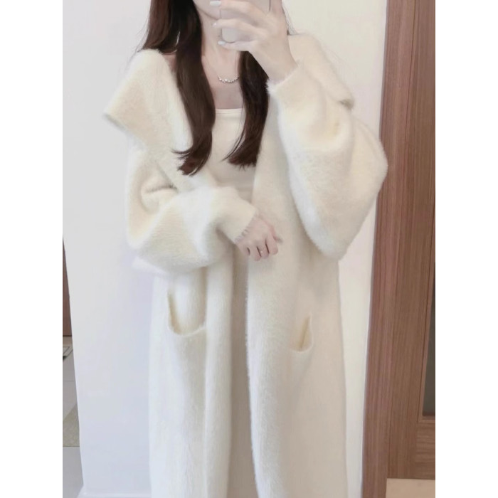 連帽大衣水貂絨毛衣開衫女秋冬慵懶風中長款過膝馬海毛針織衫外套