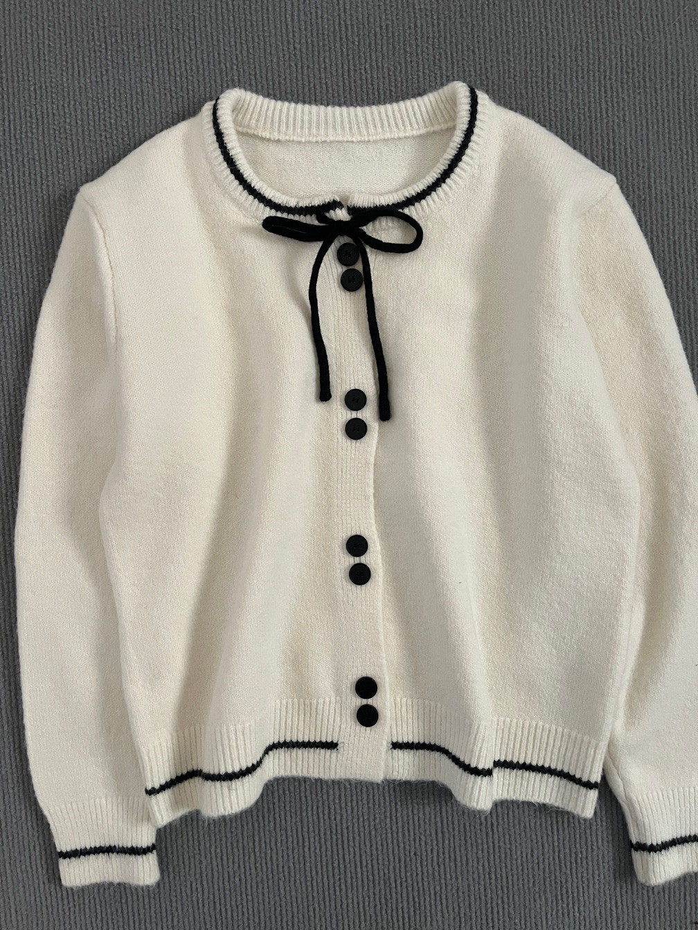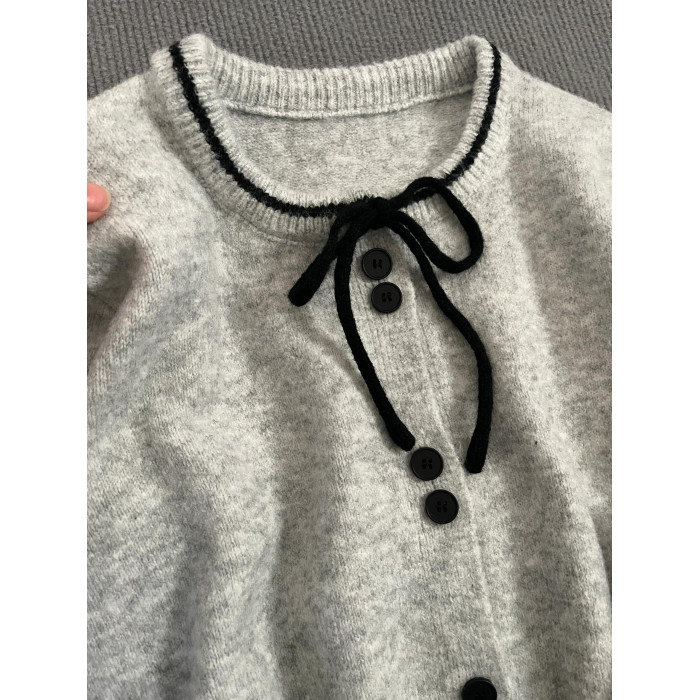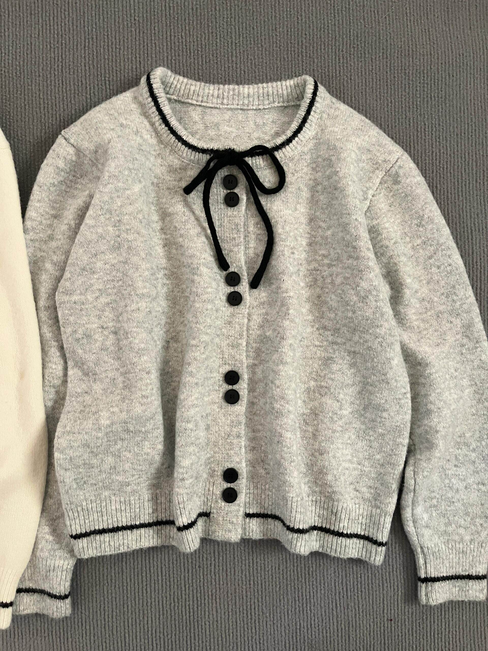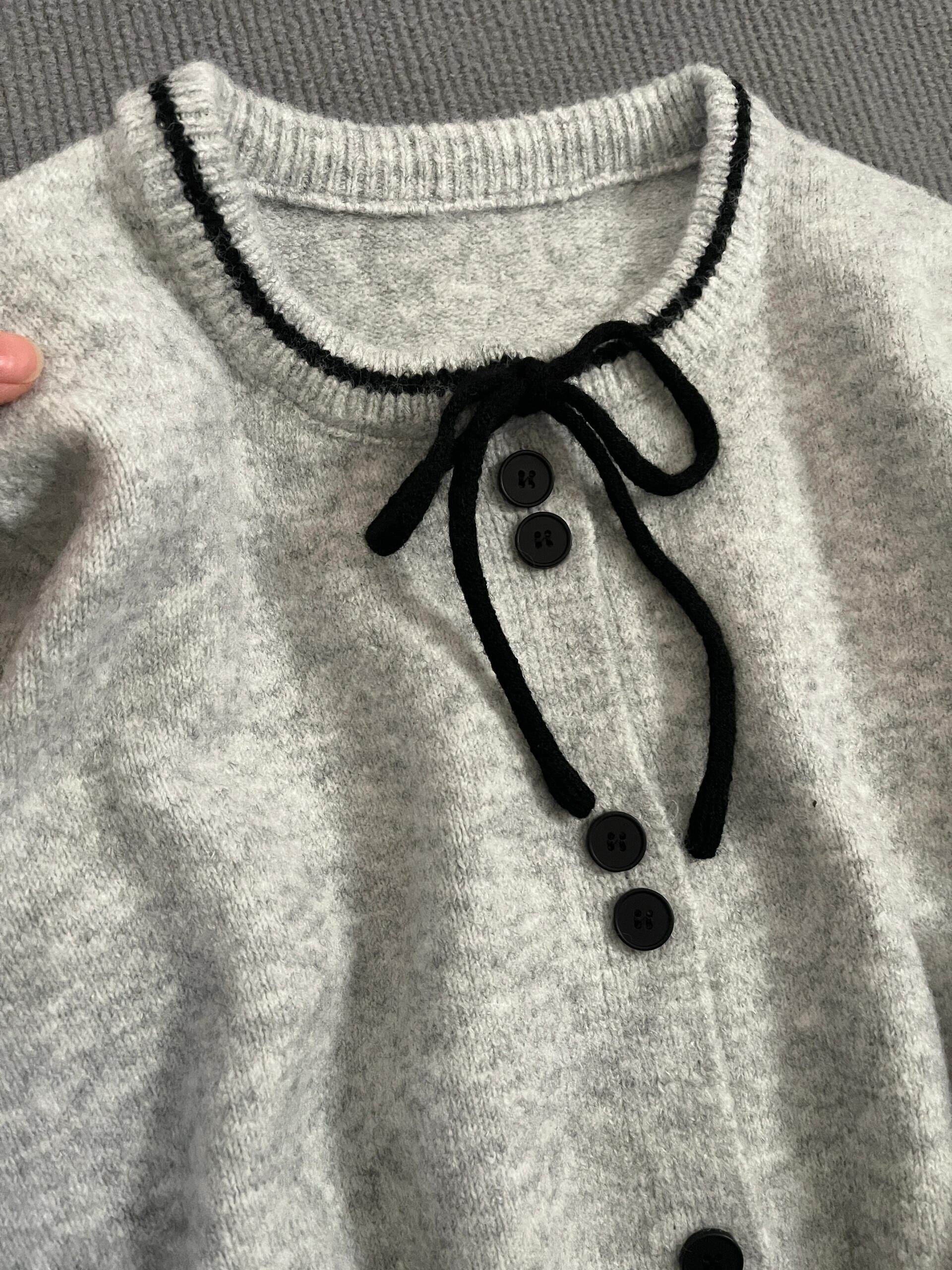 miu系溫柔蝴蝶結針織開衫女韓版簡約百搭圓領毛衣外套軟糯針織衫