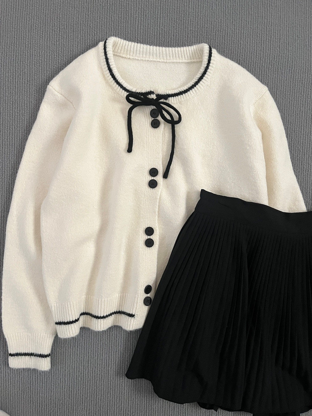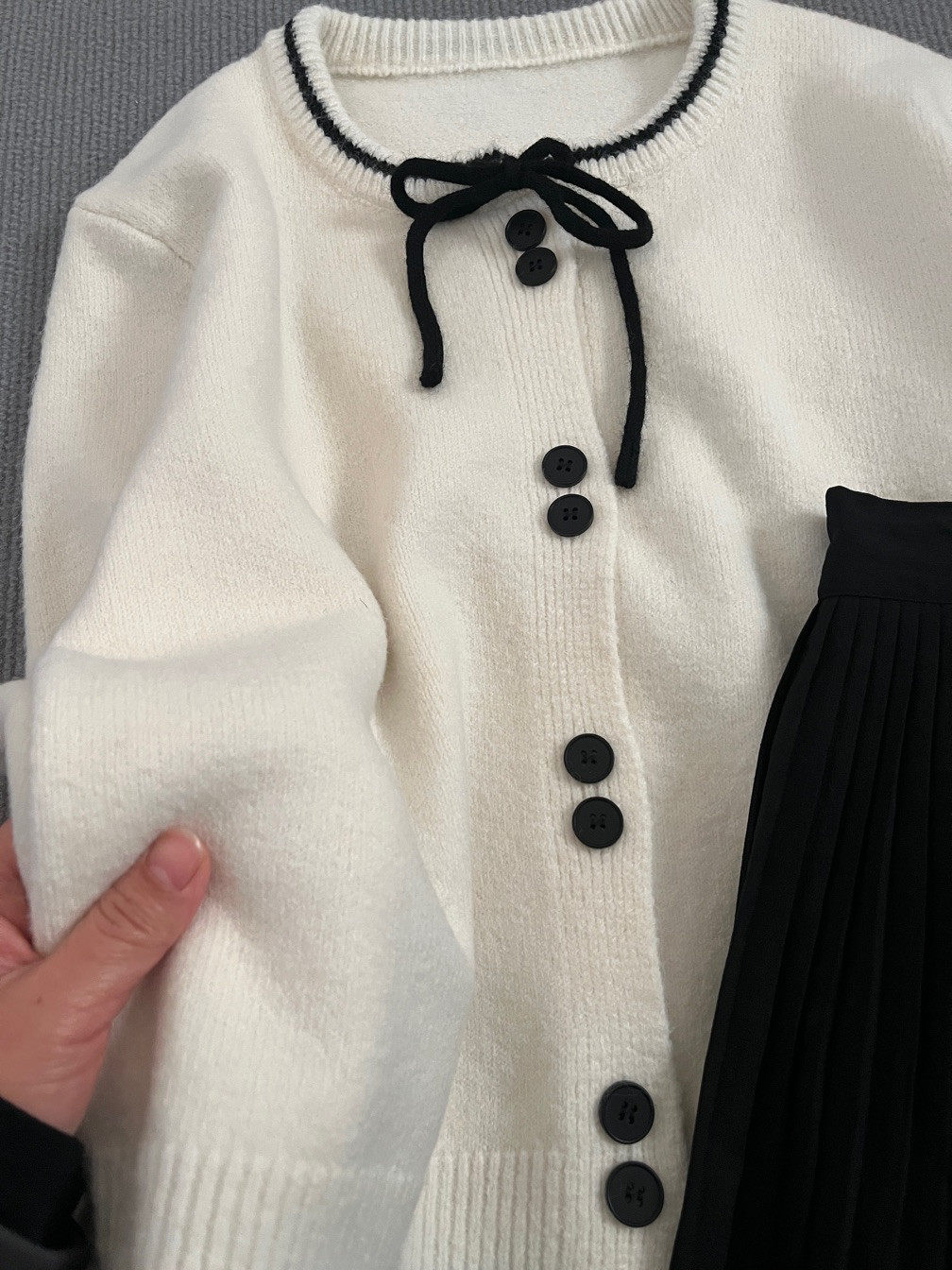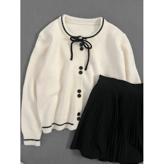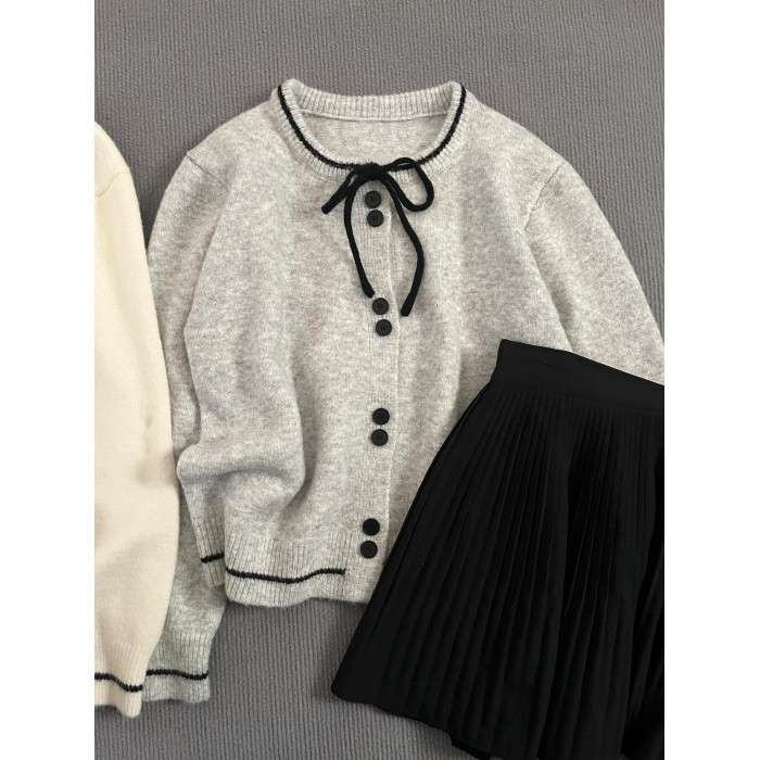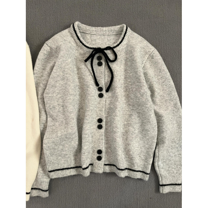 miu系溫柔蝴蝶結針織開衫女韓版簡約百搭圓領毛衣外套軟糯針織衫