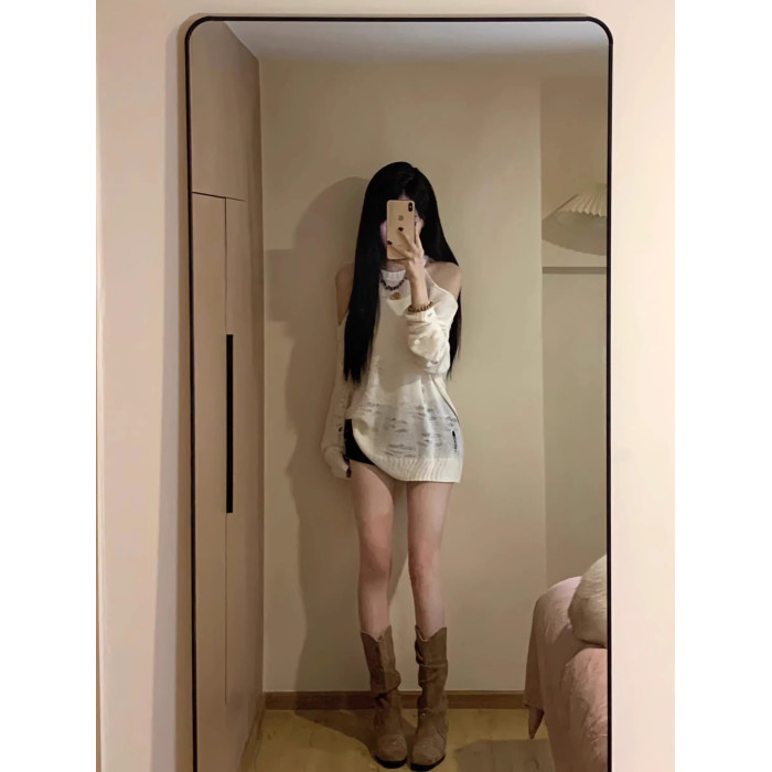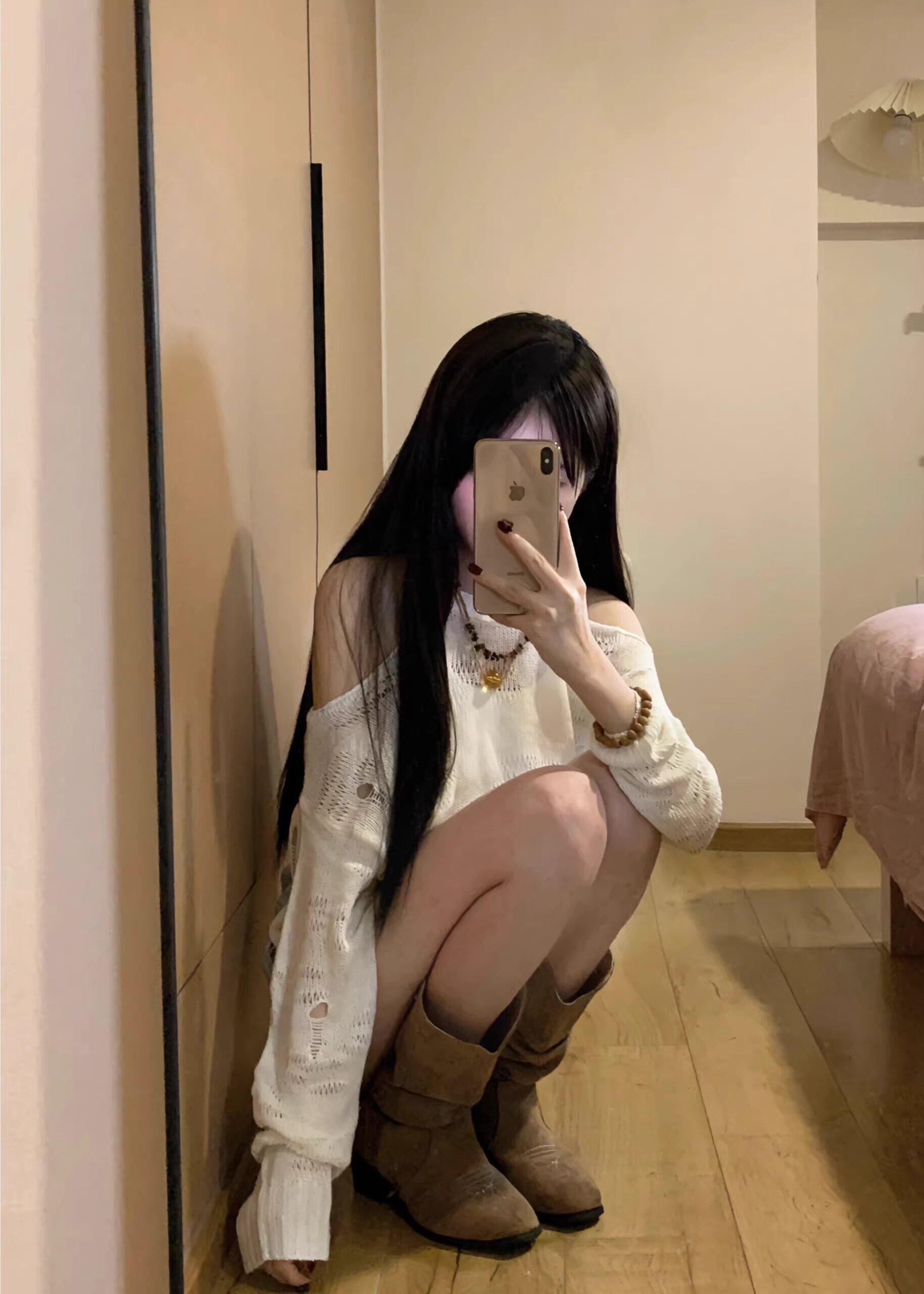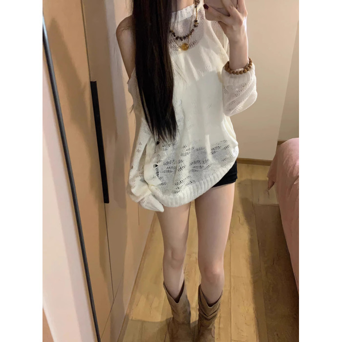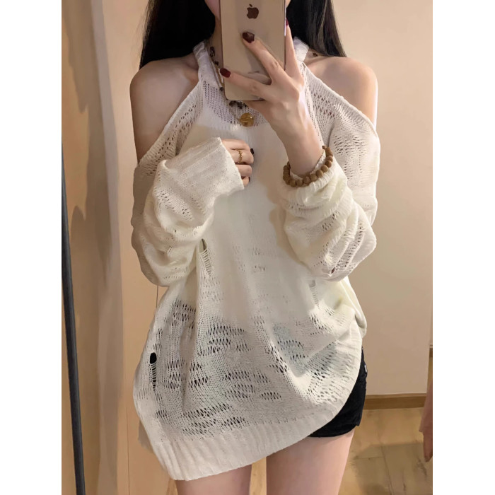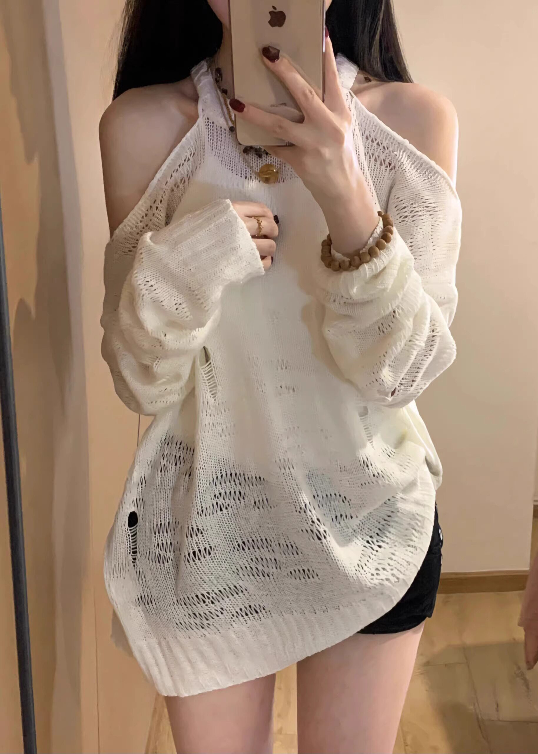美式辣妹白色長袖掛脖鏤空針織罩衫女2025春夏季寬松百搭防曬上衣
