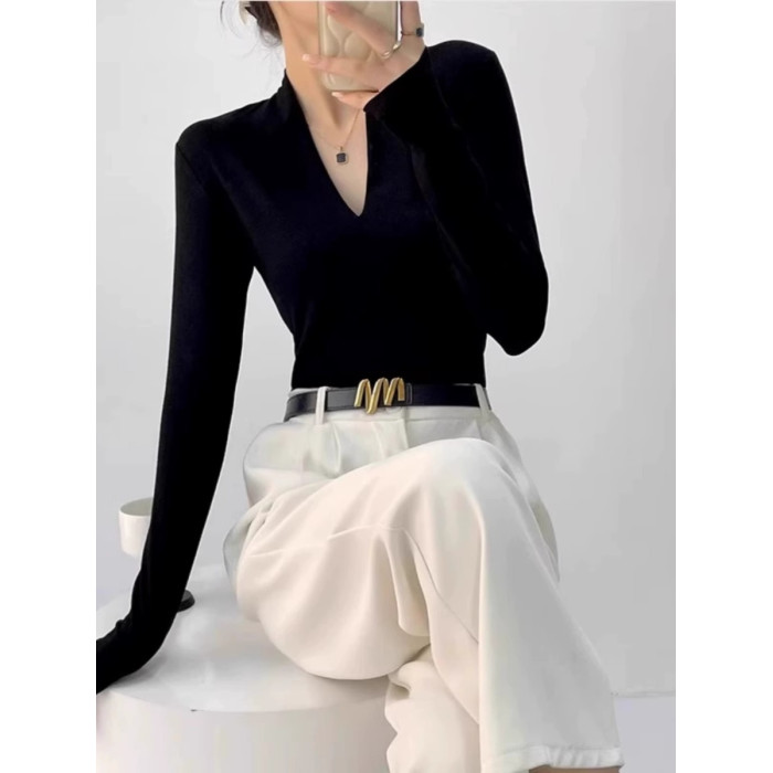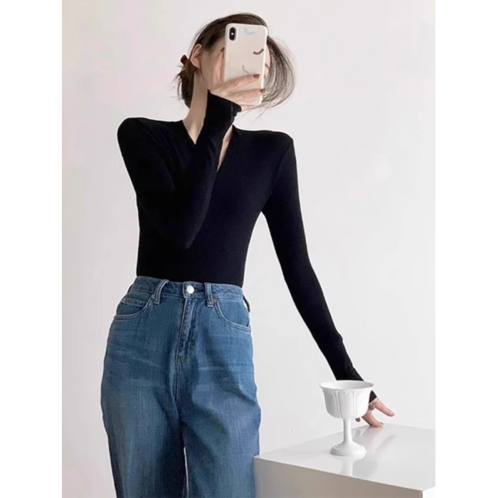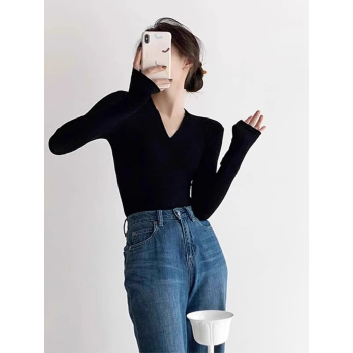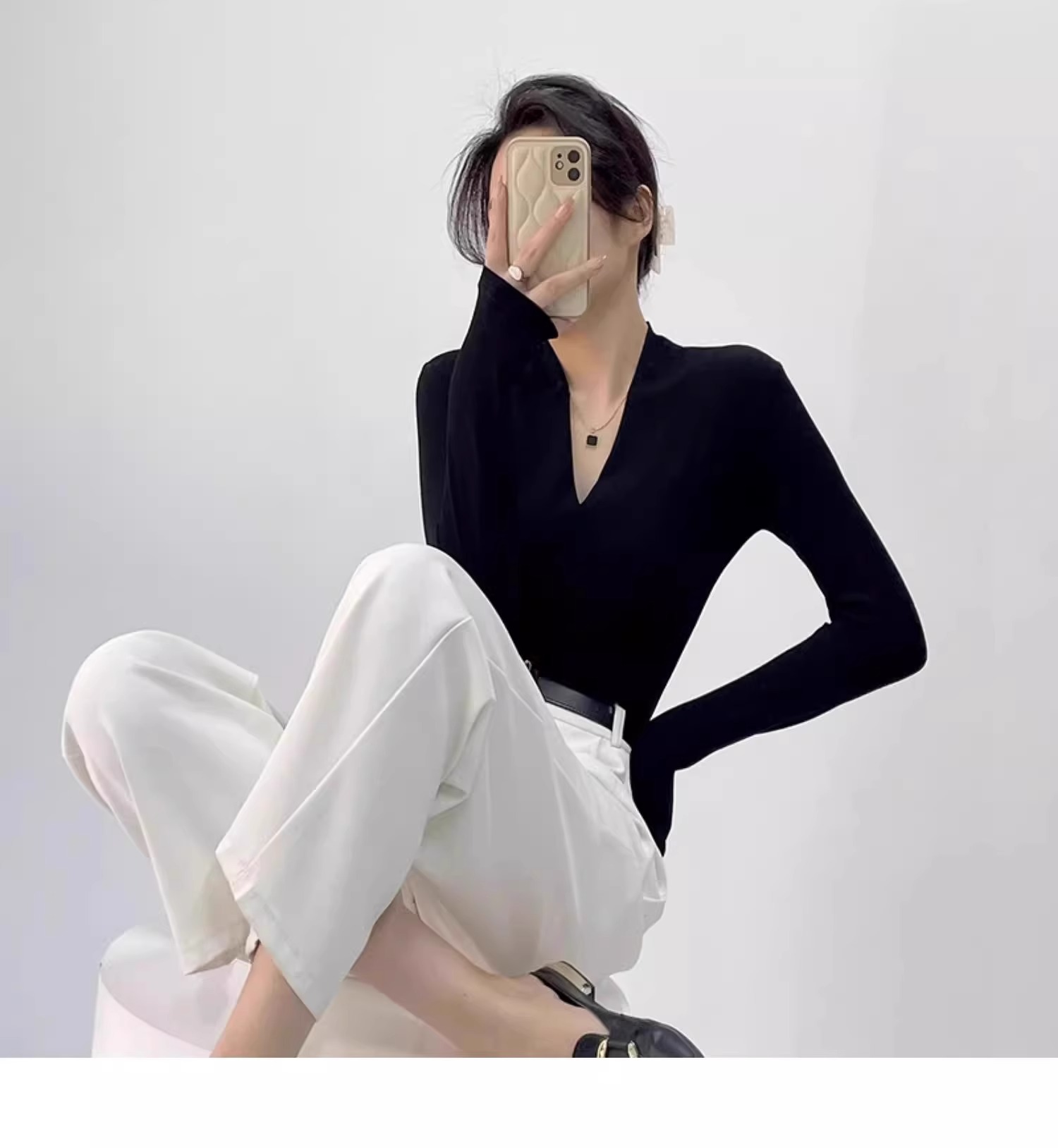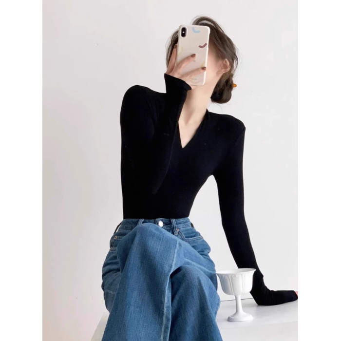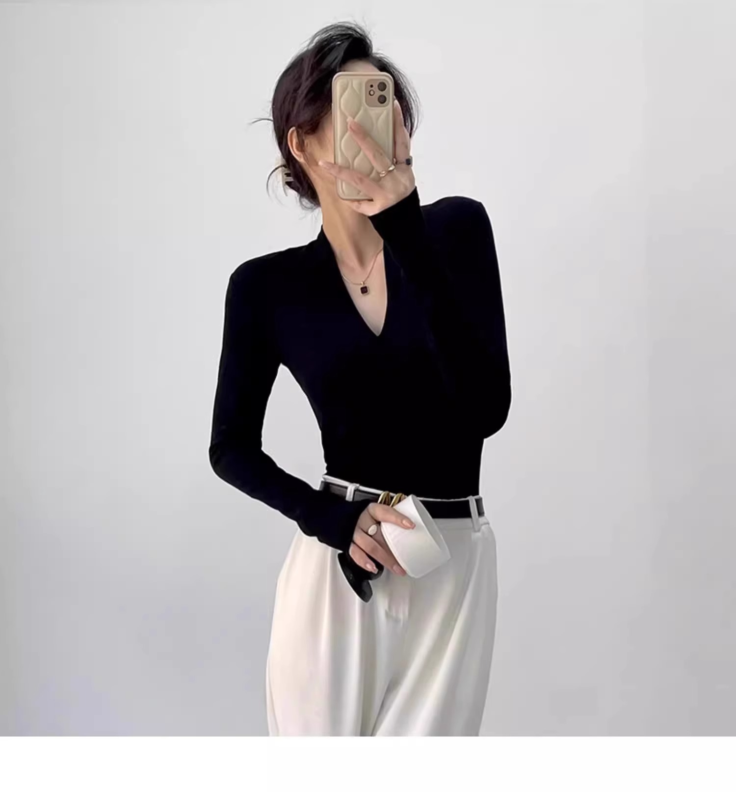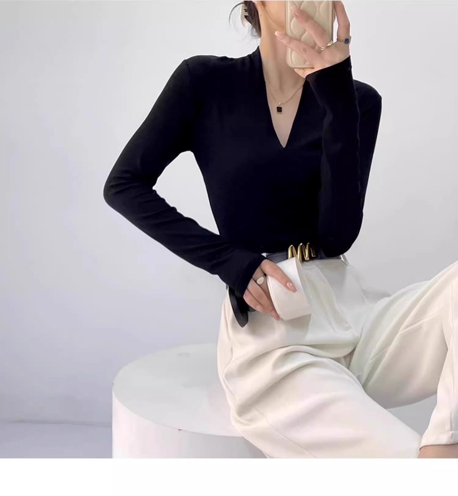 氣質性感V領針織衫長袖T恤春秋修身顯瘦上衣獨特別致內搭打底衫女