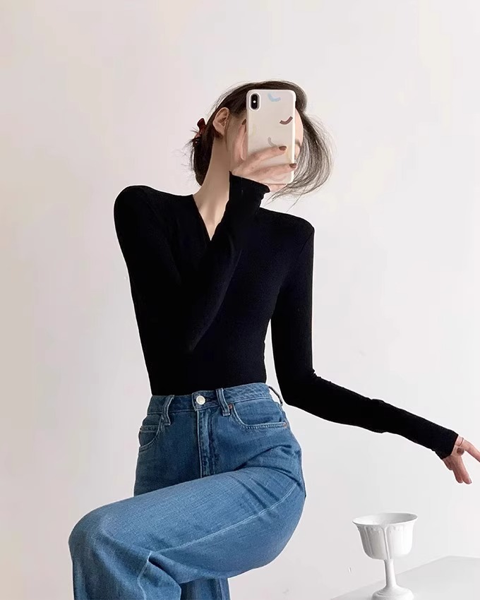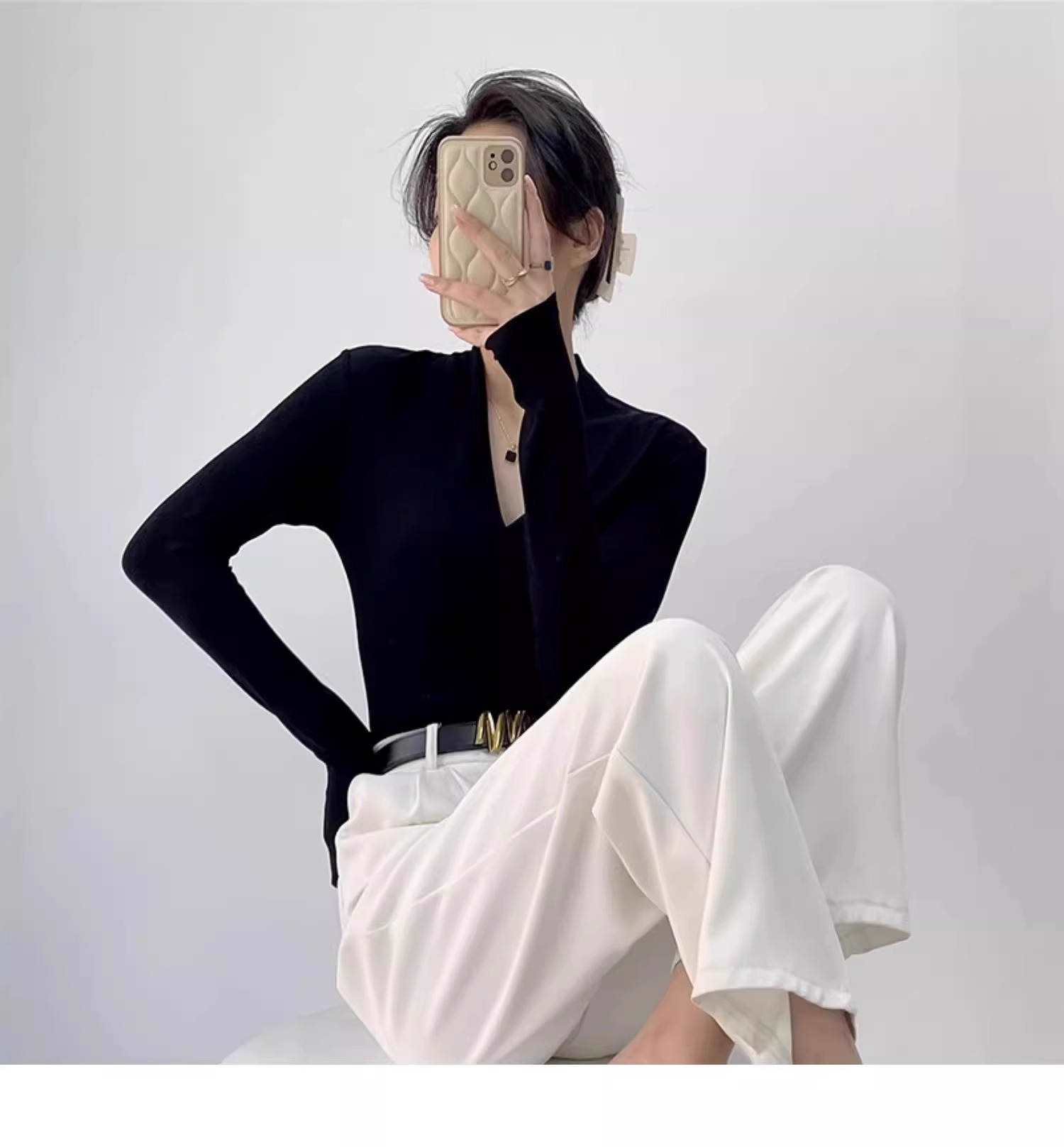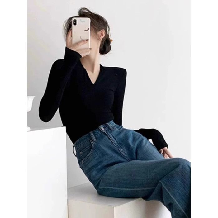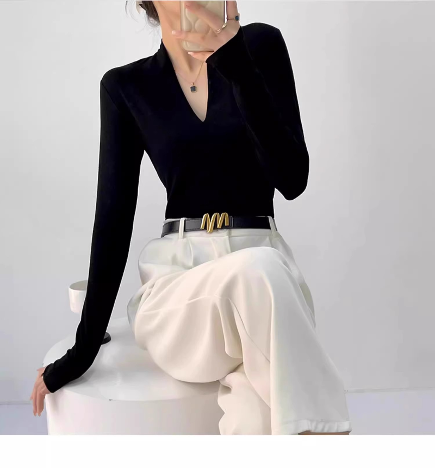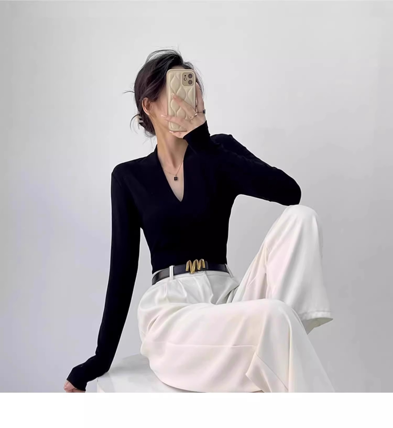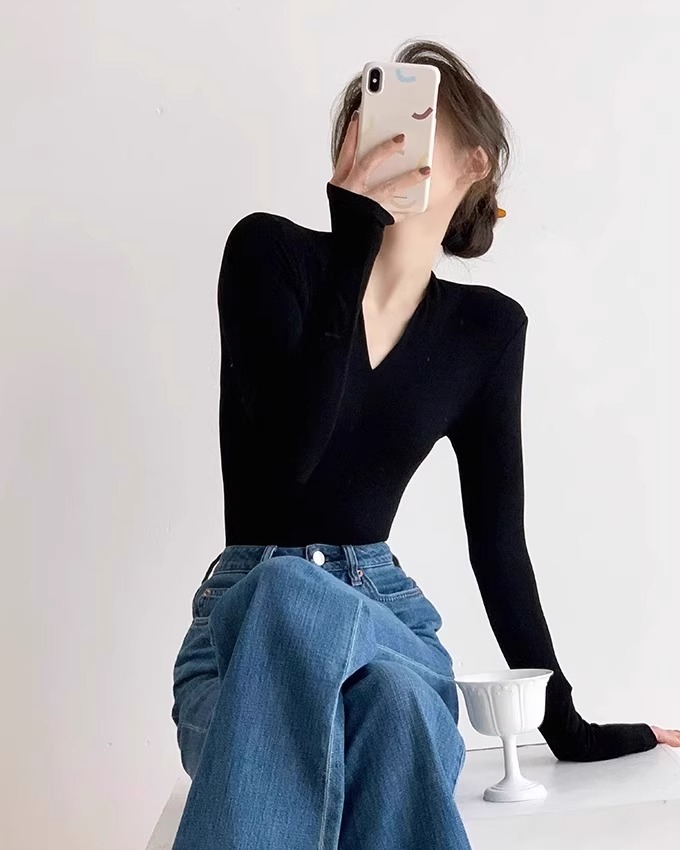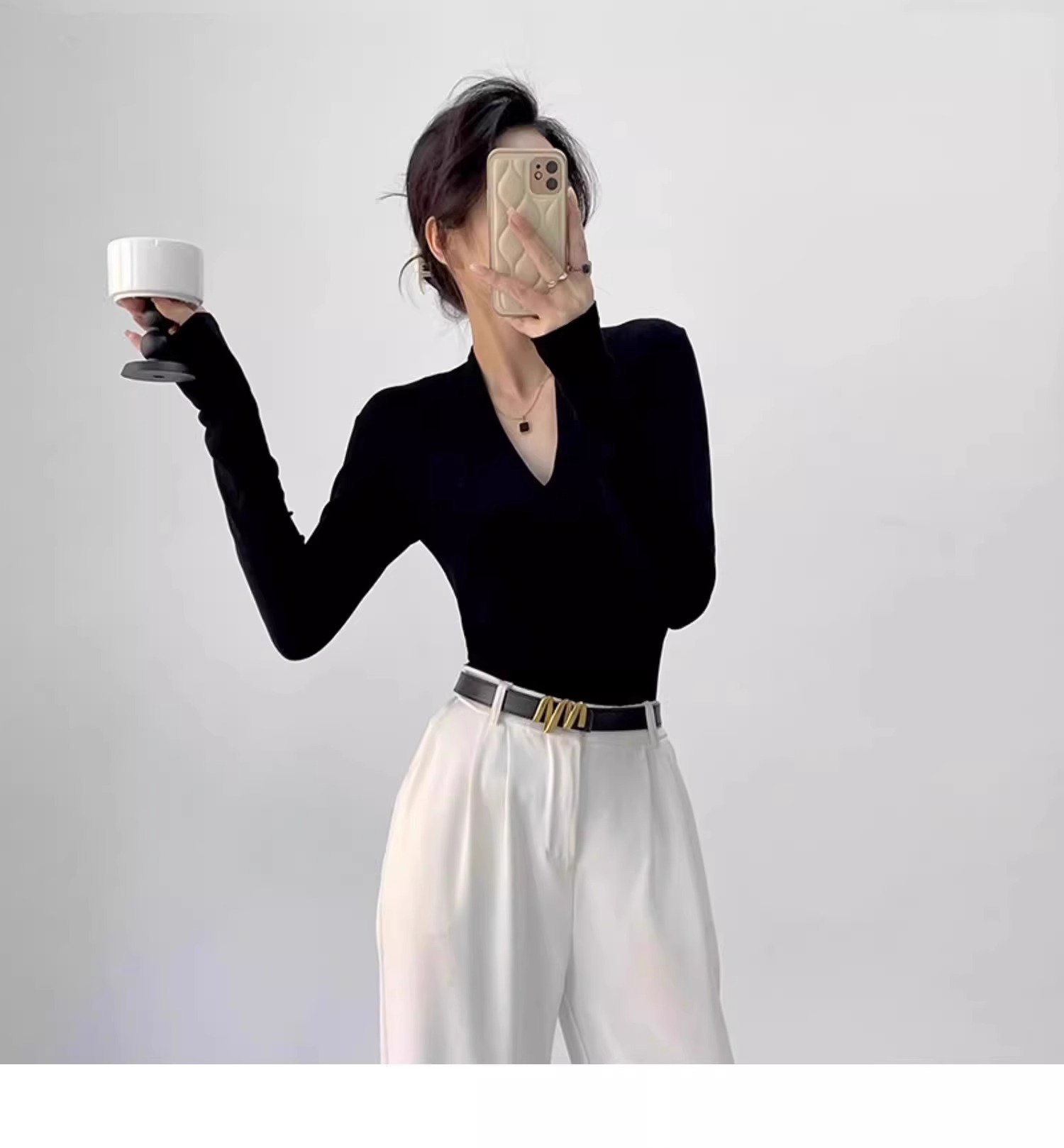 氣質性感V領針織衫長袖T恤春秋修身顯瘦上衣獨特別致內搭打底衫女