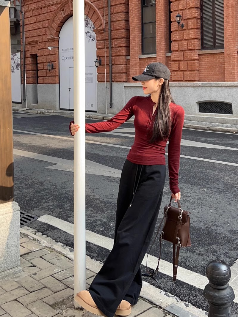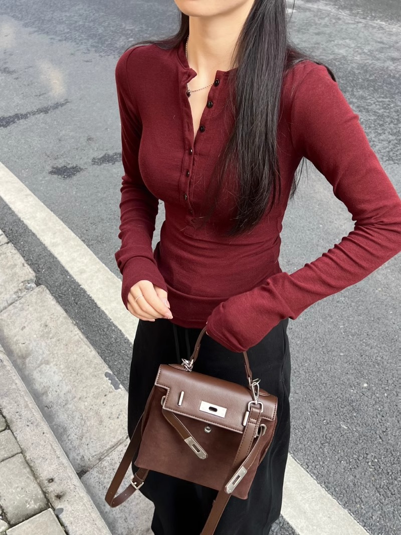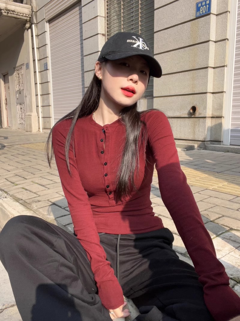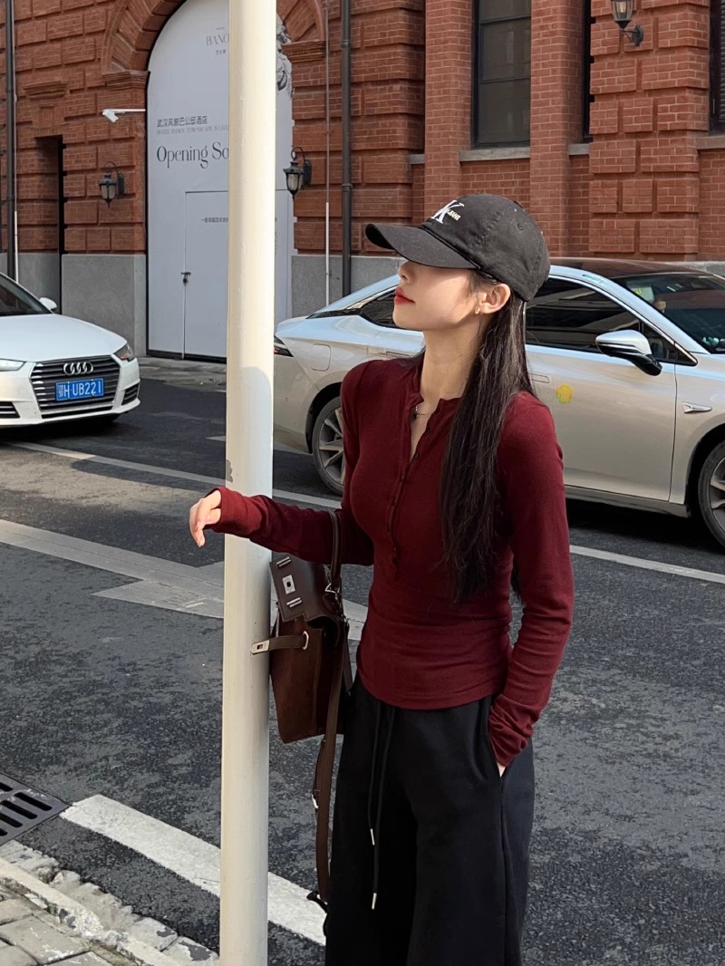 辣妹半開領紅色顯白緊身正肩T恤女內搭打底衫修身上衣V領顯瘦長袖