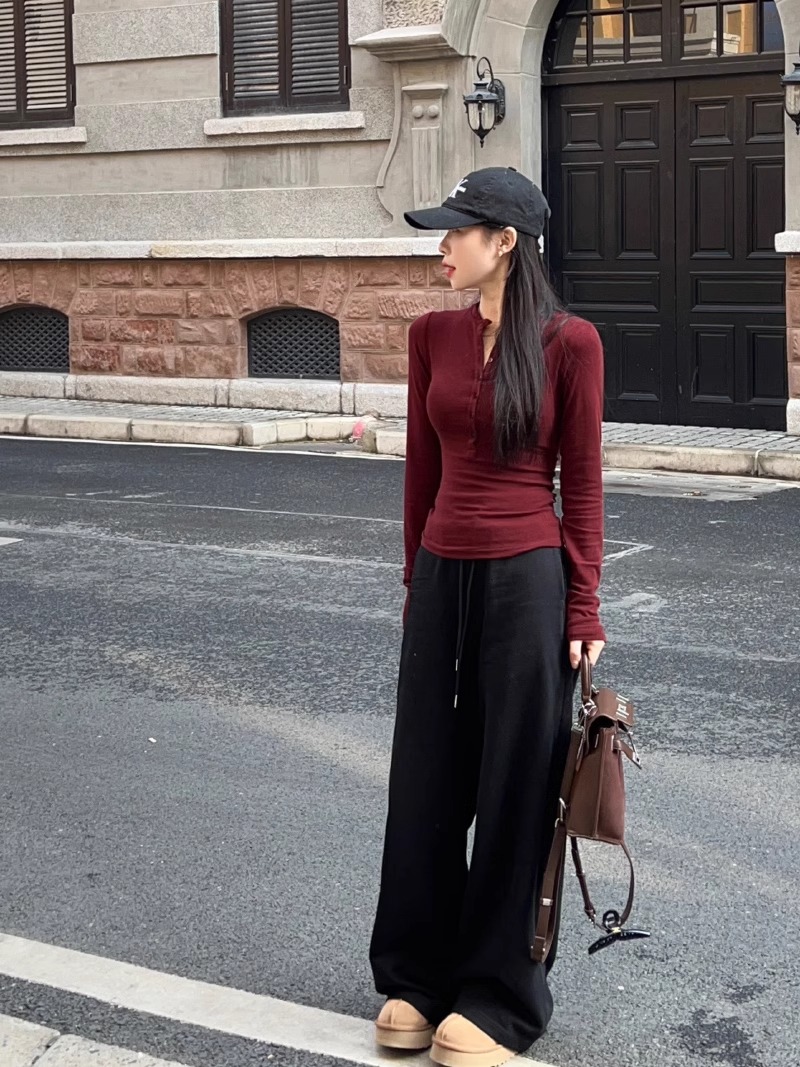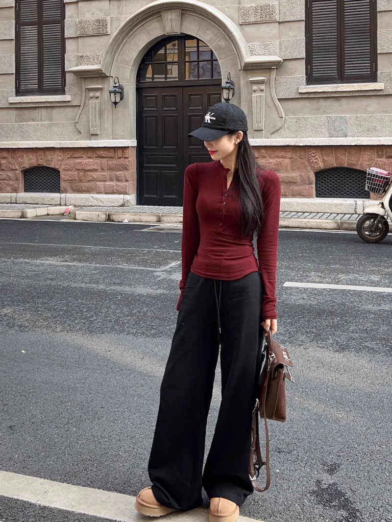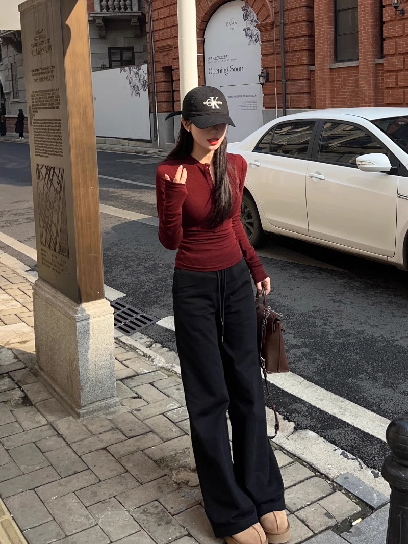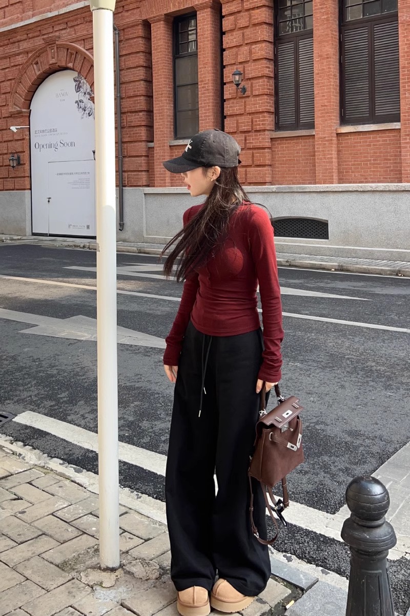 辣妹半開領紅色顯白緊身正肩T恤女內搭打底衫修身上衣V領顯瘦長袖