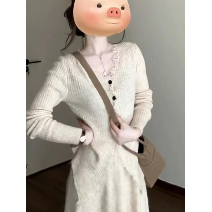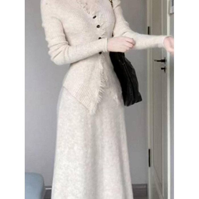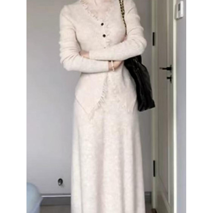 兩件套設計感v領流蘇單排釦修身針織開衫半身長裙套裝氣質女秋冬