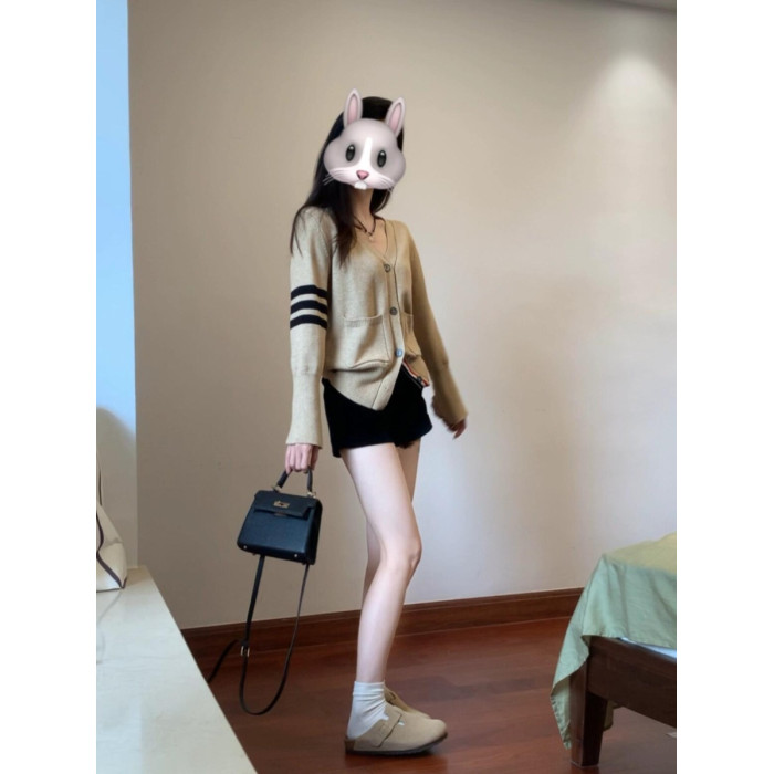 撞色V領軟糯毛衣開衫女2025春秋季新款慵懶學院風針織衫外套上衣