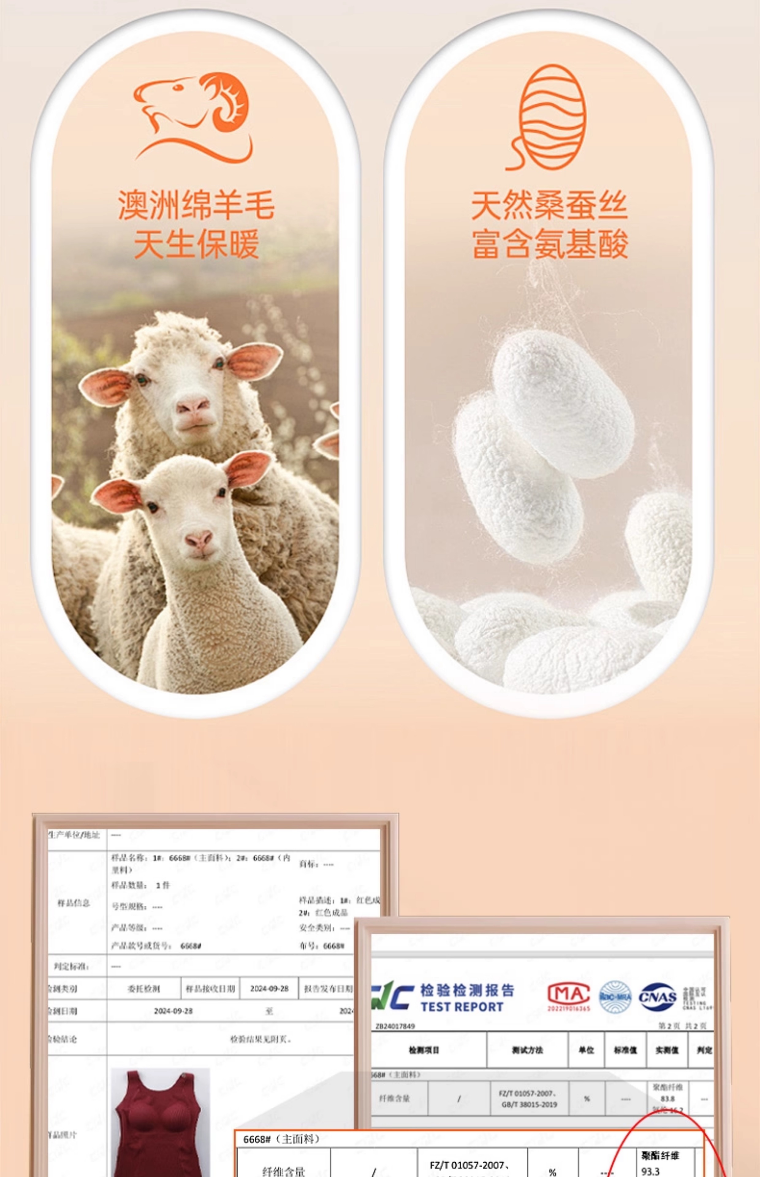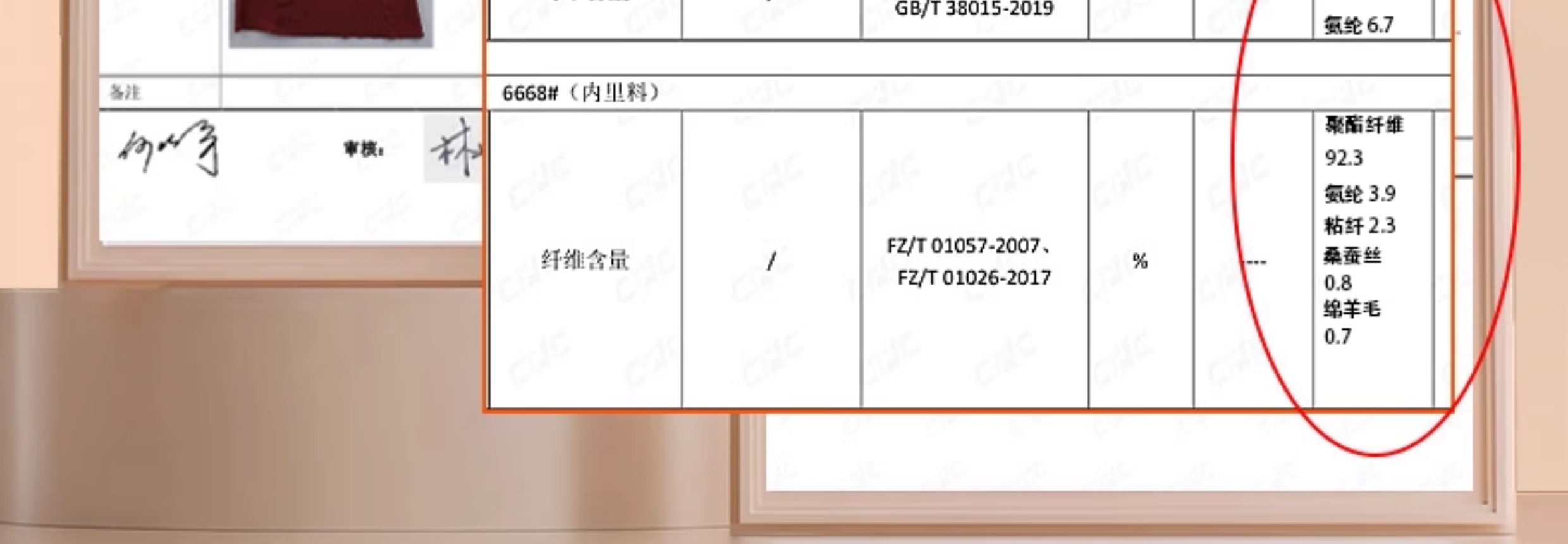 | 裡料材質成分 | 聚酯纖維82% 聚氨酯彈性纖維(氨綸)8% 粘膠纖維(粘纖)4% 聚丙烯腈纖維(腈綸)3% 綿羊毛1.5% 桑蠶絲1.5% |