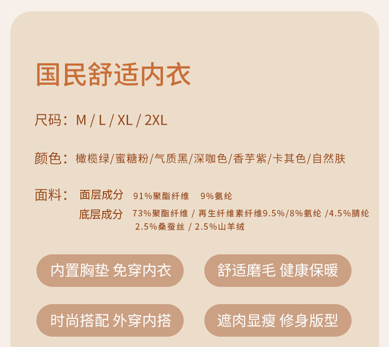 裡料材質成分 聚酯纖維73% 再生纖維素纖維9.5% 聚氨酯彈性纖維(氨綸)8% 聚丙烯腈纖維(腈綸)4.5% 桑蠶絲2.5% 山羊羢(羊羢)2.5%