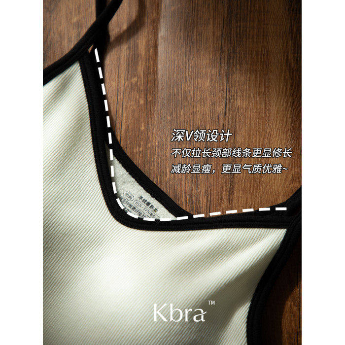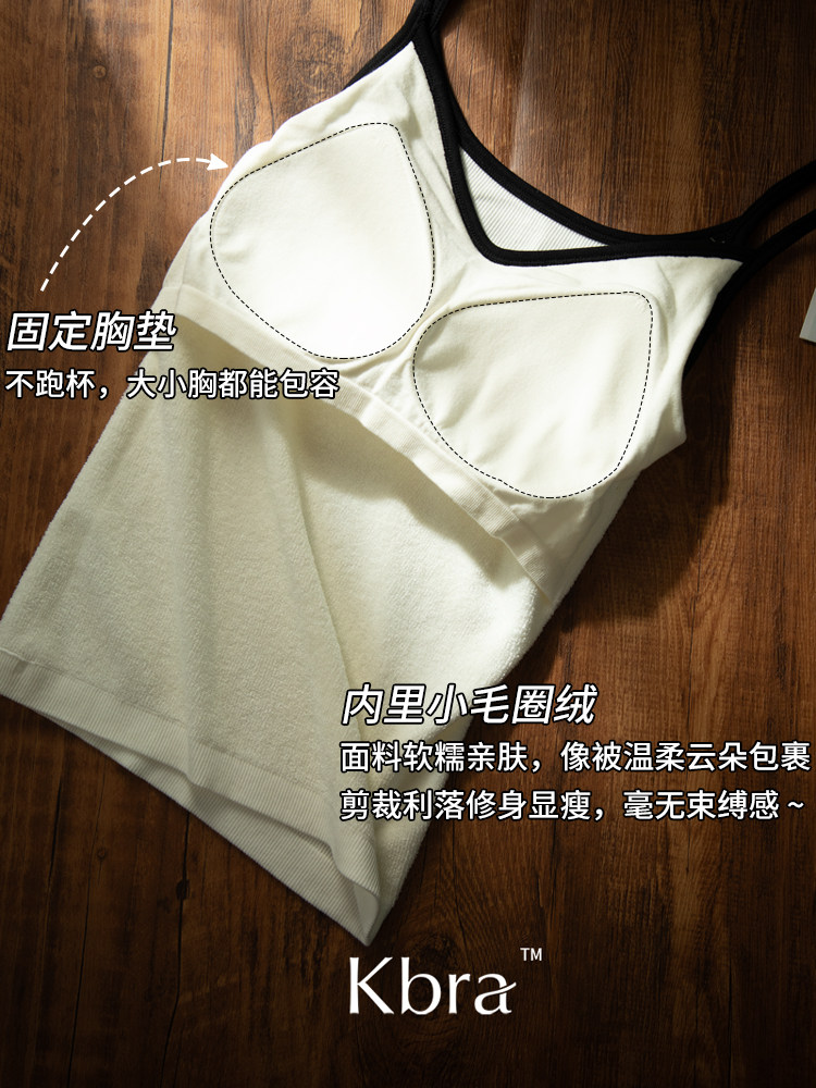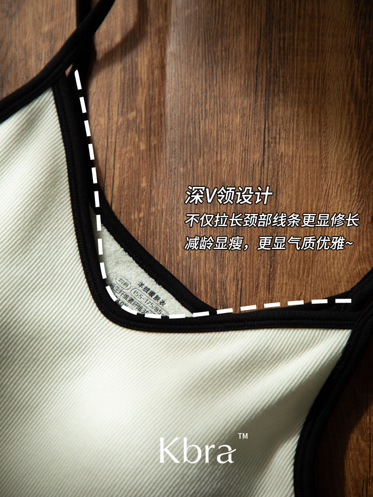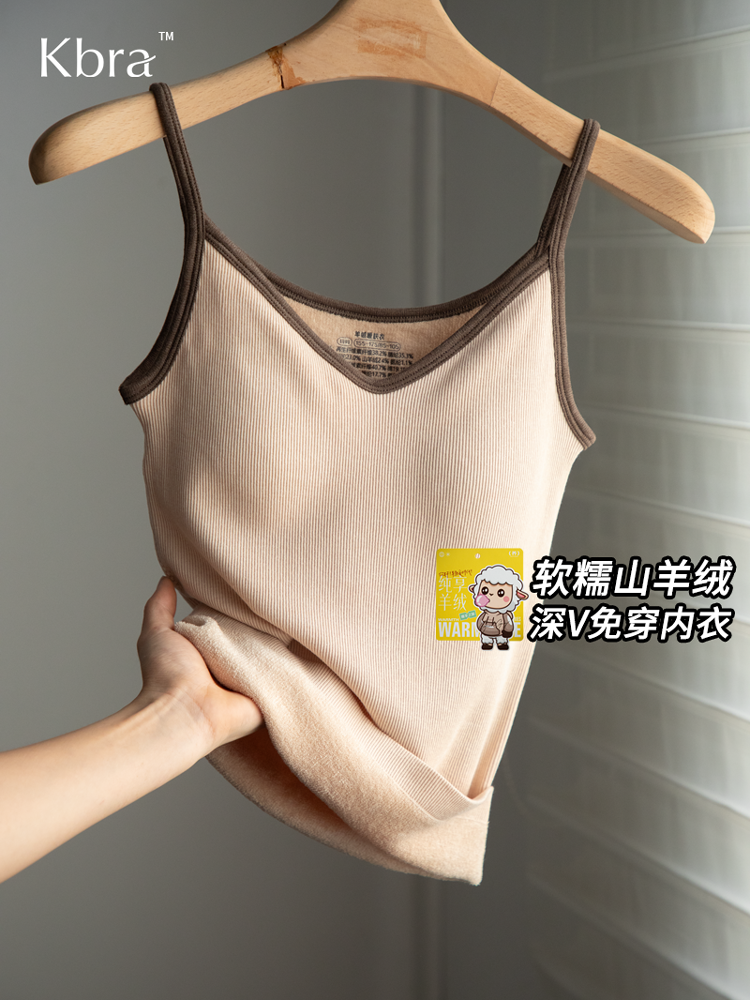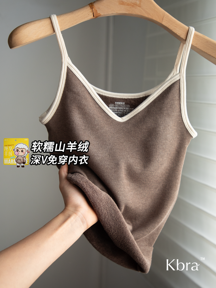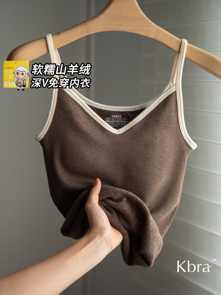 Kbra山羊絨深V保暖背心女士雅單風秋冬季加絨內搭帶胸墊吊帶上衣