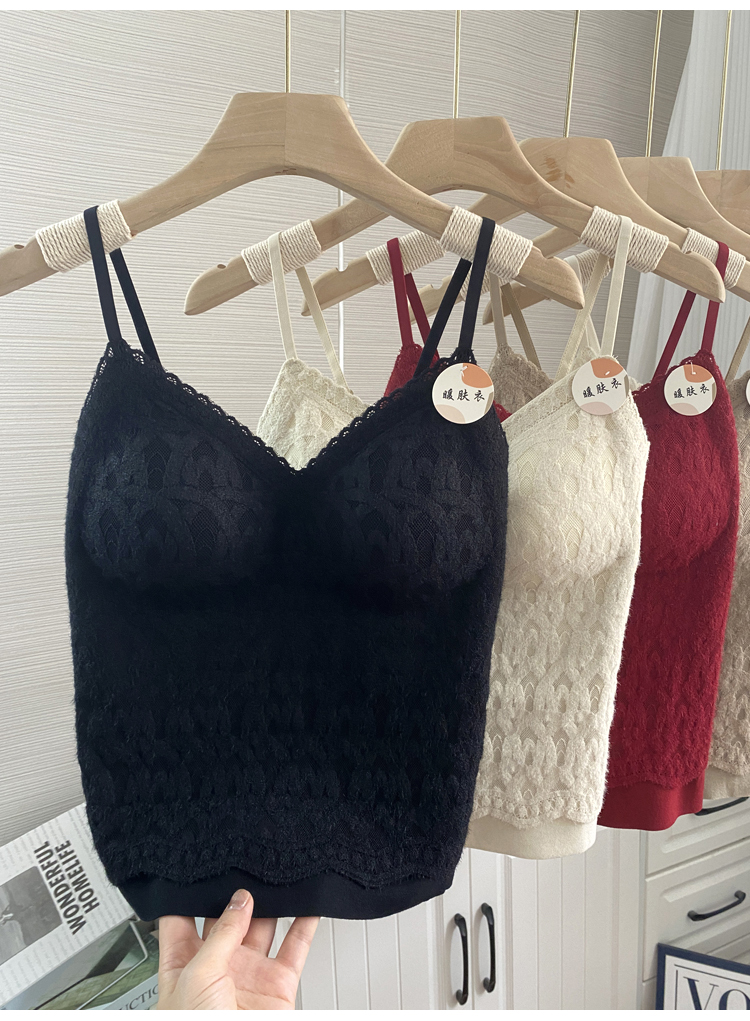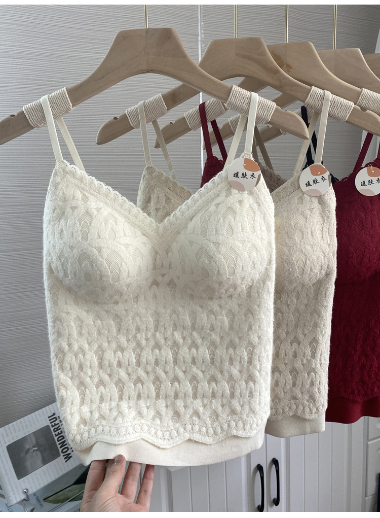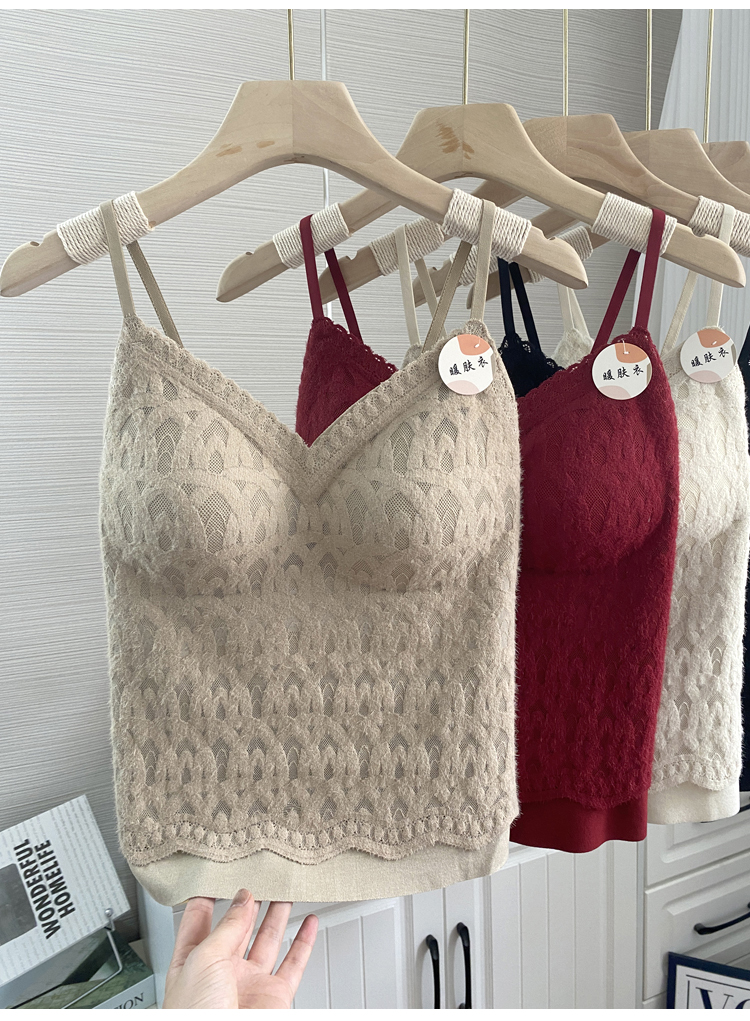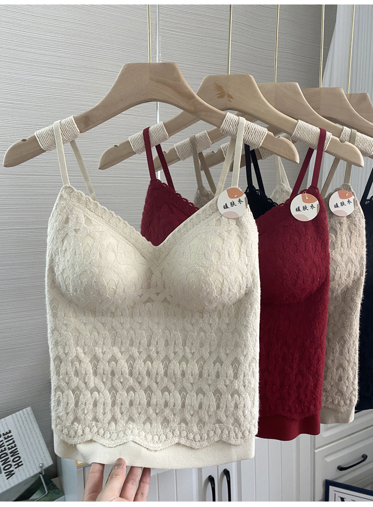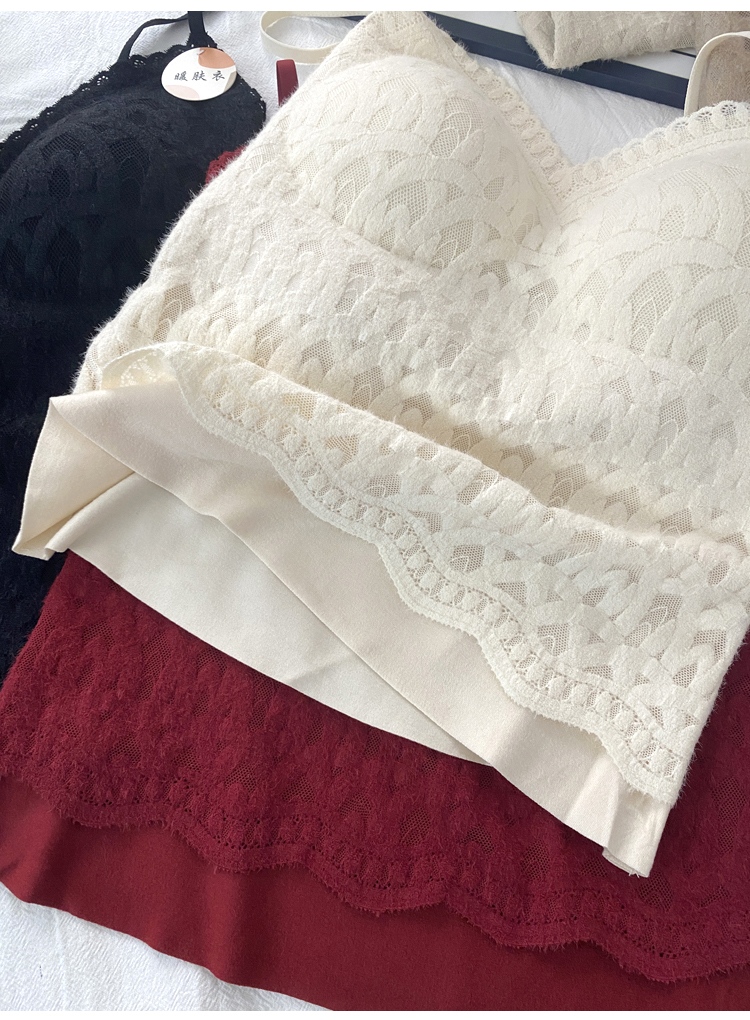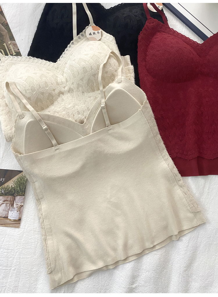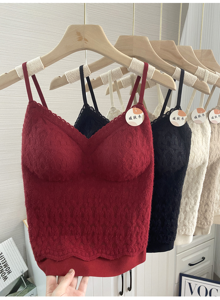 法式純欲蕾絲美背內搭秋冬保暖安可拉紅磨毛帶胸墊吊帶背心女打底