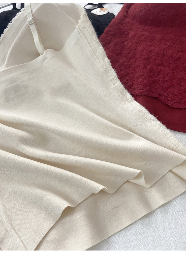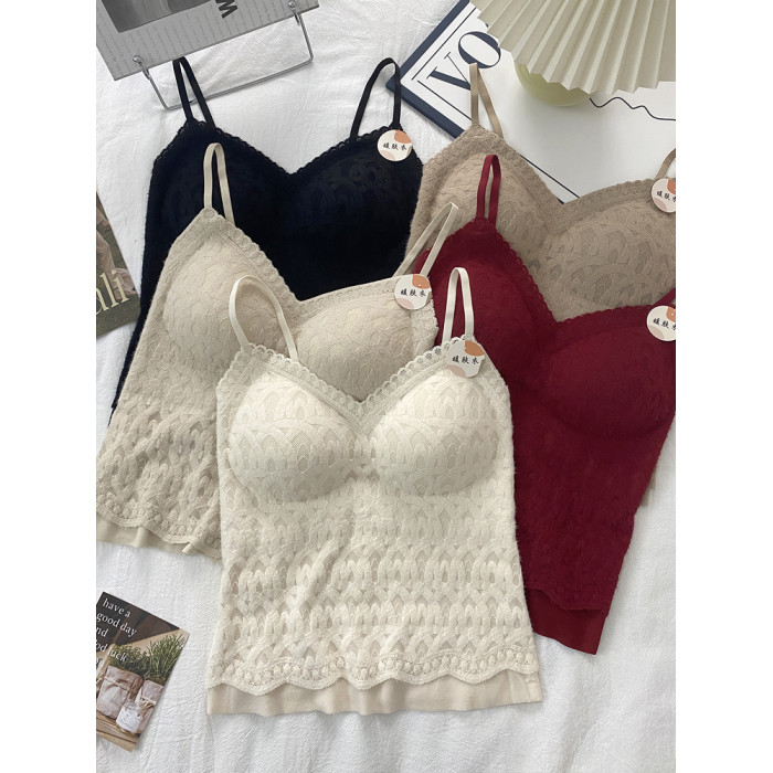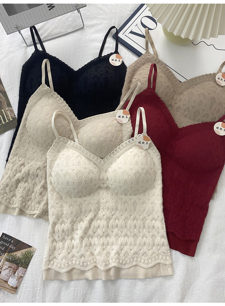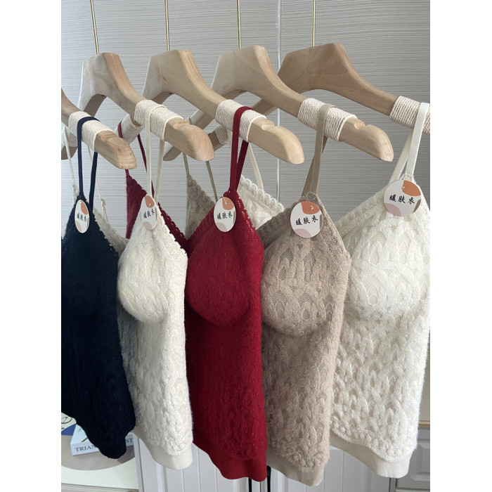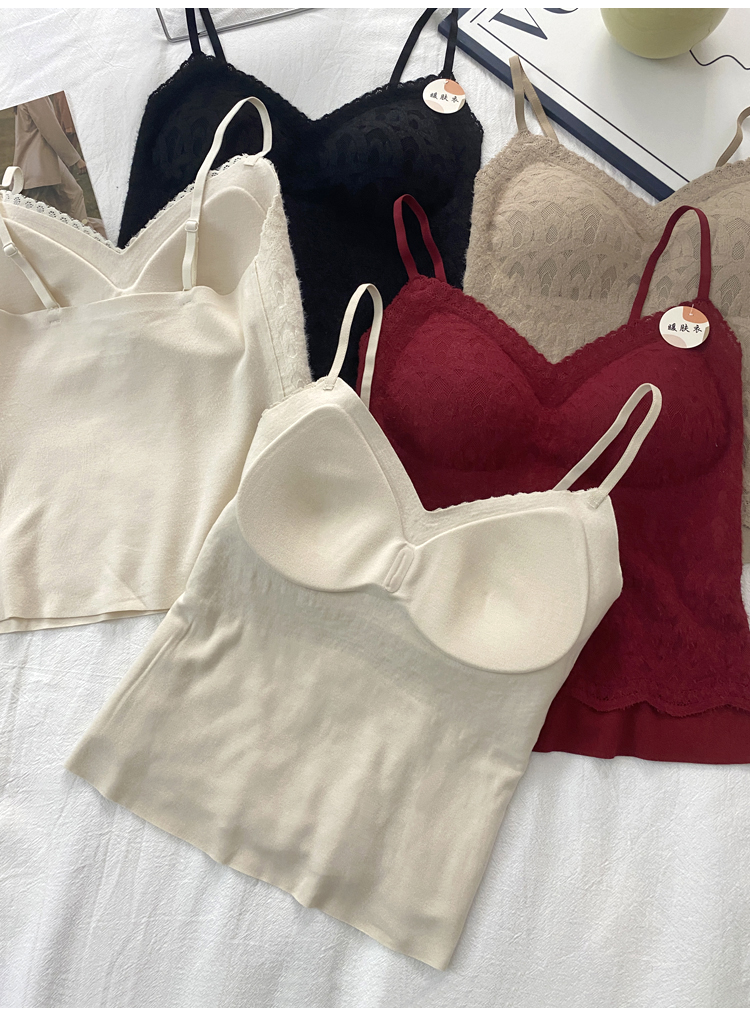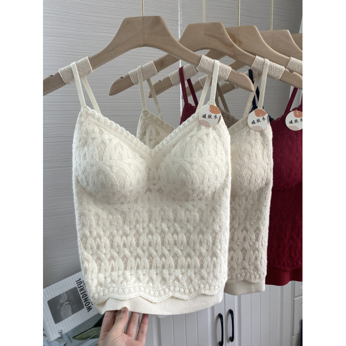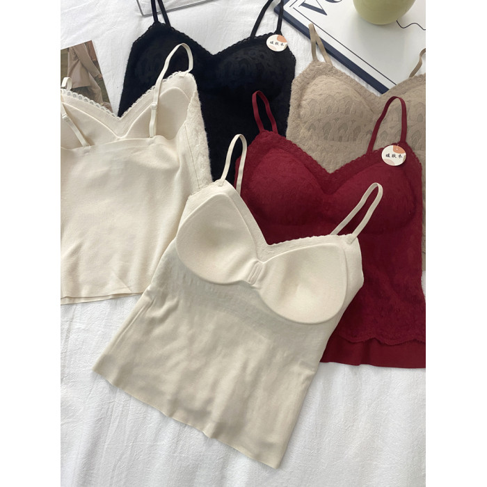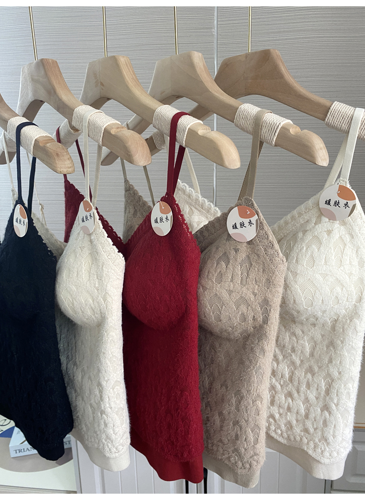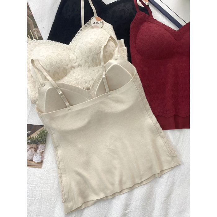 法式純欲蕾絲美背內搭秋冬保暖安可拉紅磨毛帶胸墊吊帶背心女打底