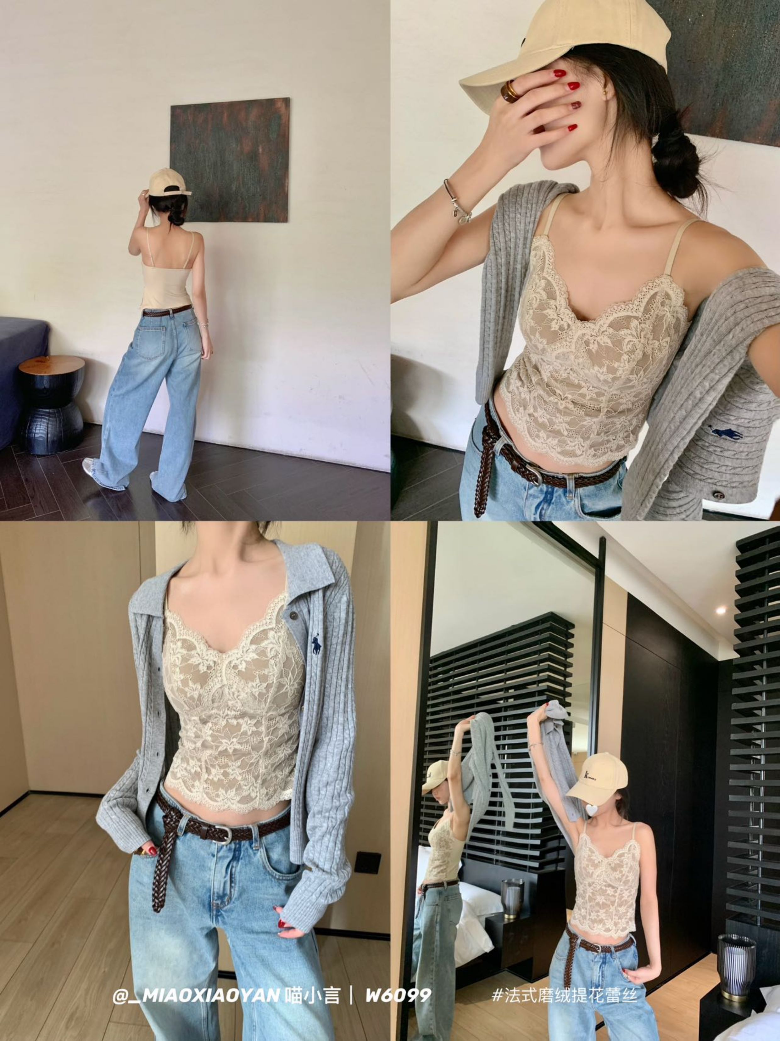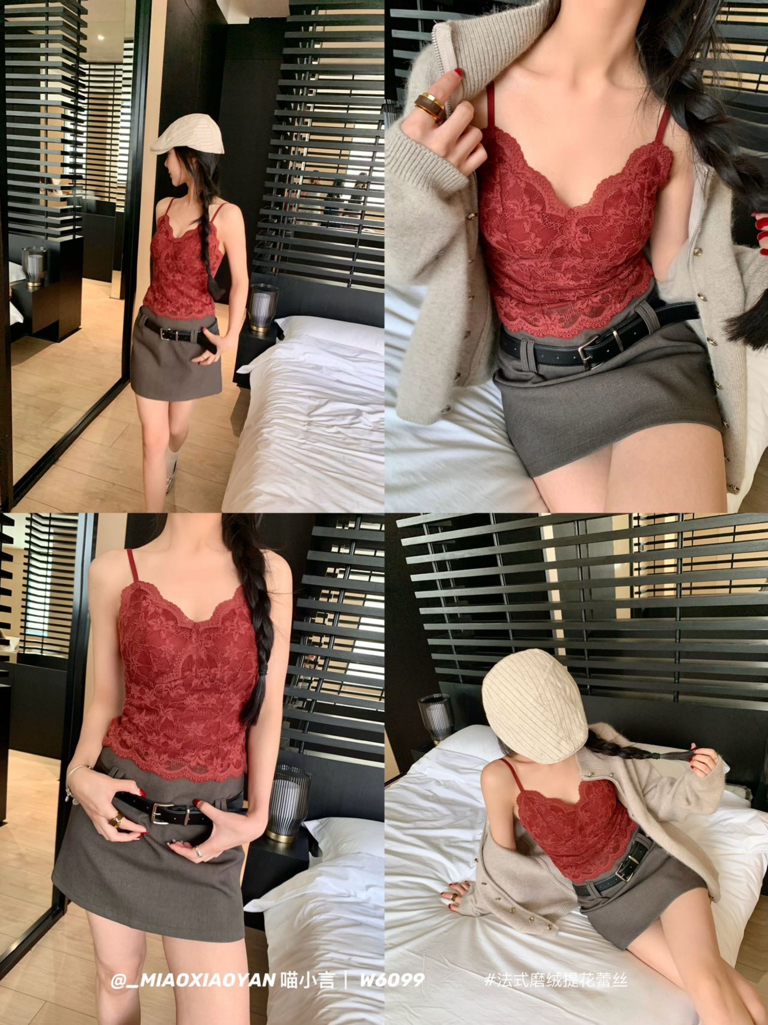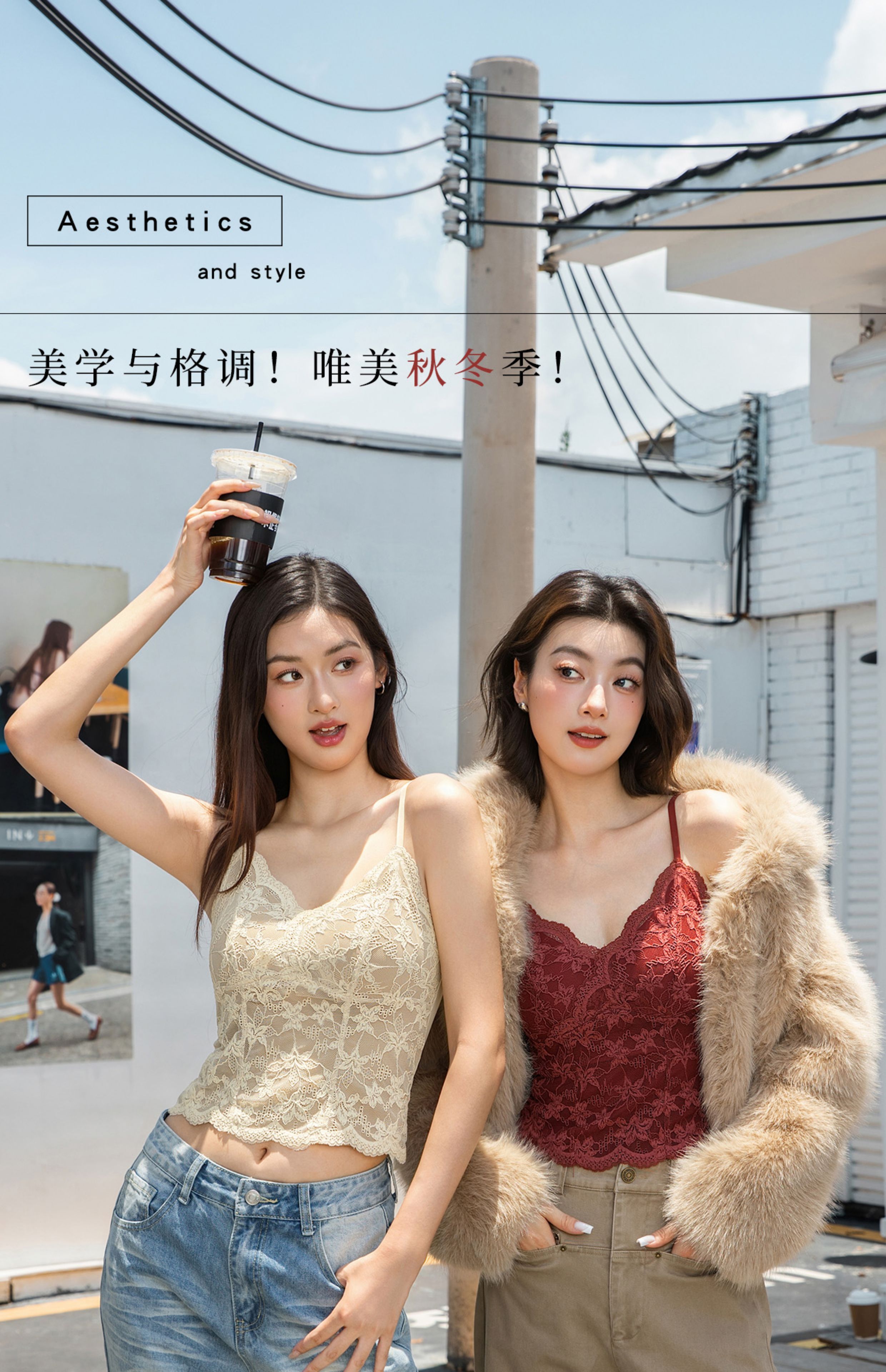 蕾絲花邊帶胸墊美背內搭背心吊帶女磨毛保暖純欲修身顯瘦打底上衣