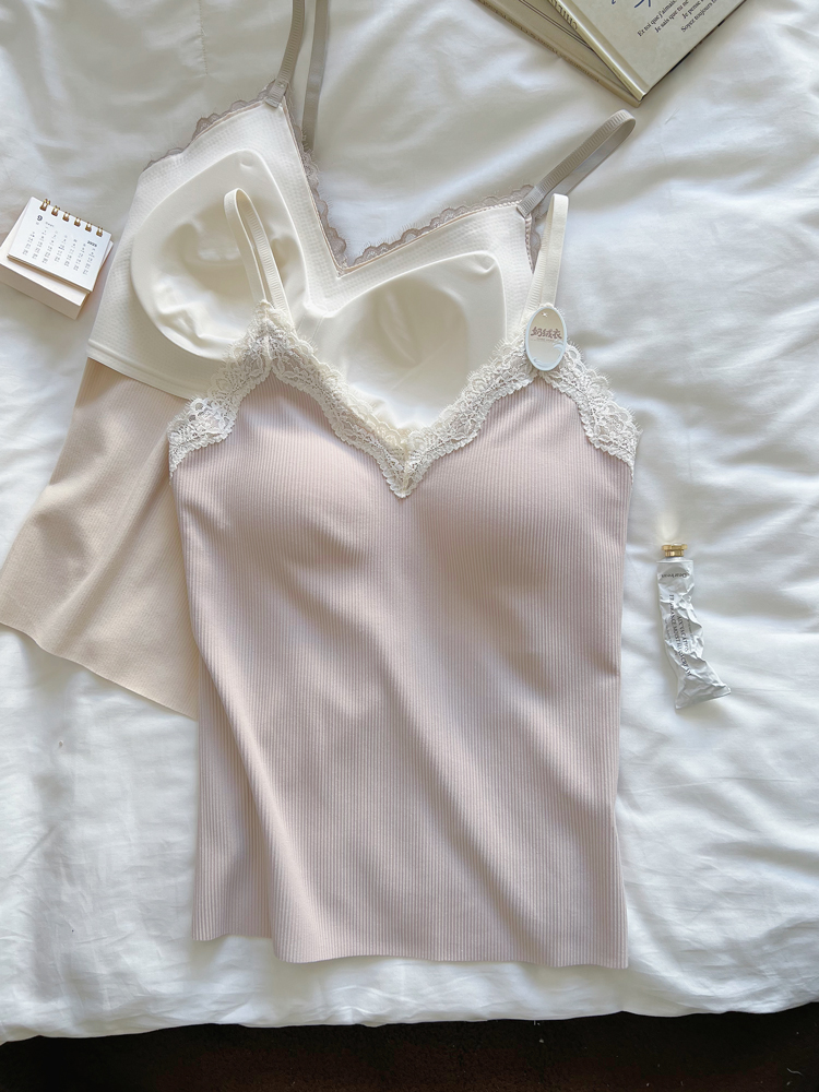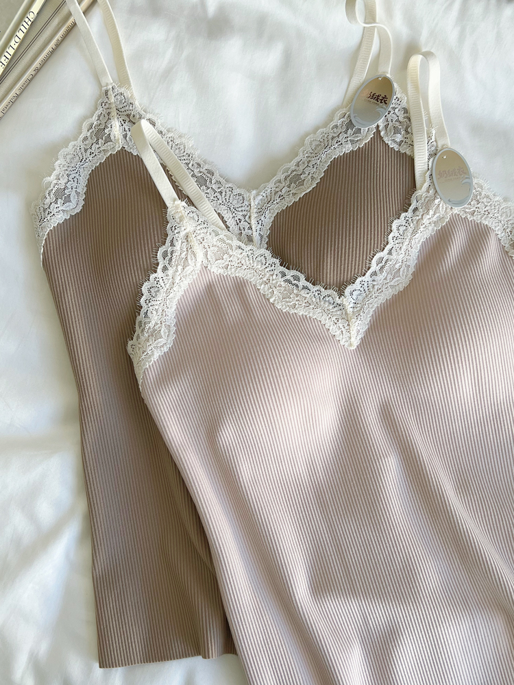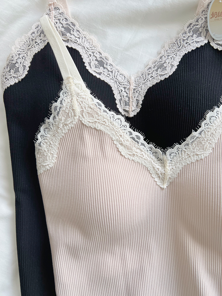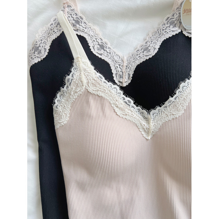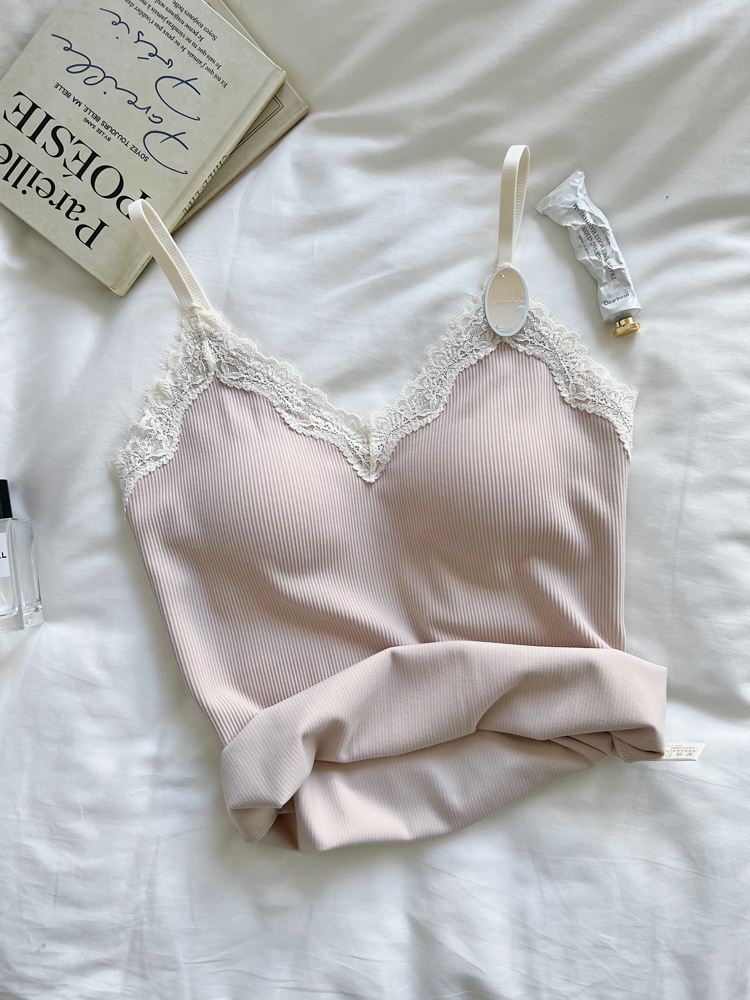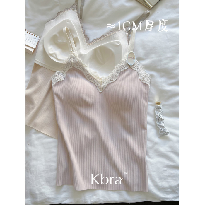 Kbra秋冬磨毛保暖蕾絲深V吊帶背心女帶胸墊聚攏內搭外穿打底上衣