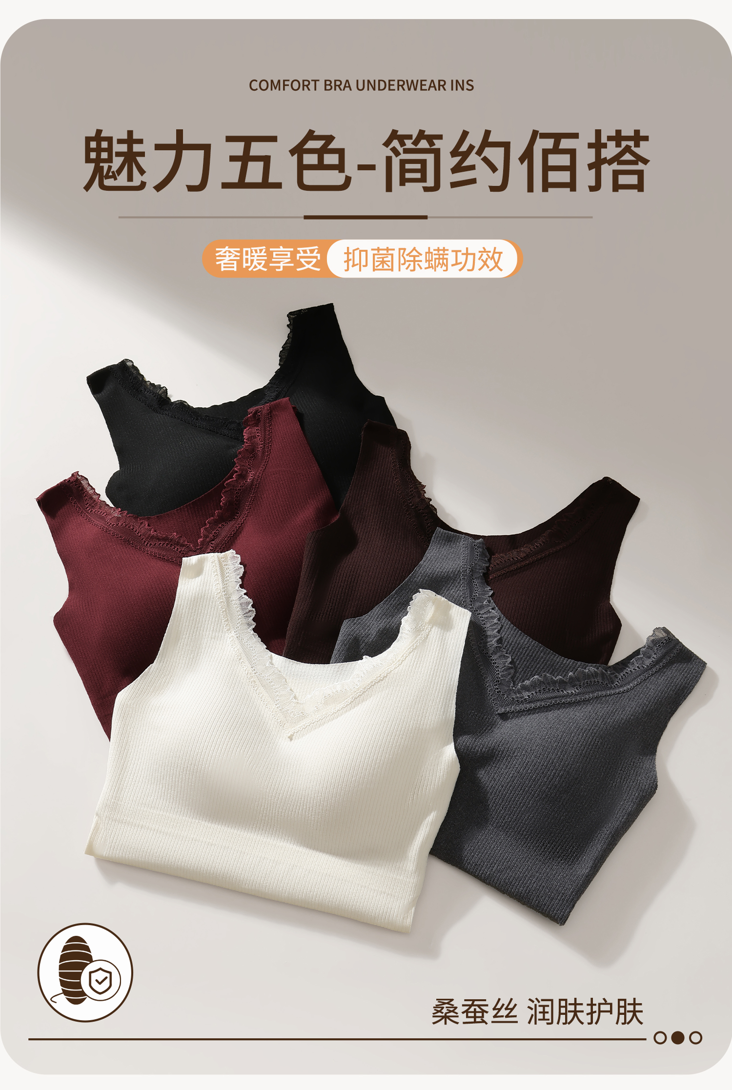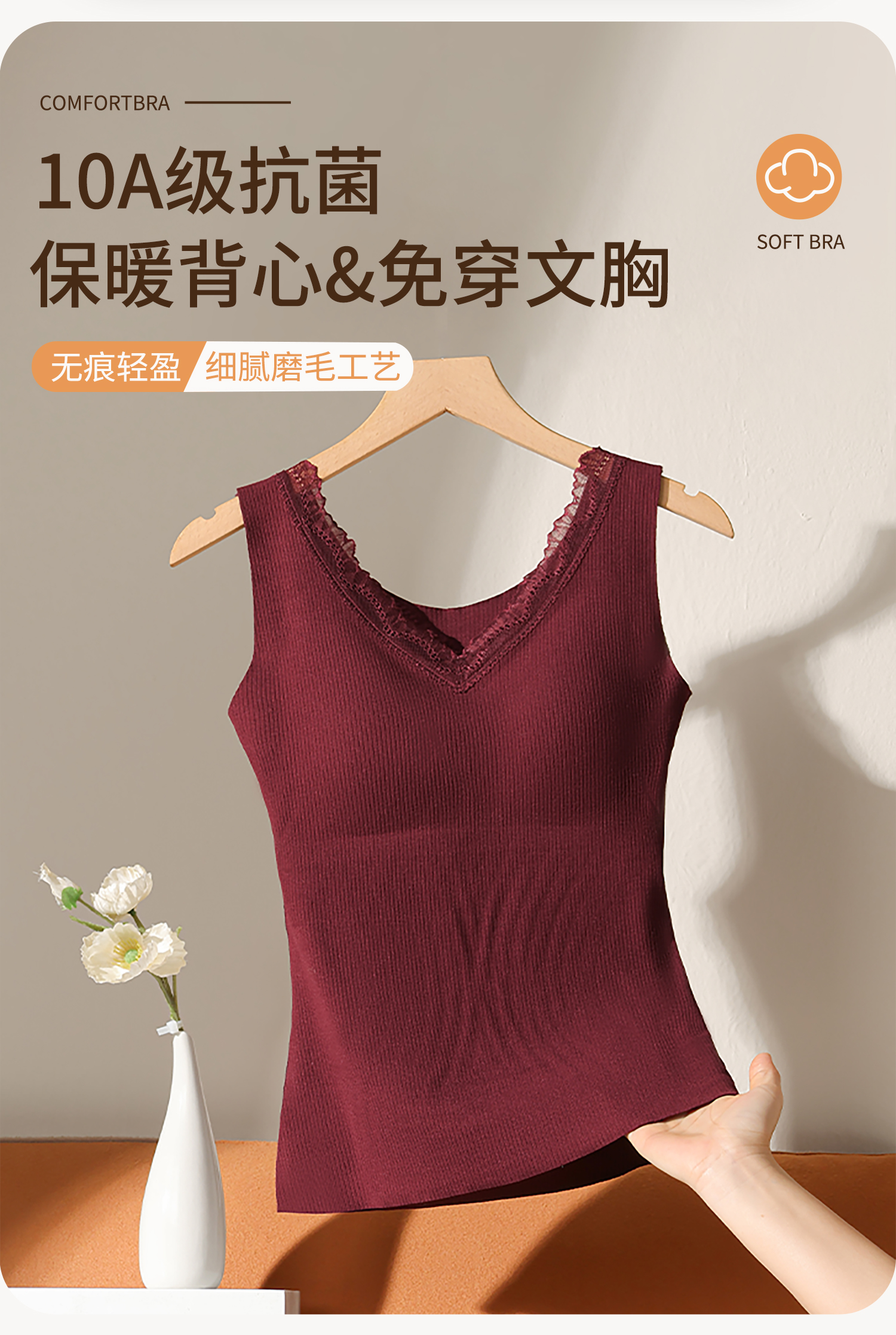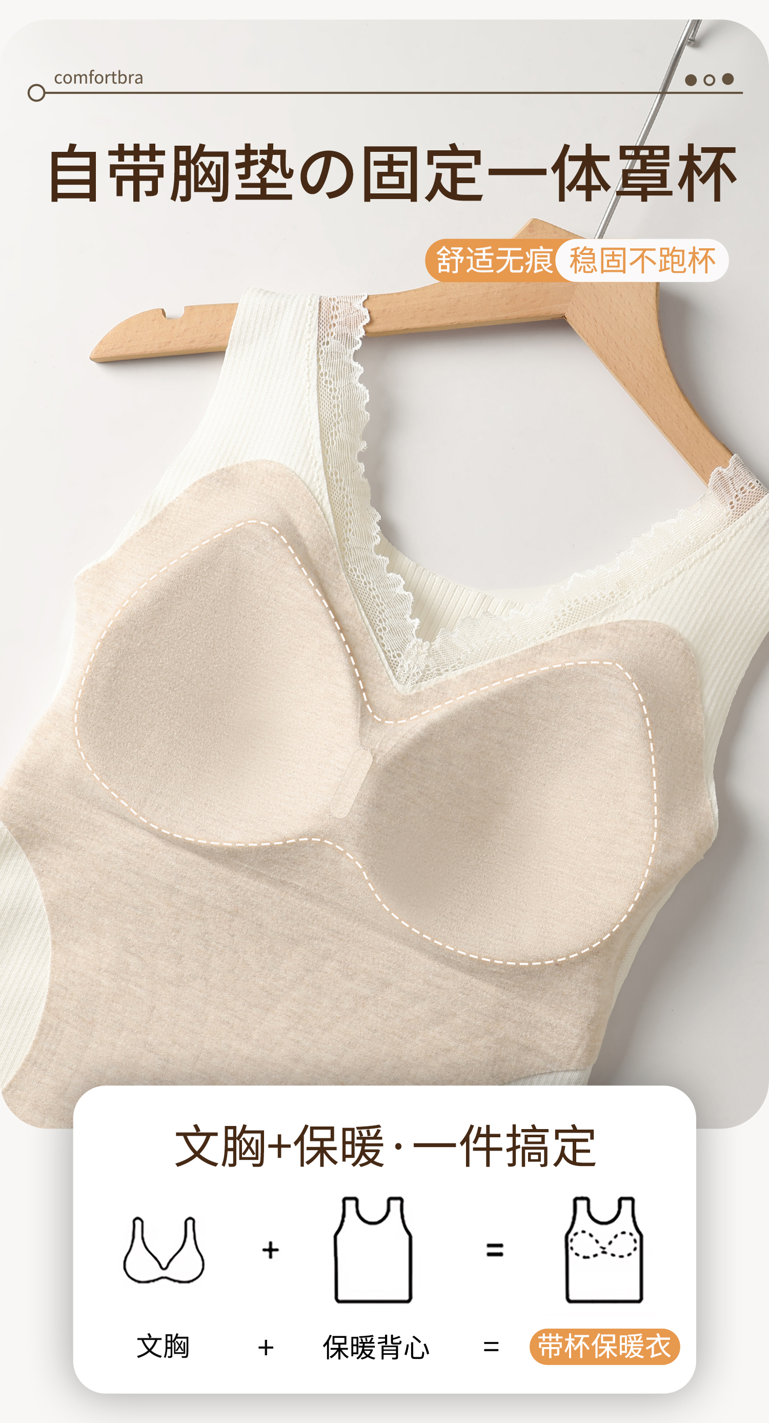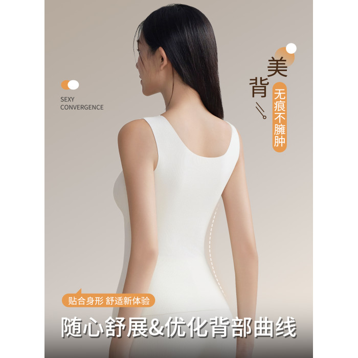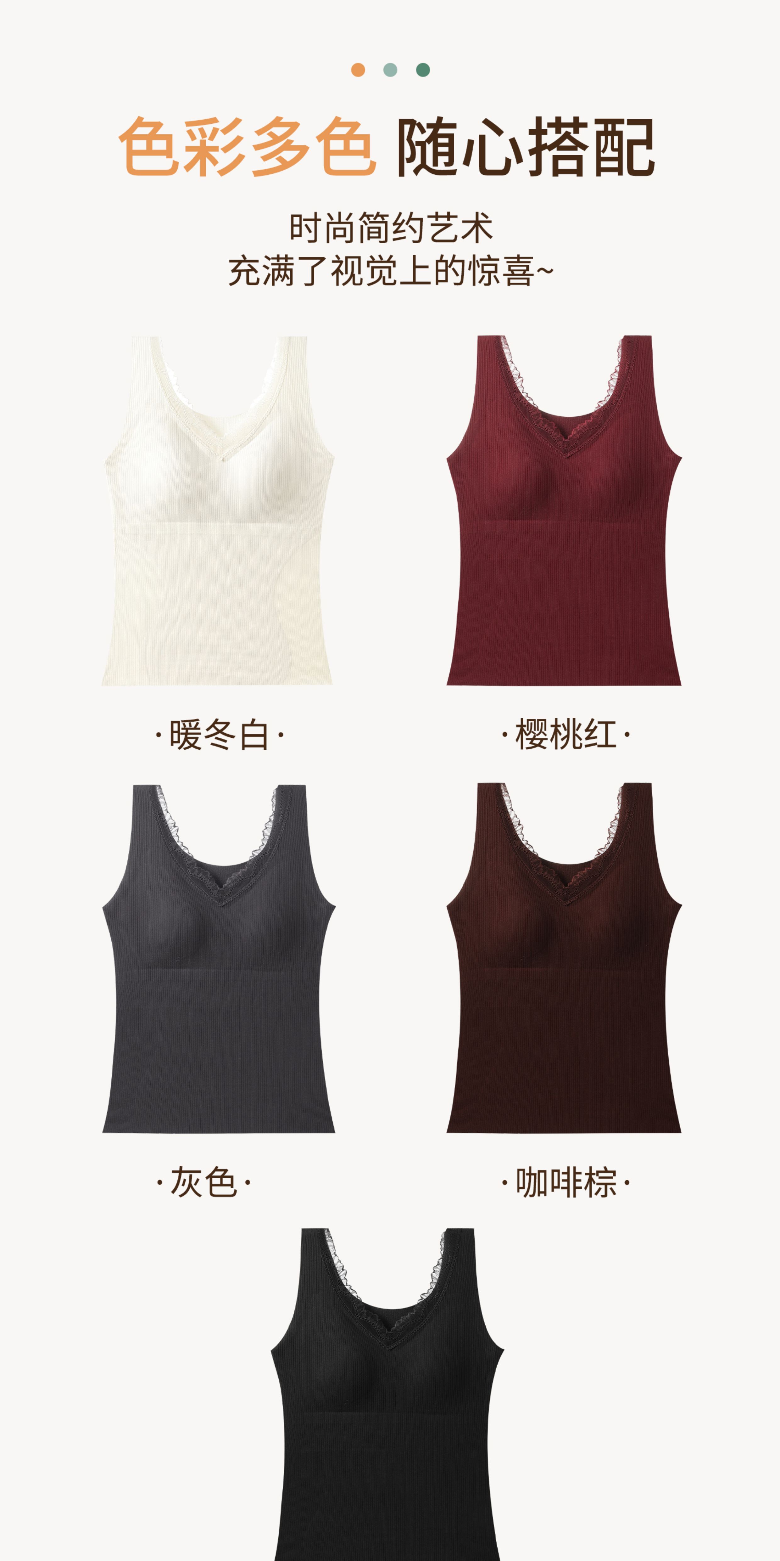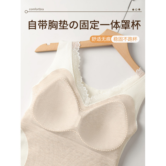 羊絨蠶絲V領保暖背心女帶胸墊蕾絲邊免穿文胸一體式打底髮熱內搭