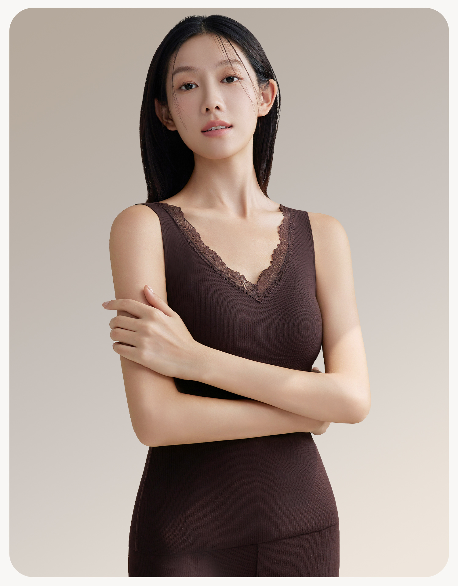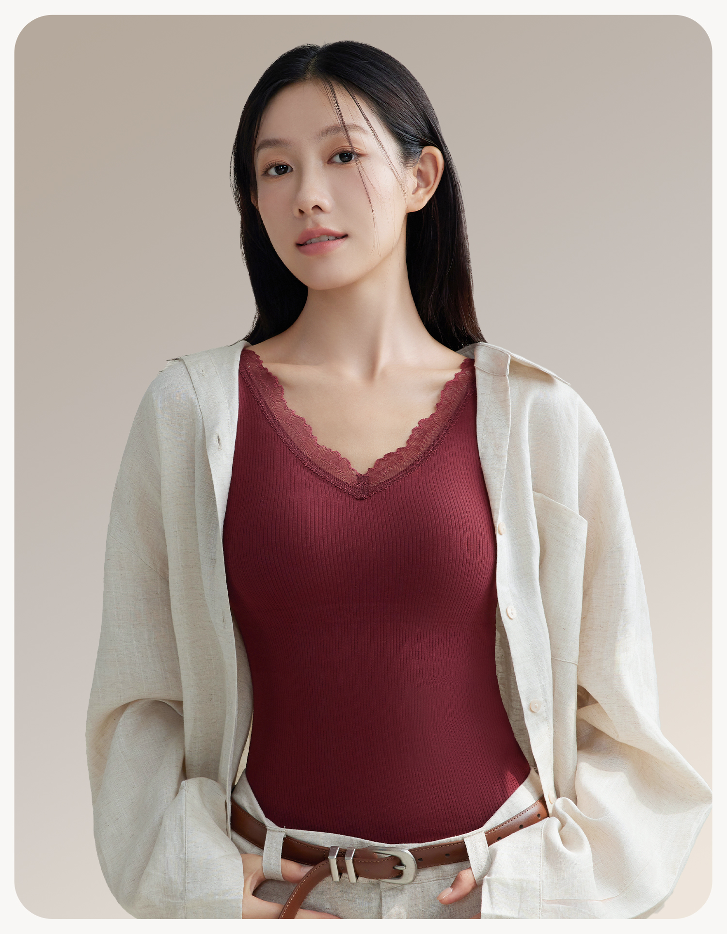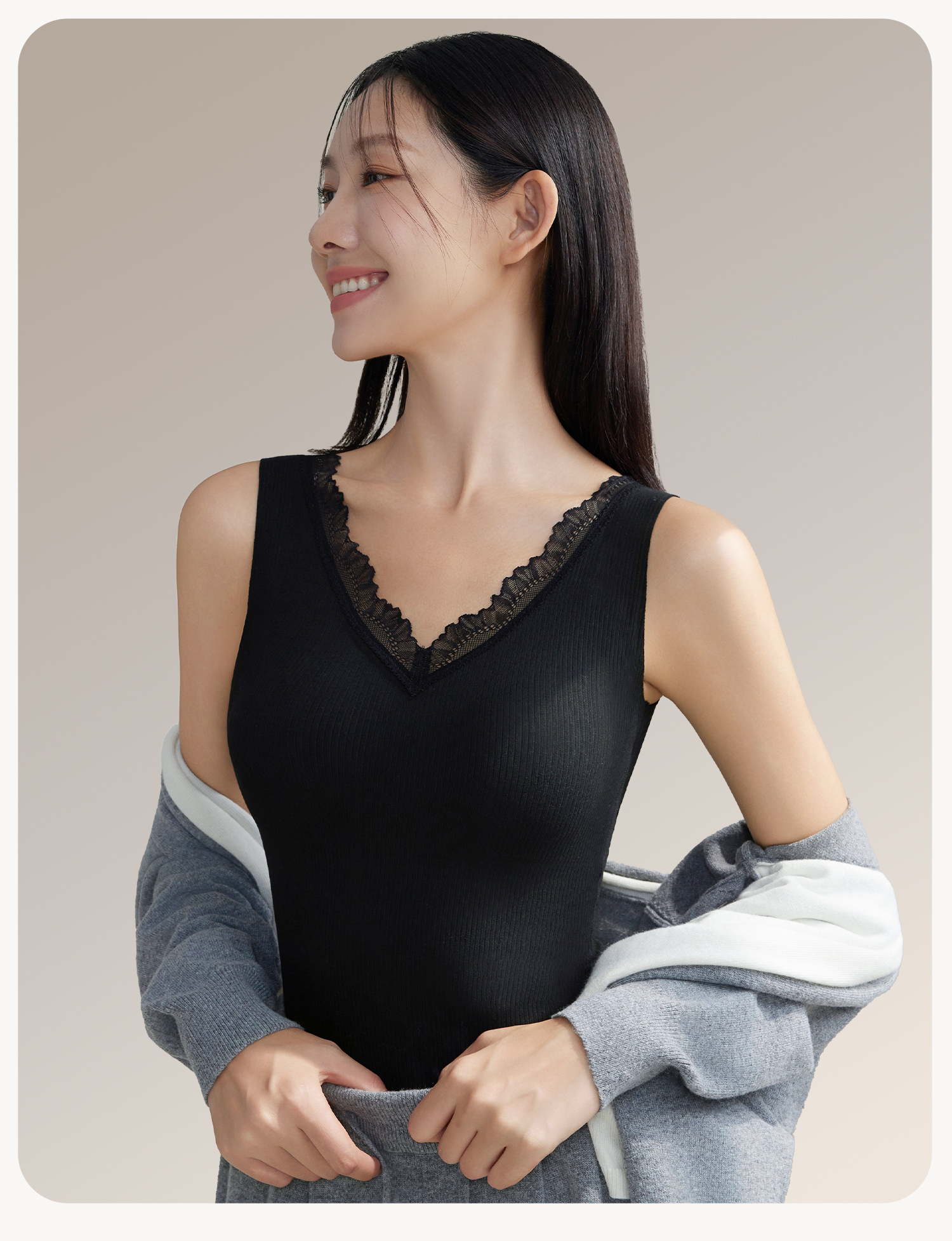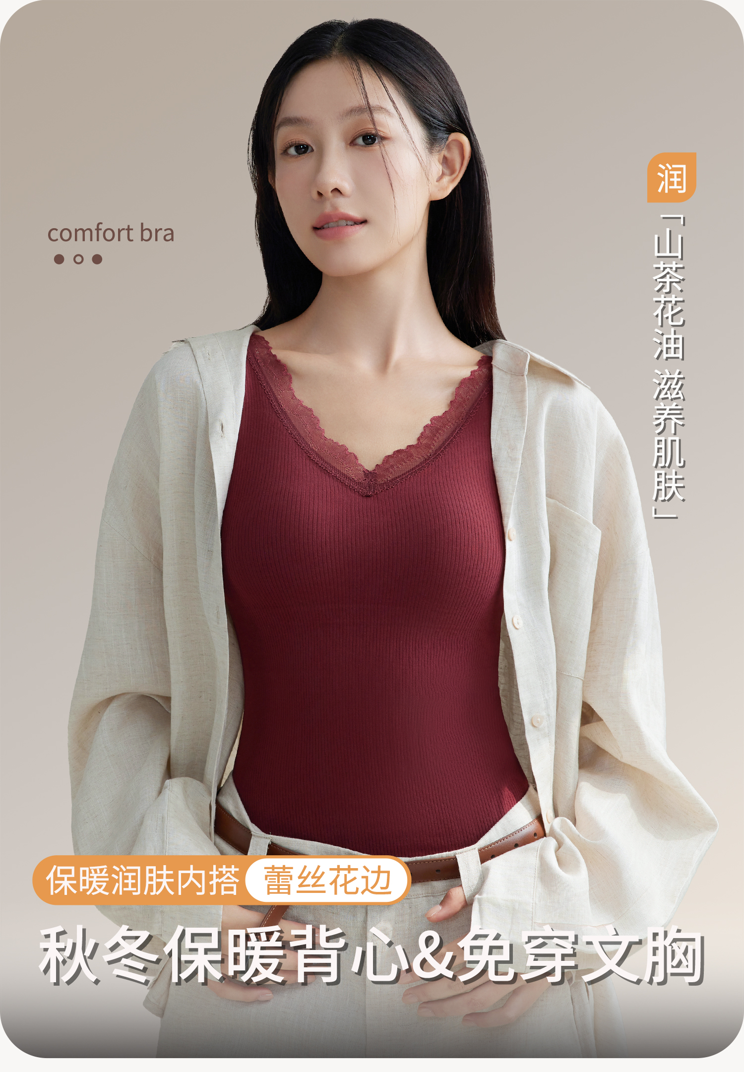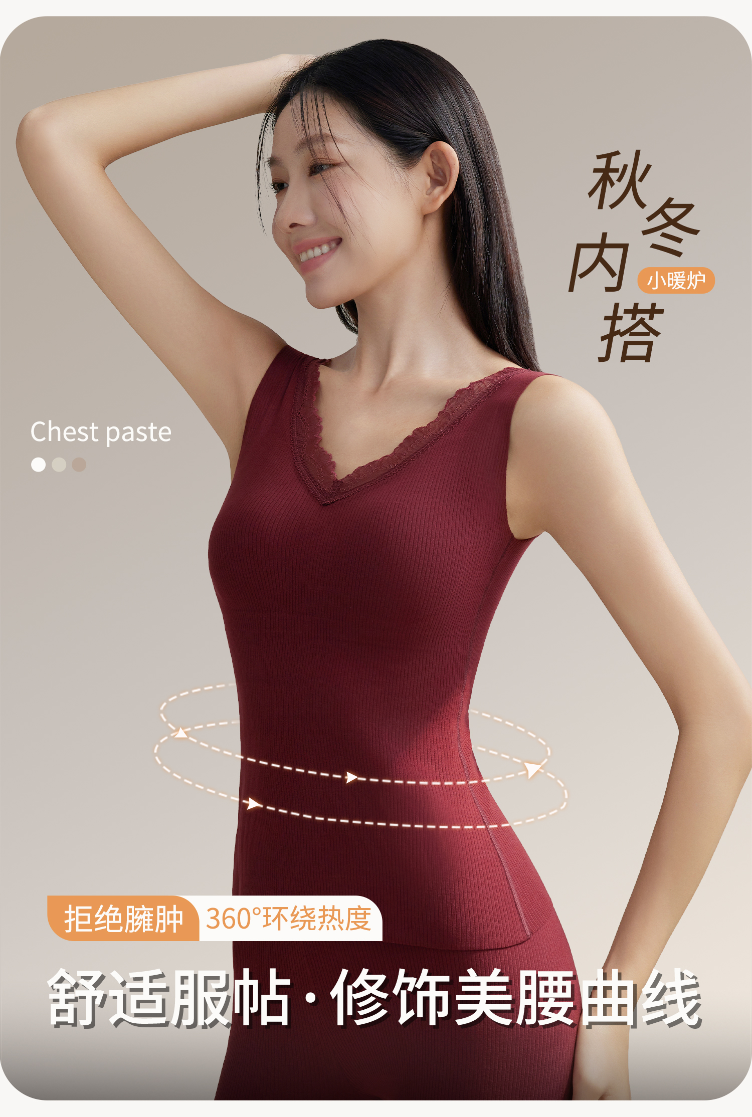 羊絨蠶絲V領保暖背心女帶胸墊蕾絲邊免穿文胸一體式打底髮熱內搭
