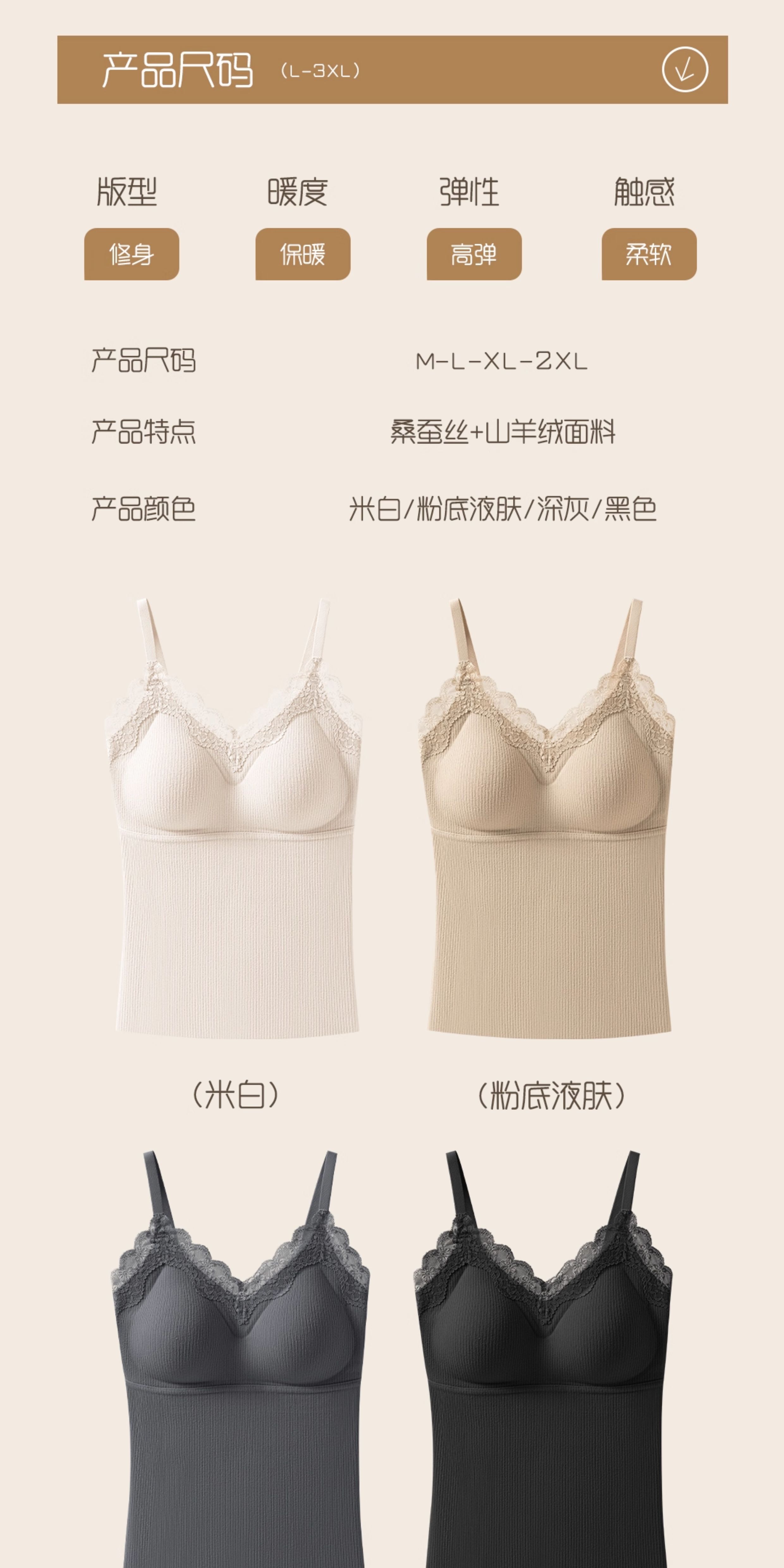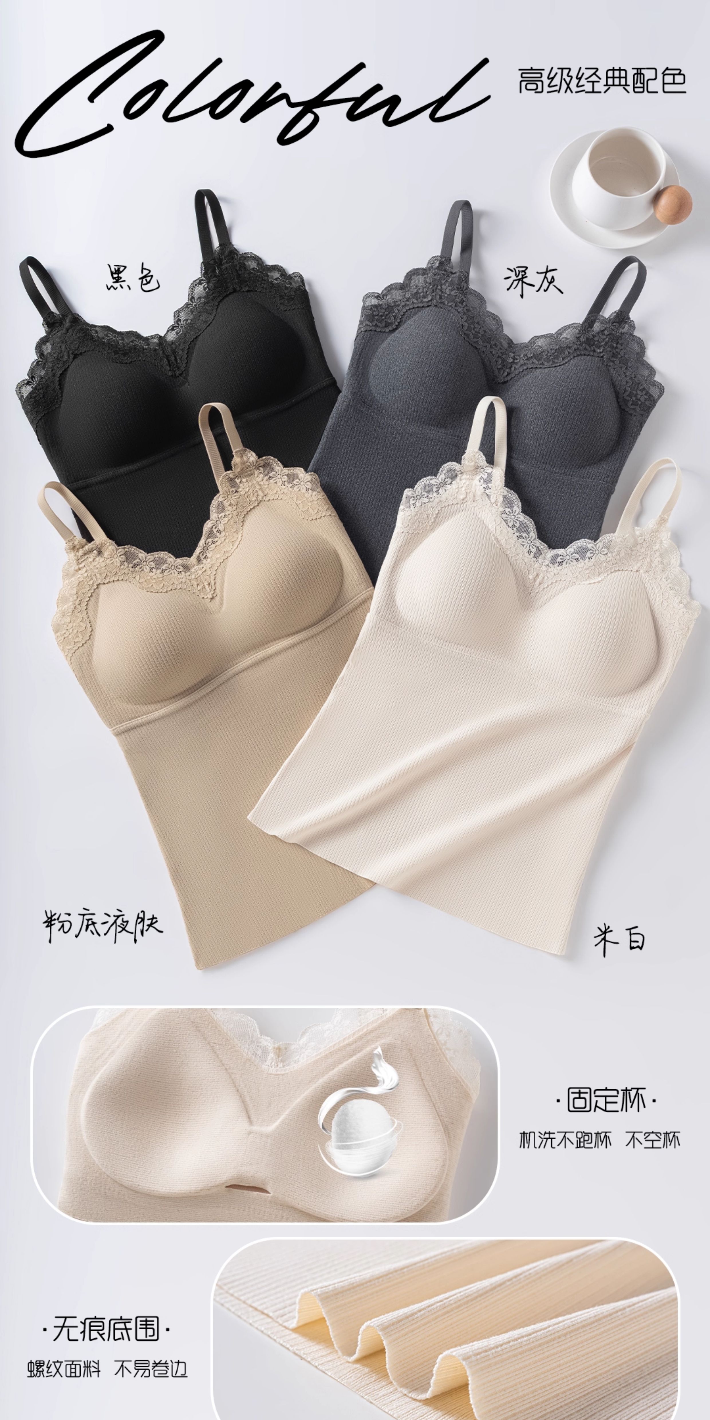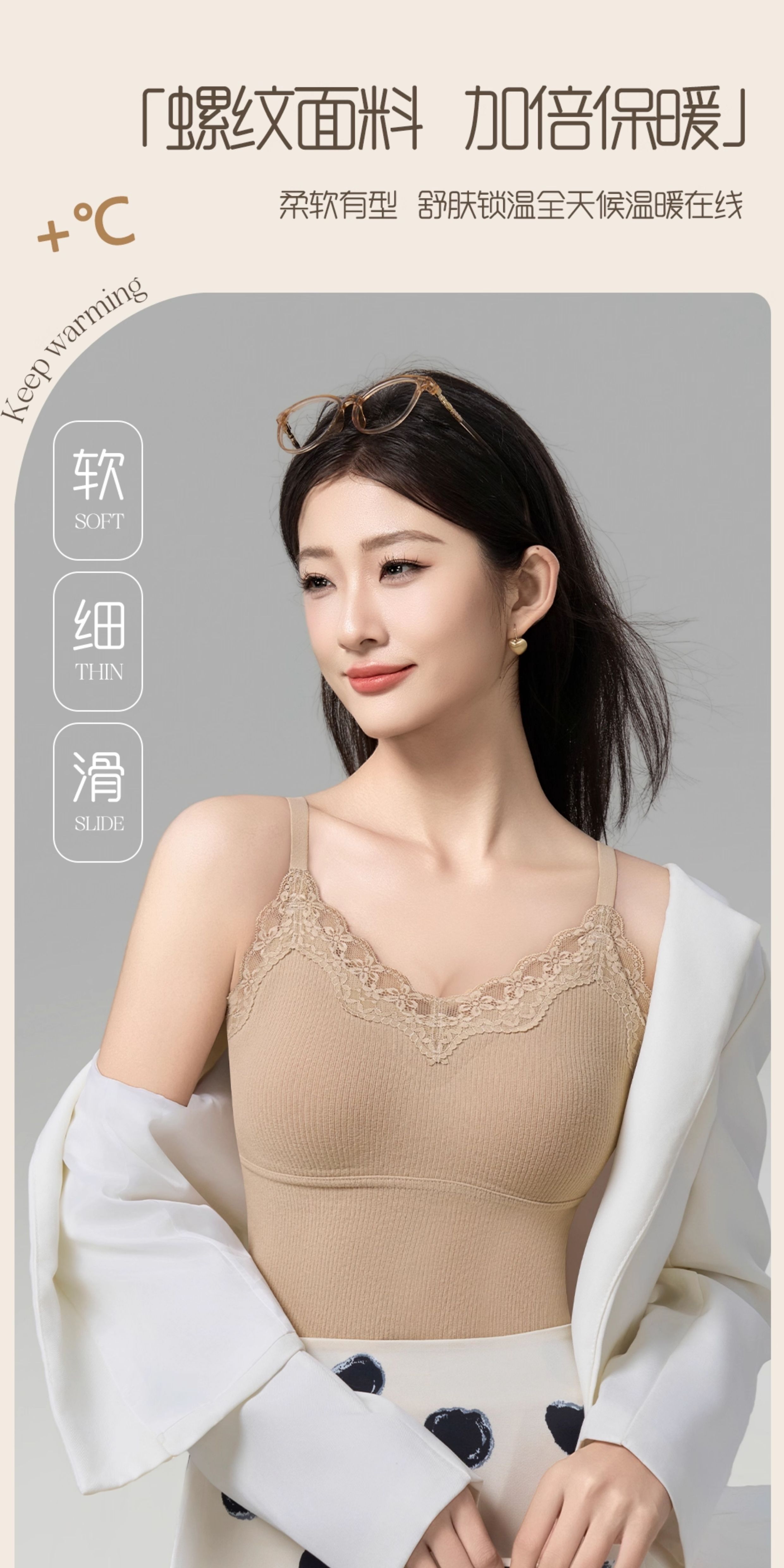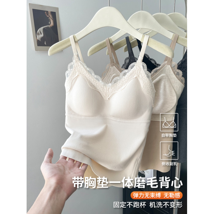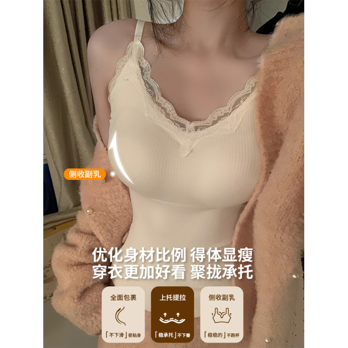 桑蠶絲羊絨保暖內衣女加絨吊帶背心2025秋冬帶胸墊蕾絲內搭打底