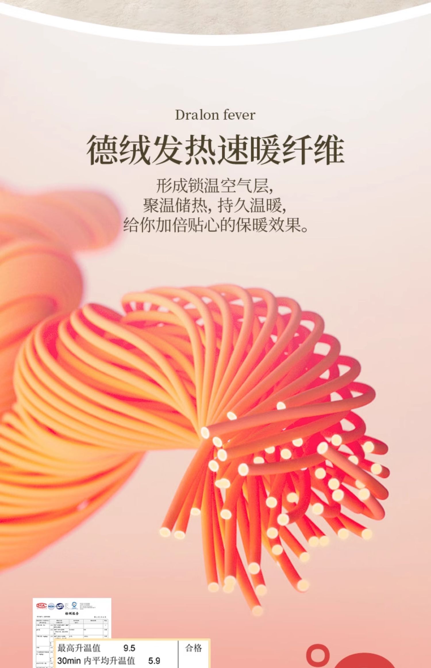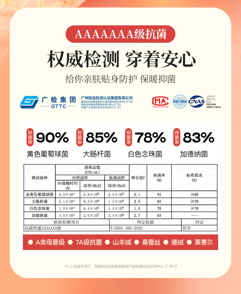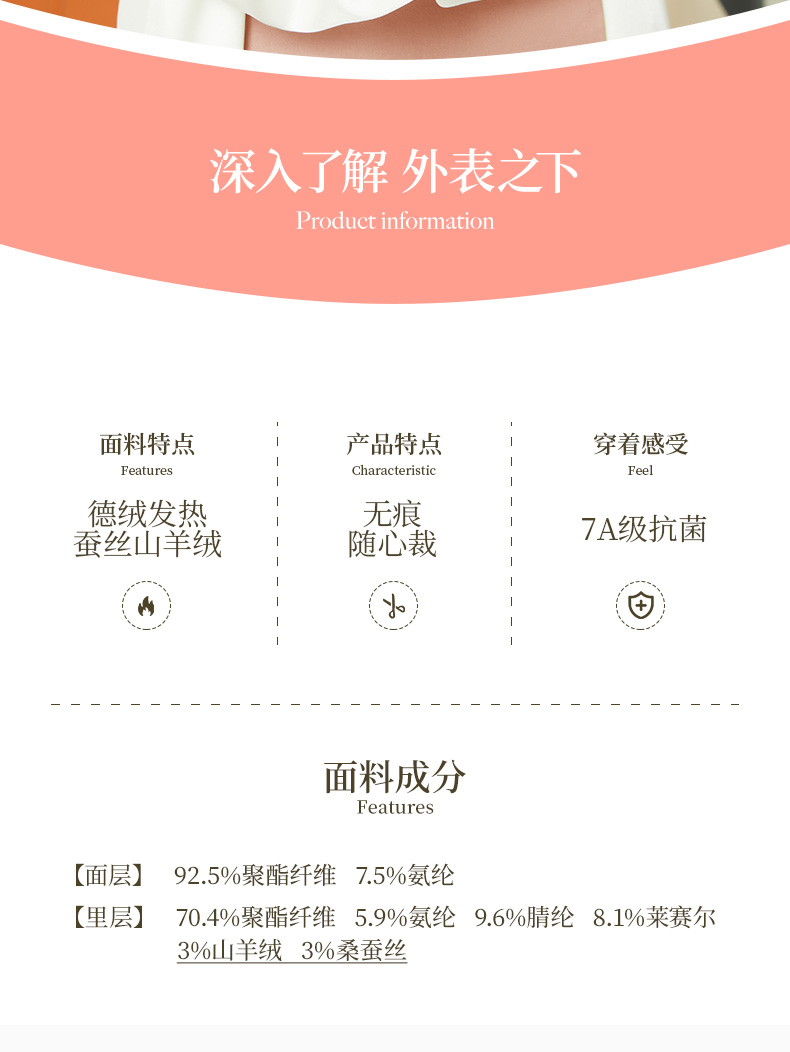 | 裡料材質成分 | 聚酯纖維70.4% 聚氨酯彈性纖維(氨綸)5.9% 聚丙烯腈纖維(腈綸)9.6% 萊賽爾纖維(萊賽爾)8.1% 山羊羢(羊羢)3% 桑蠶絲3% |