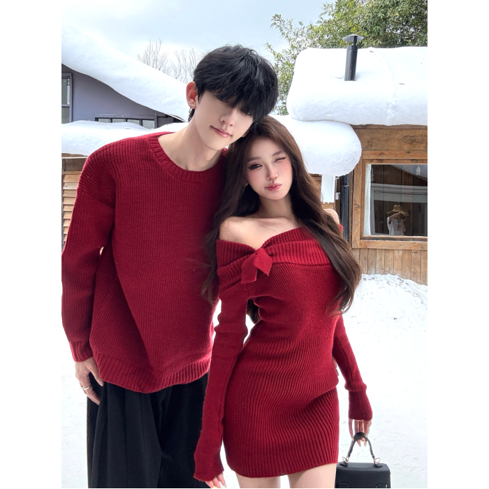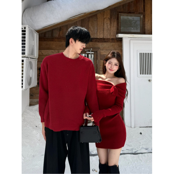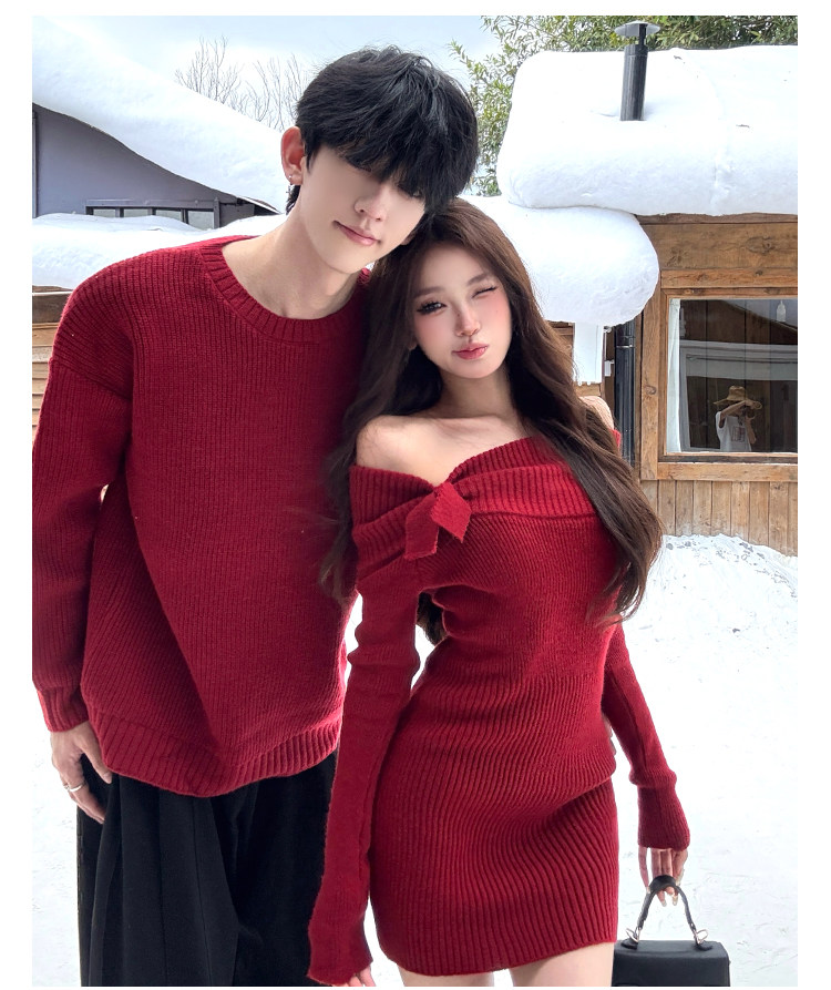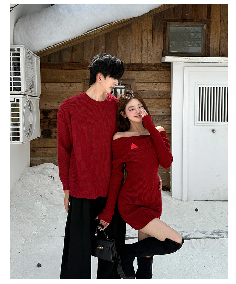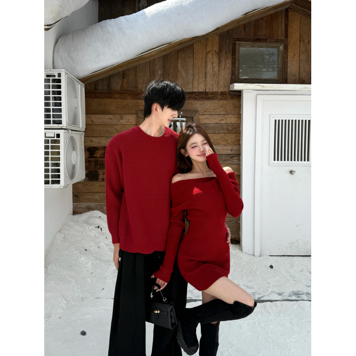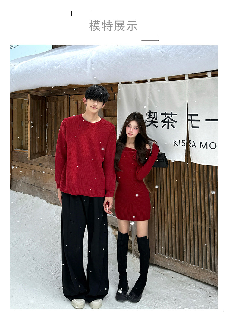 情侶裝2025新款秋冬ins本命年法式一字肩針織連衣裙紅色新年戰袍