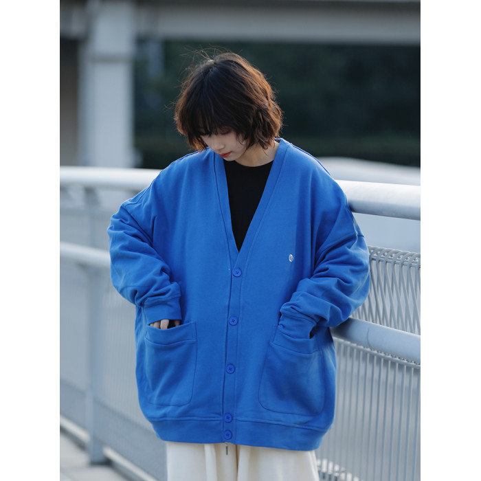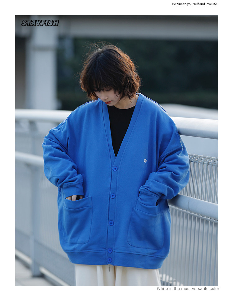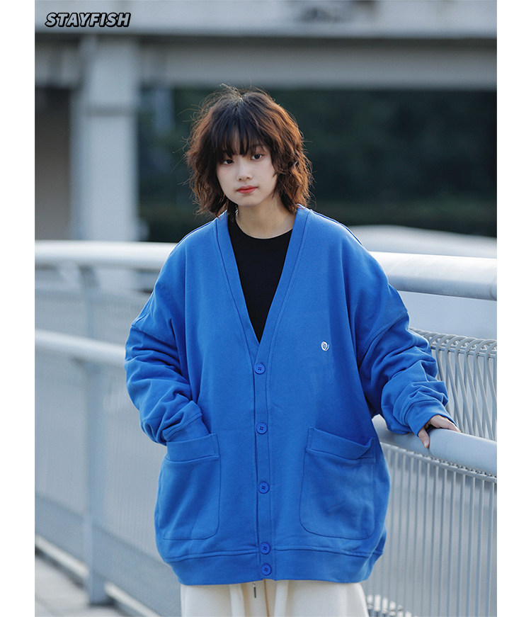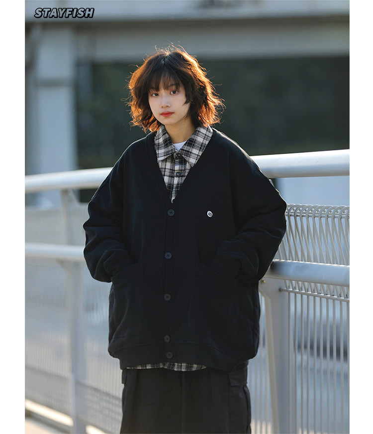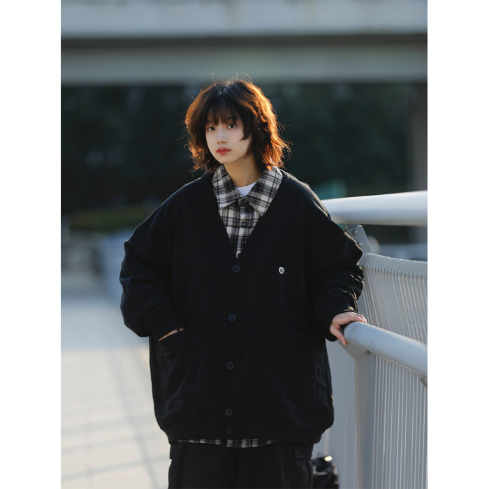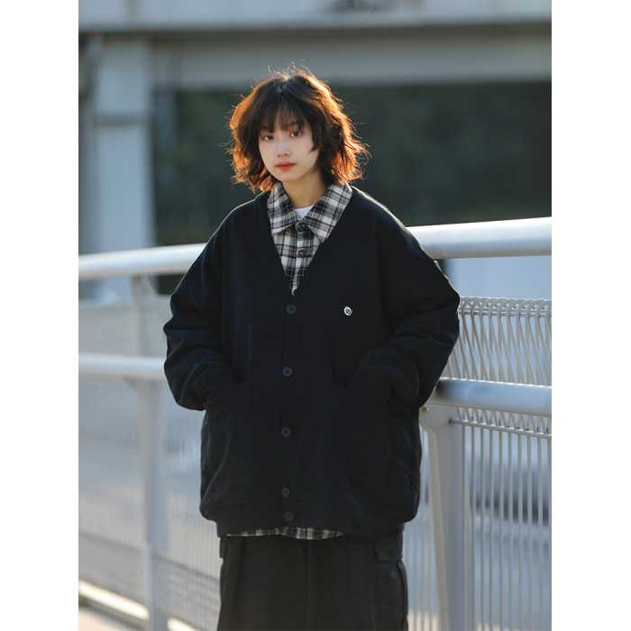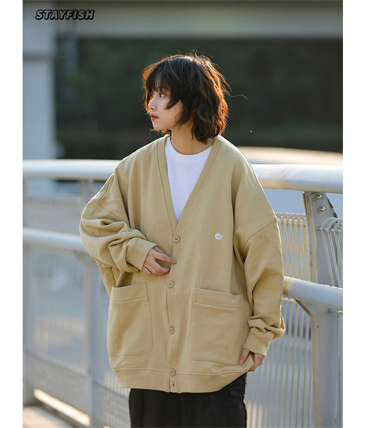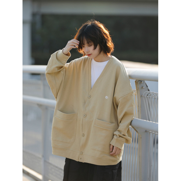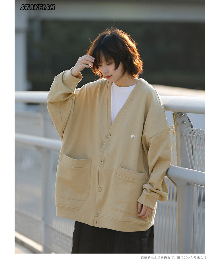 阿於呆 日系春季V領純色刺綉針織開衫寬松慵懶文藝風復古男女外套
