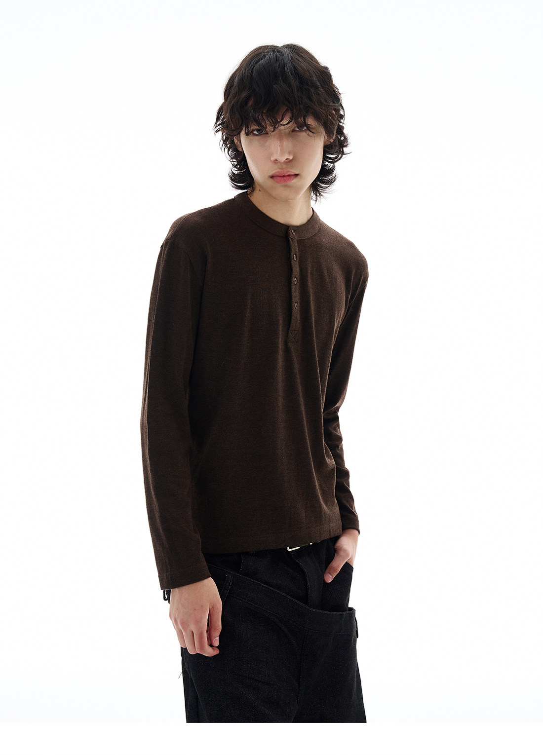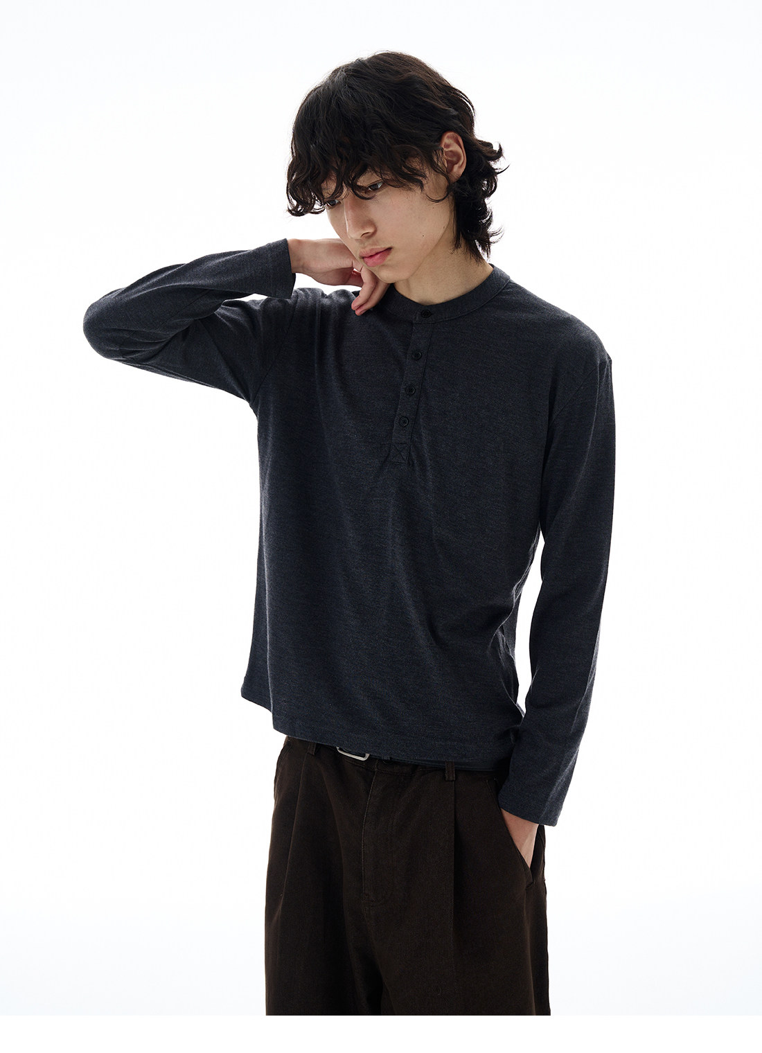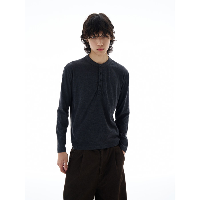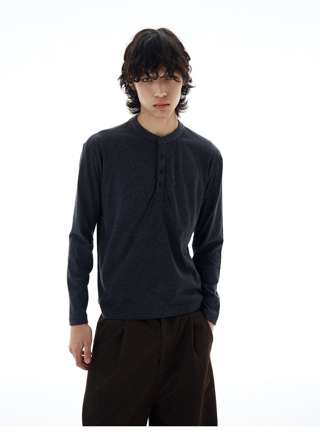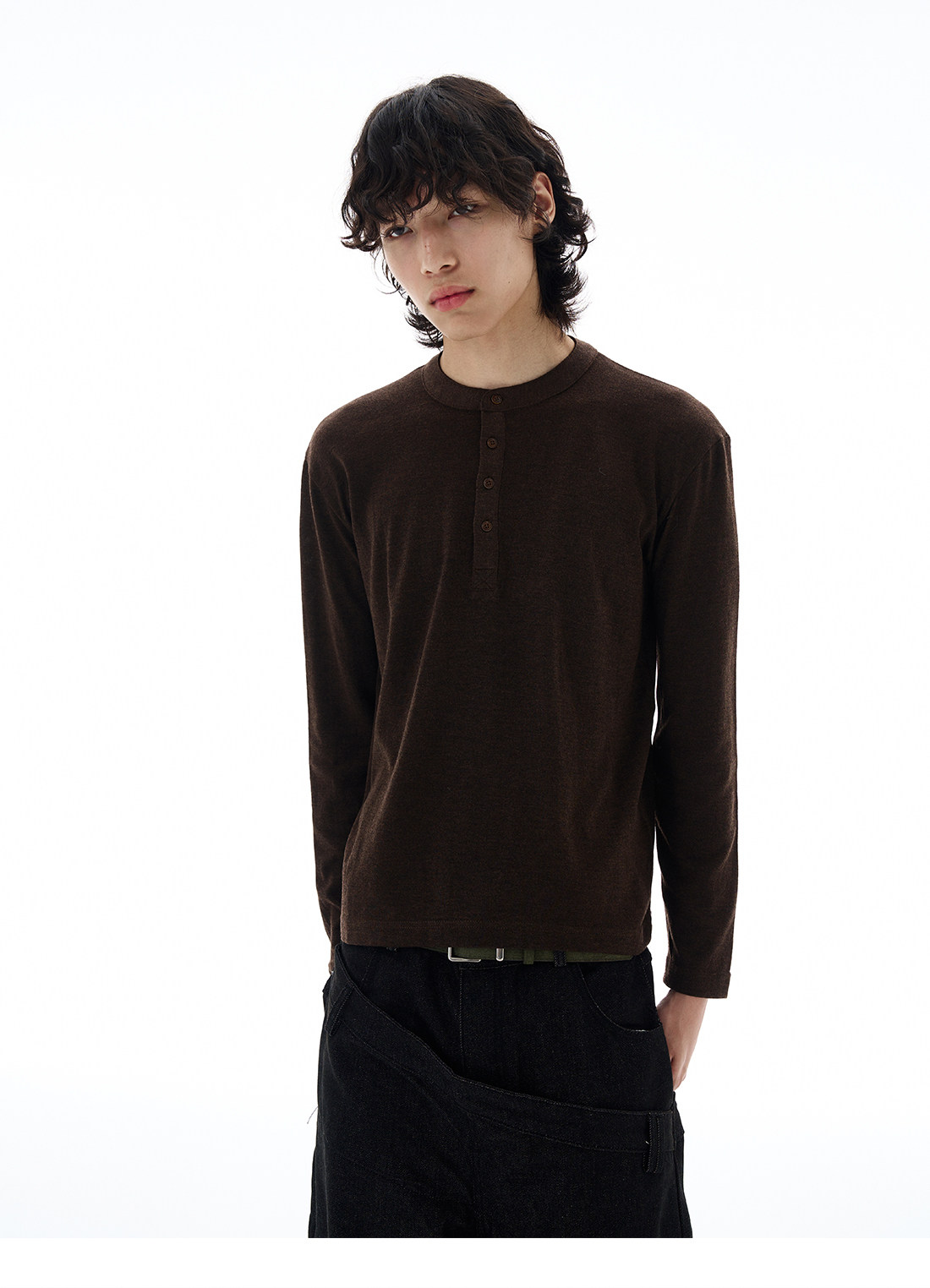 尾郎的店 秋季美式復古羊毛混紡亨利衫男高級感薄款長袖打底衫T恤