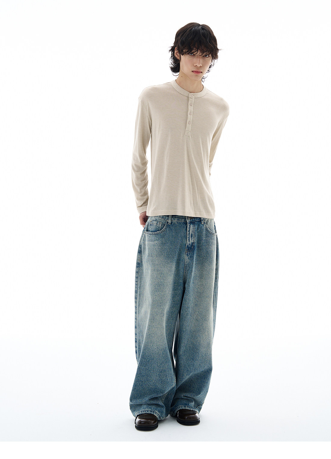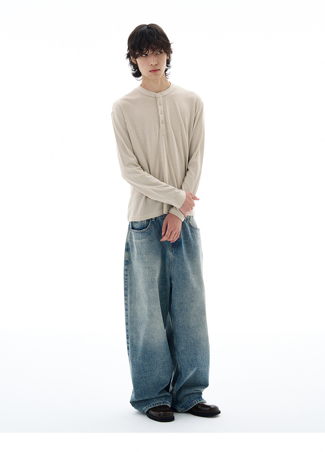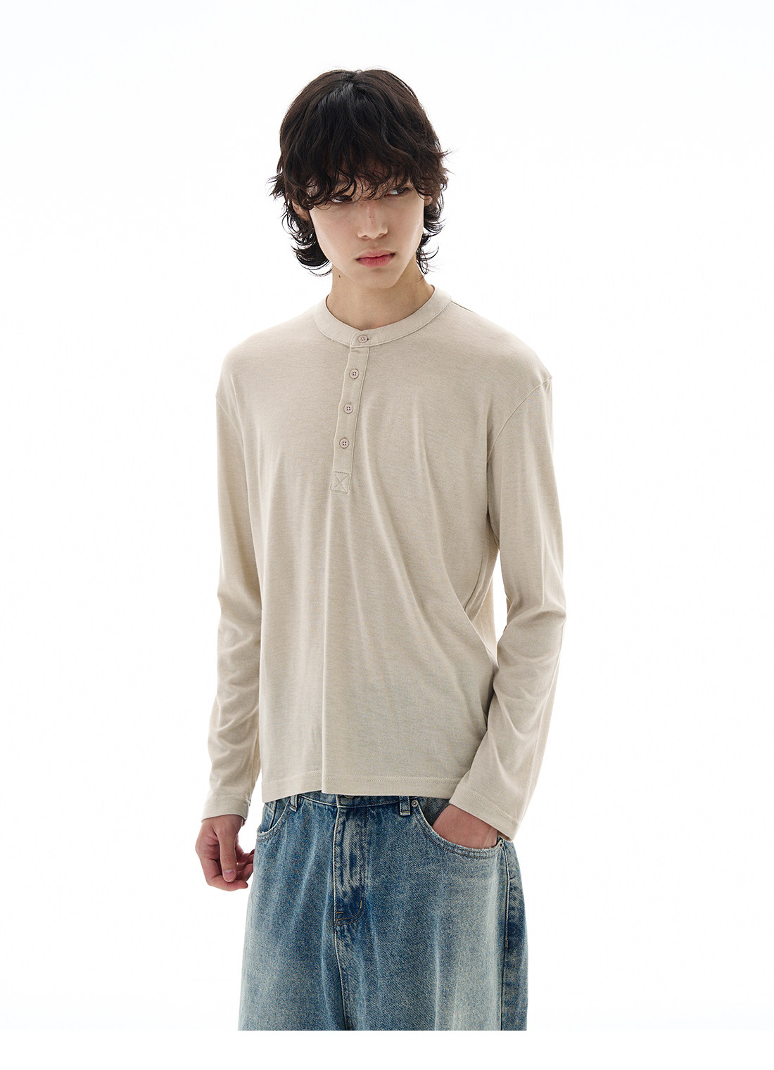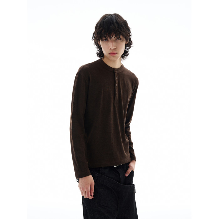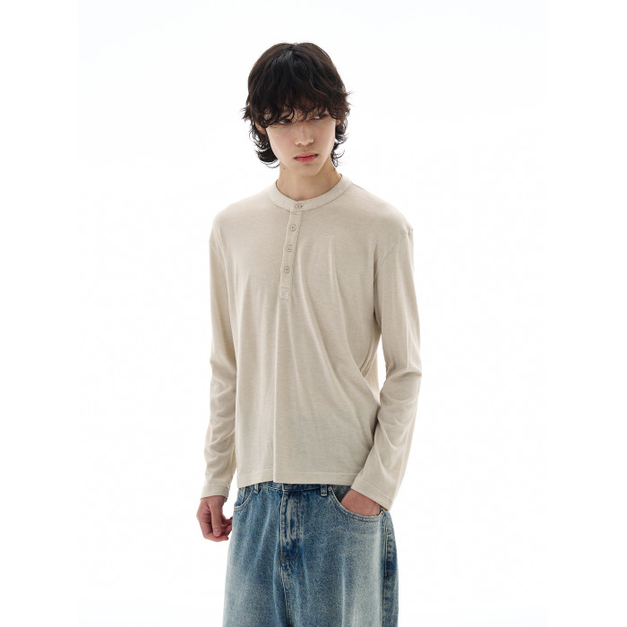 尾郎的店 秋季美式復古羊毛混紡亨利衫男高級感薄款長袖打底衫T恤