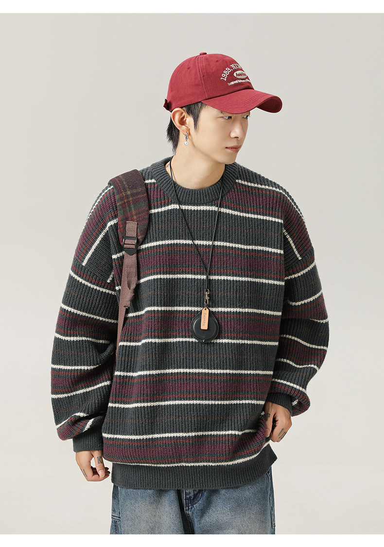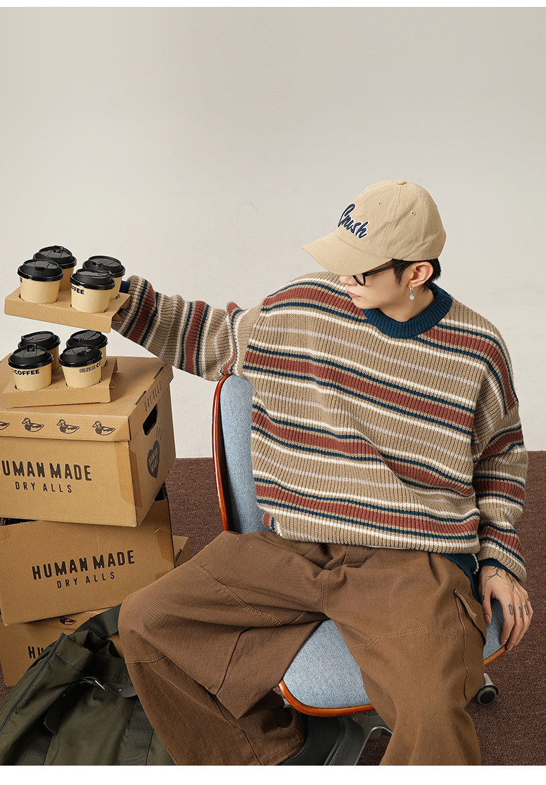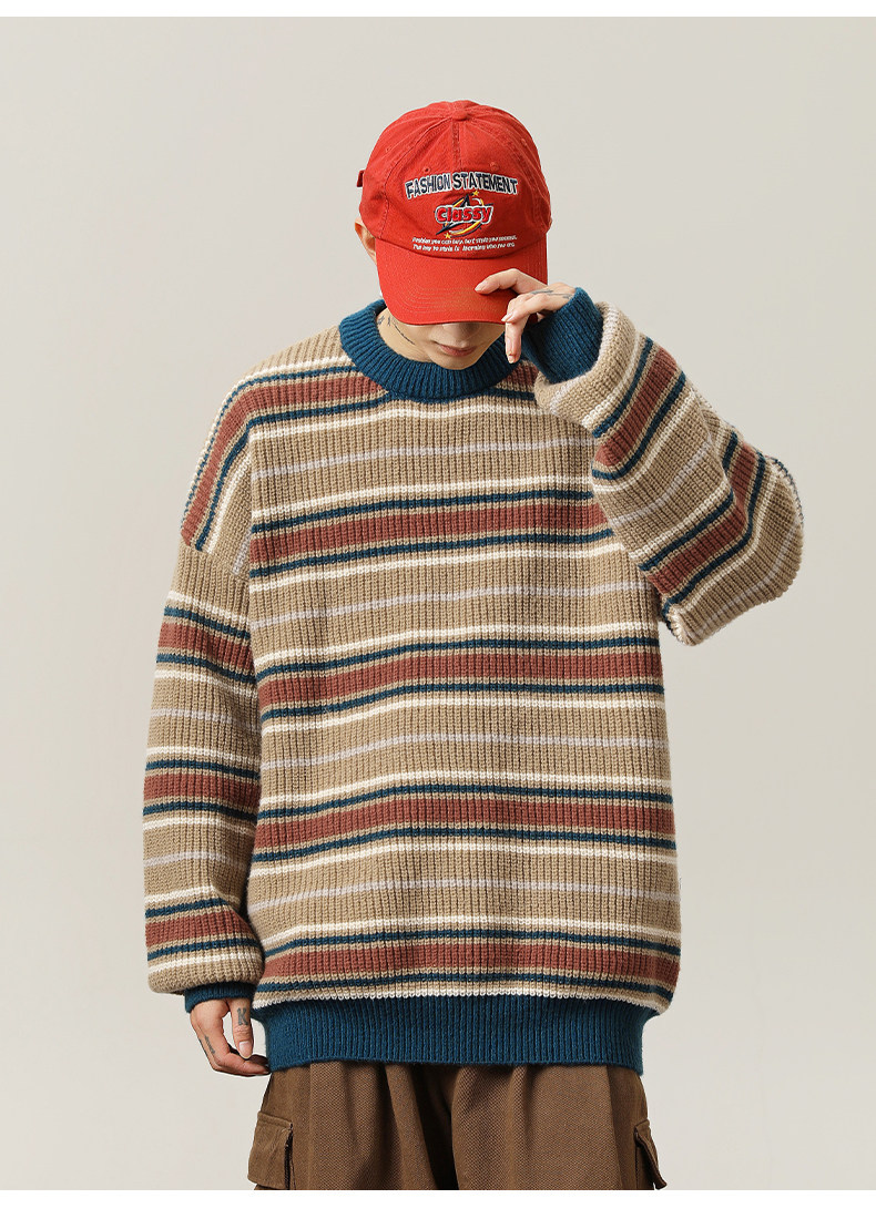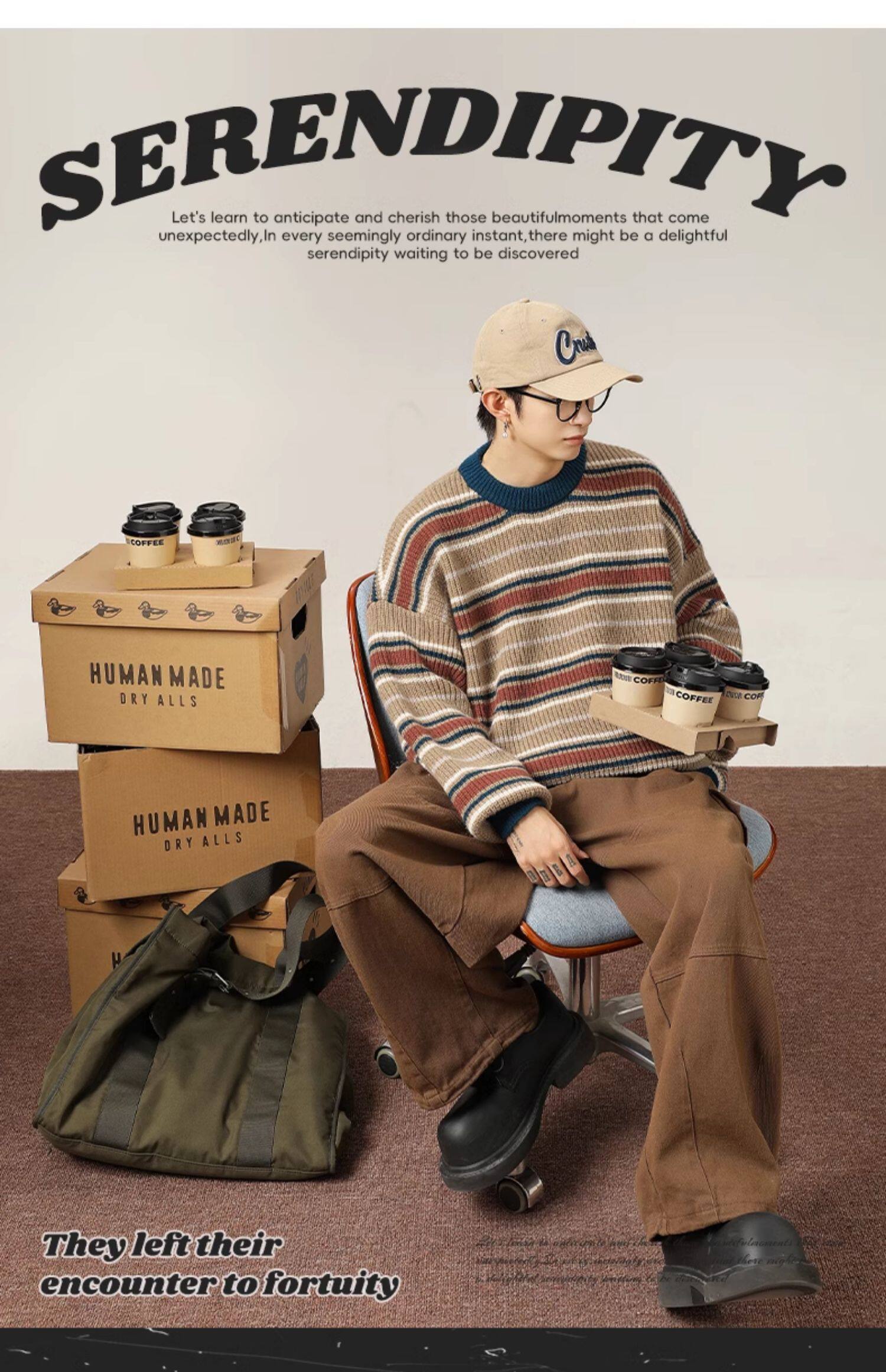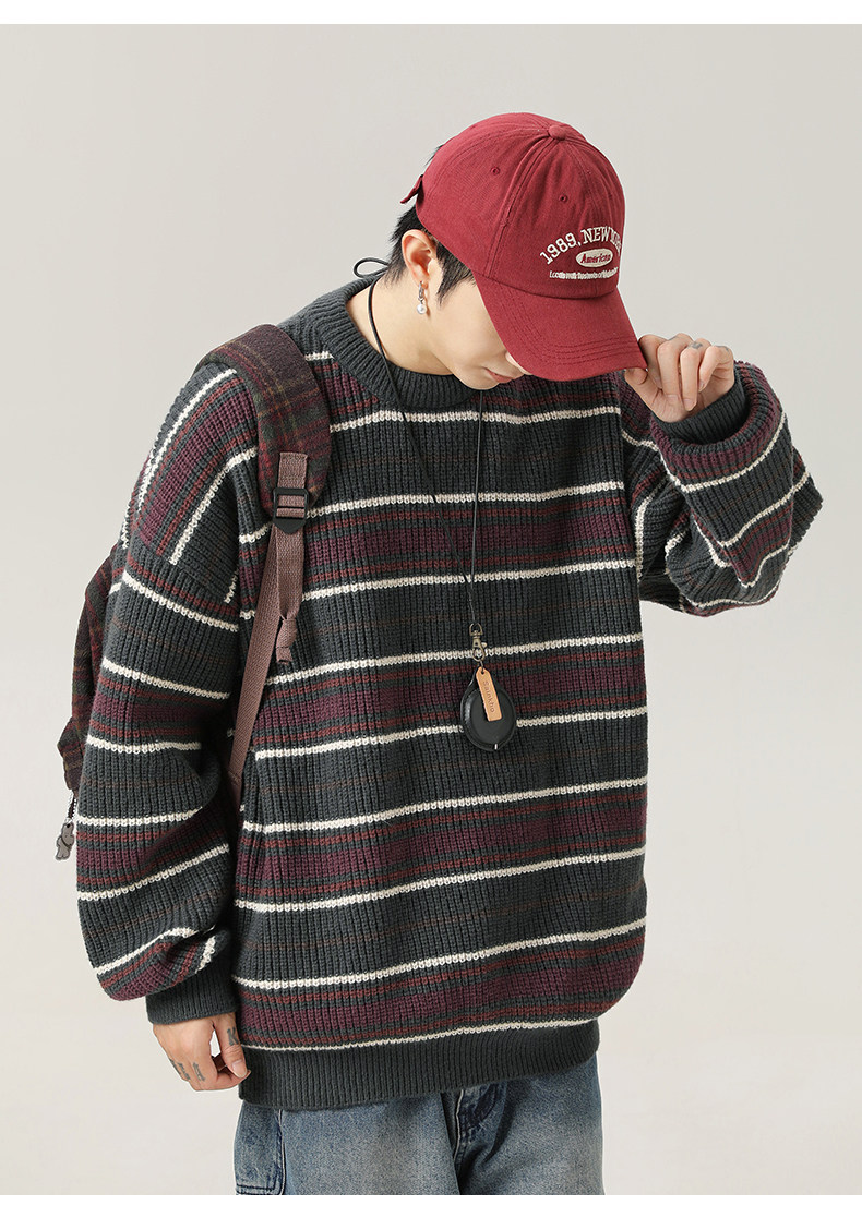 WASSUP ISSUE美式圓領針織衫男款秋冬季高級感痞帥復古條紋毛衣男