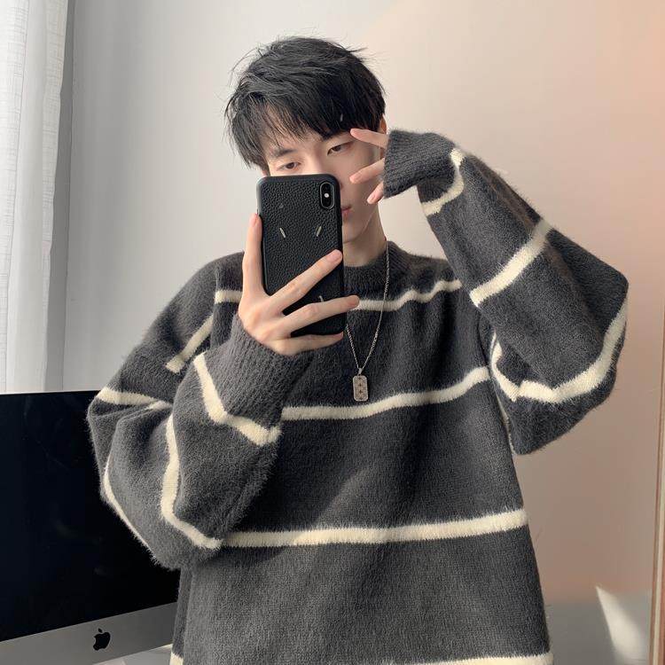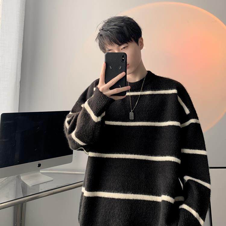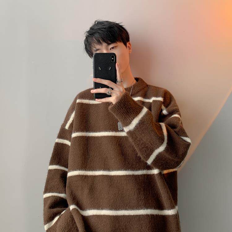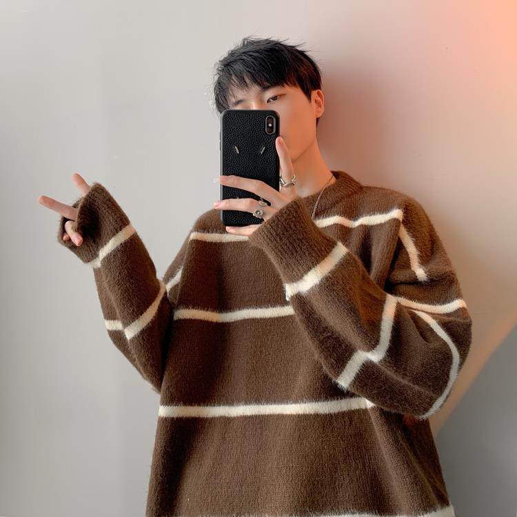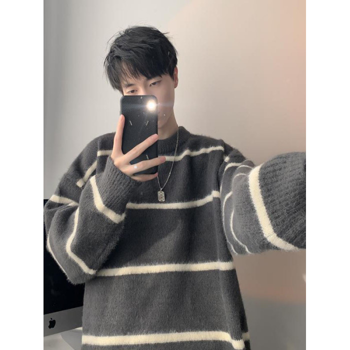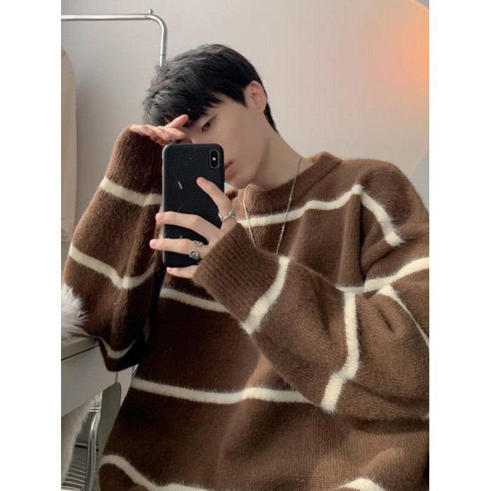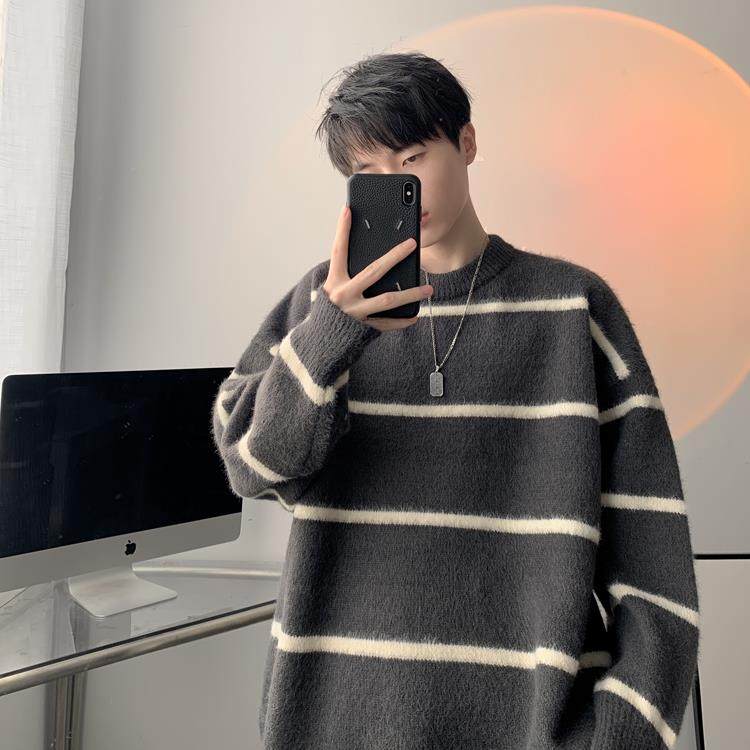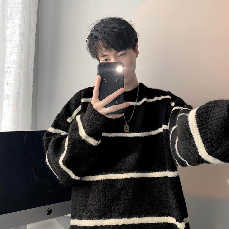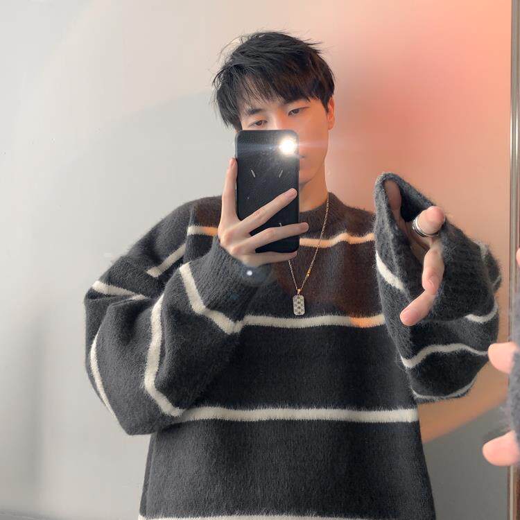 大碼300斤慵懶風條紋毛衣男秋冬季美式潮牌高級感軟糯毛絨針織衫2