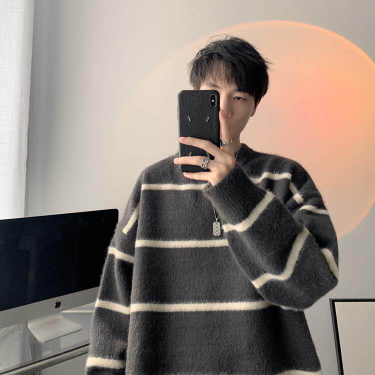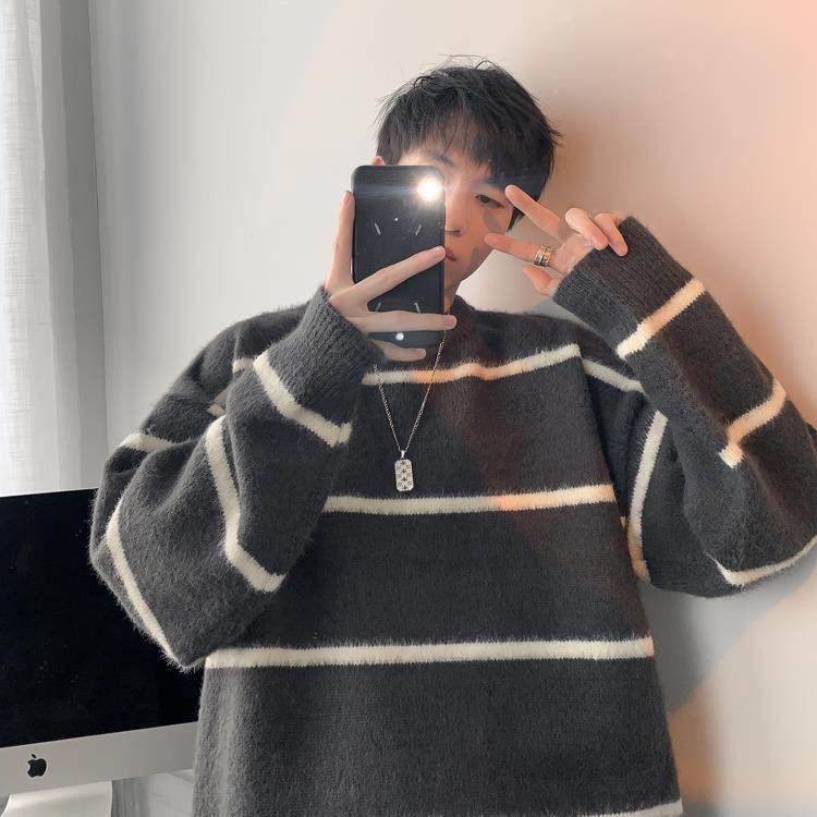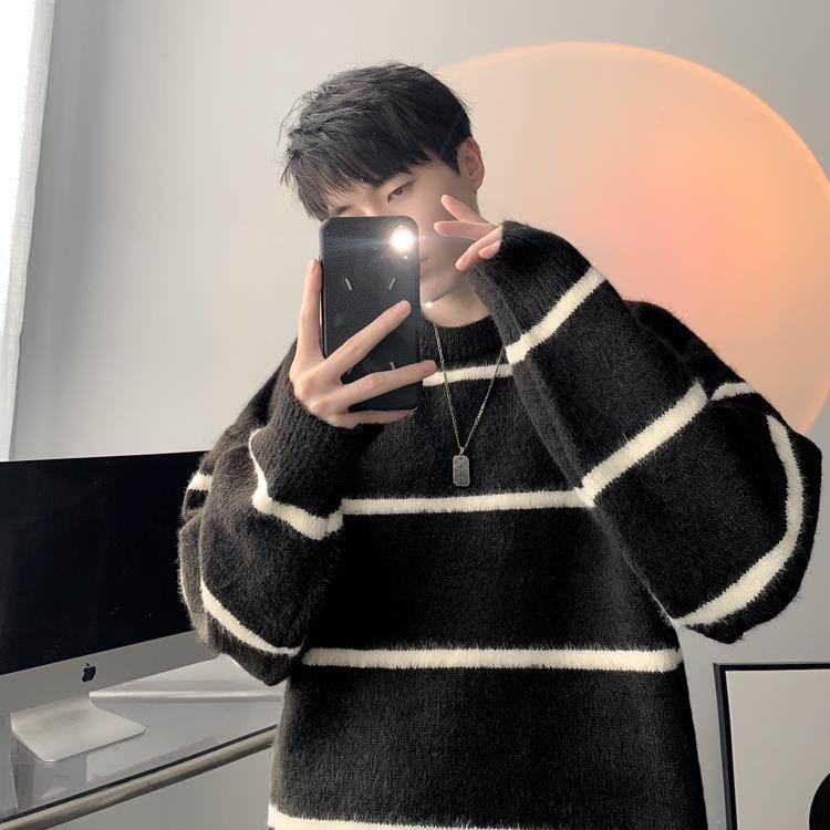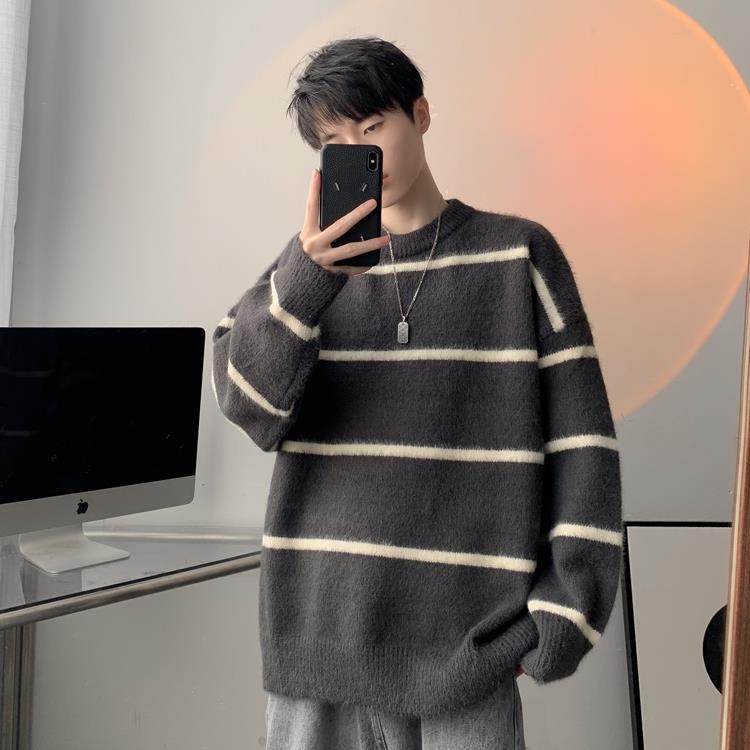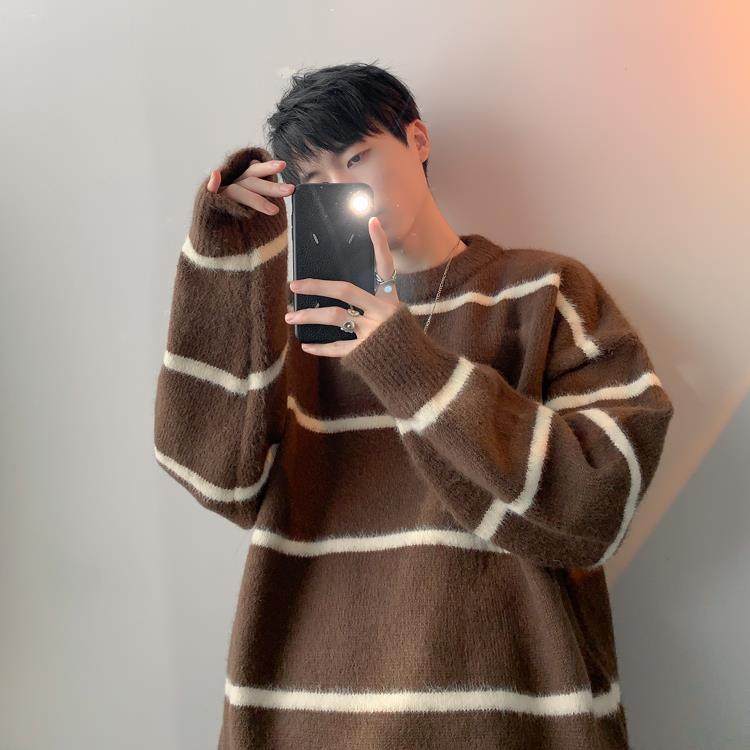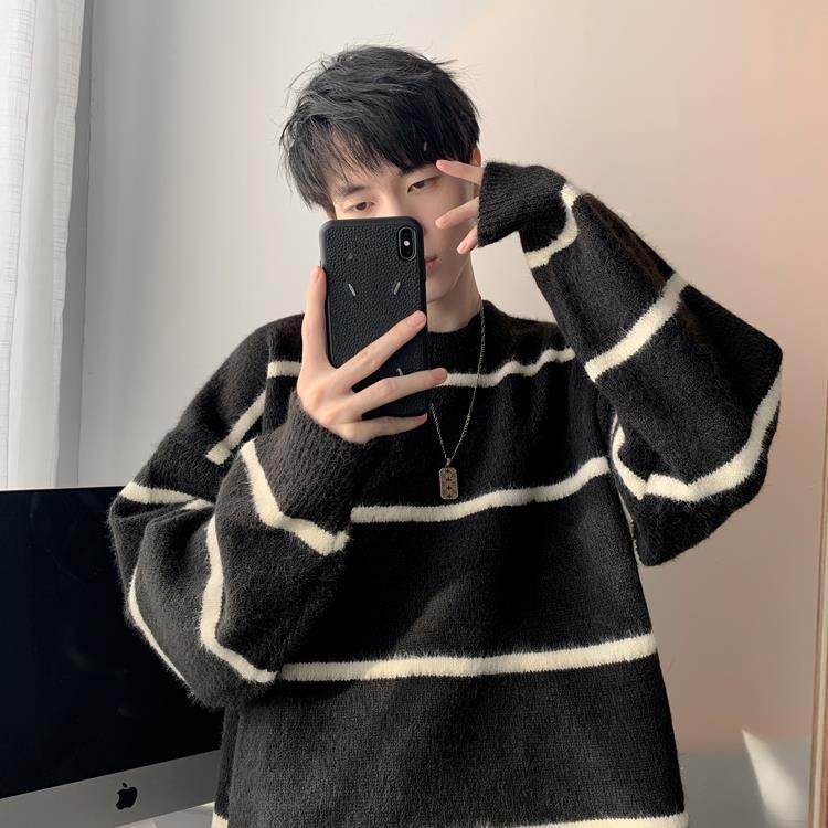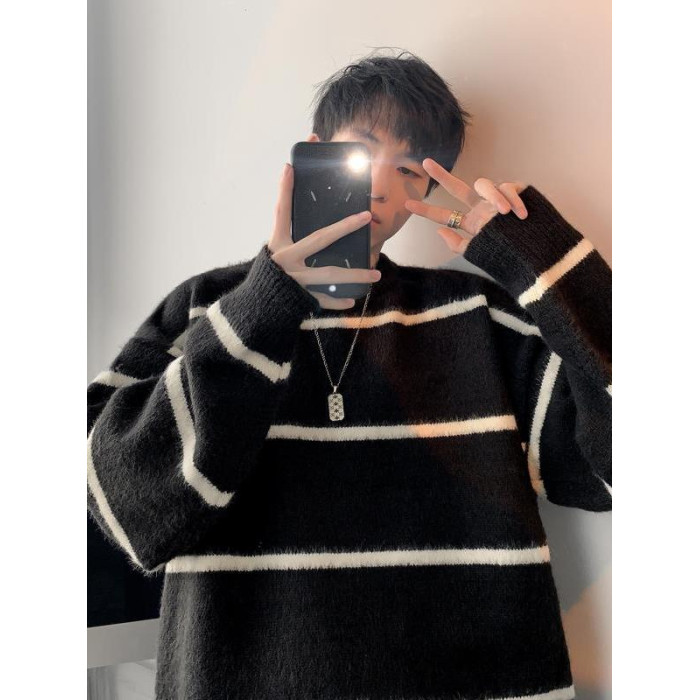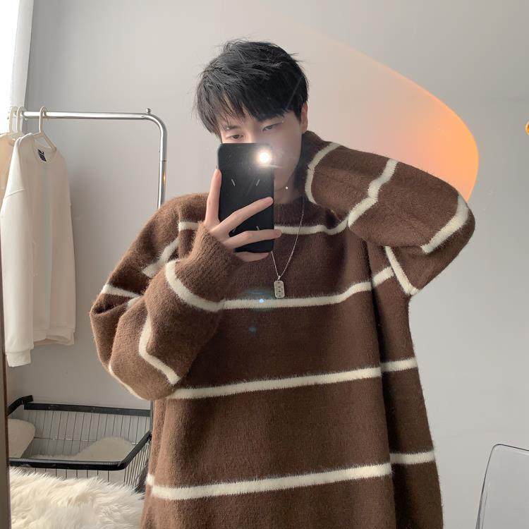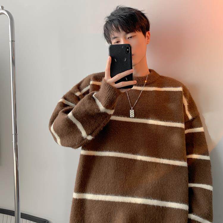 大碼300斤慵懶風條紋毛衣男秋冬季美式潮牌高級感軟糯毛絨針織衫2