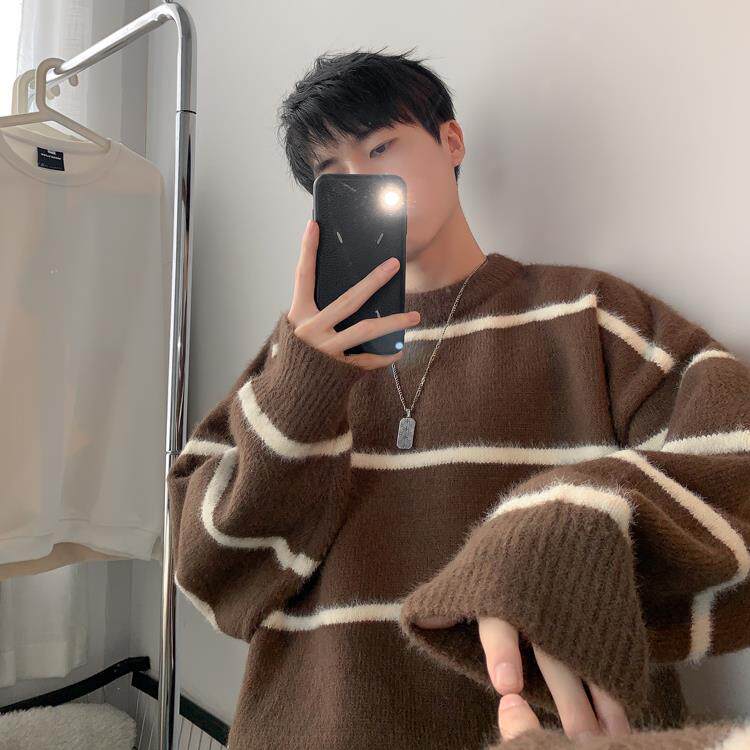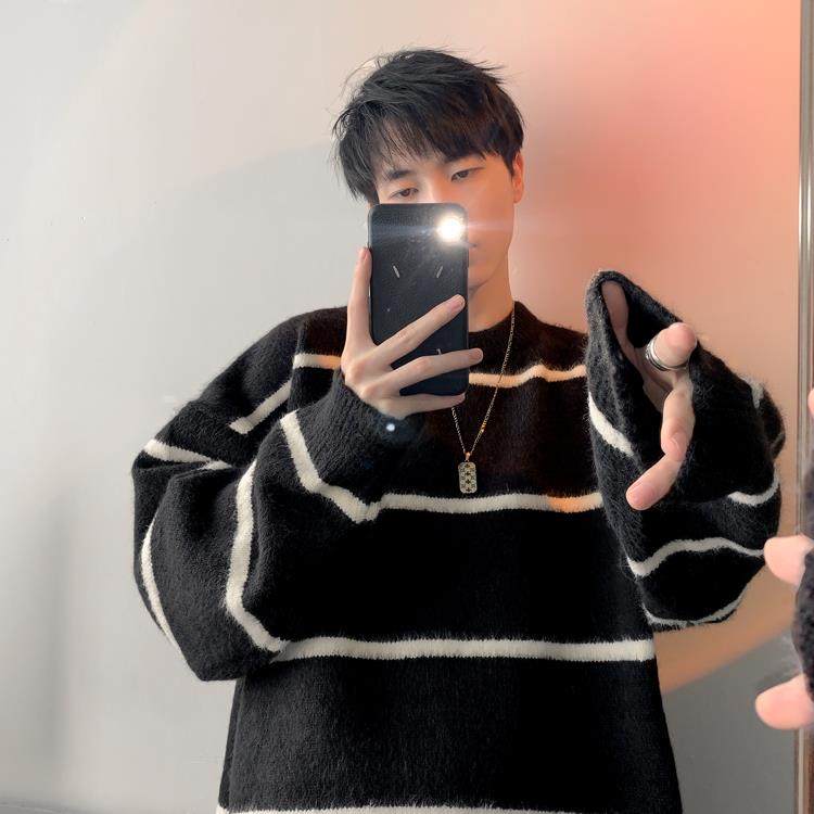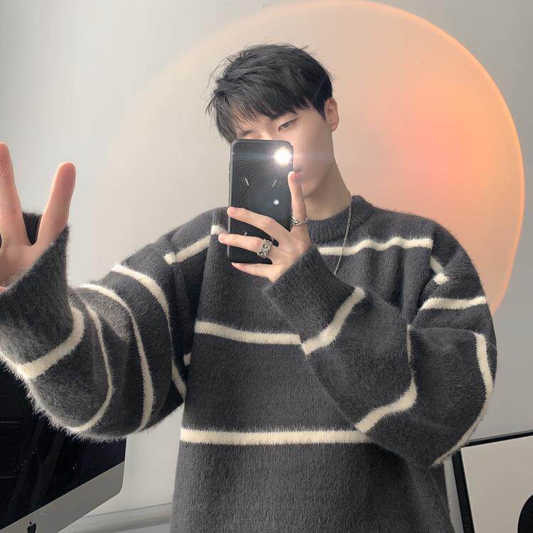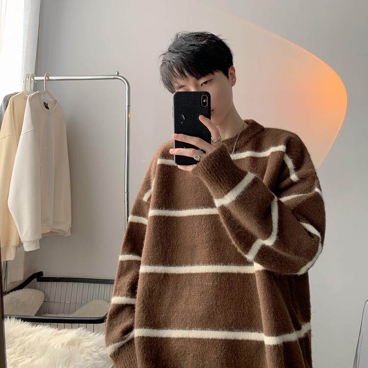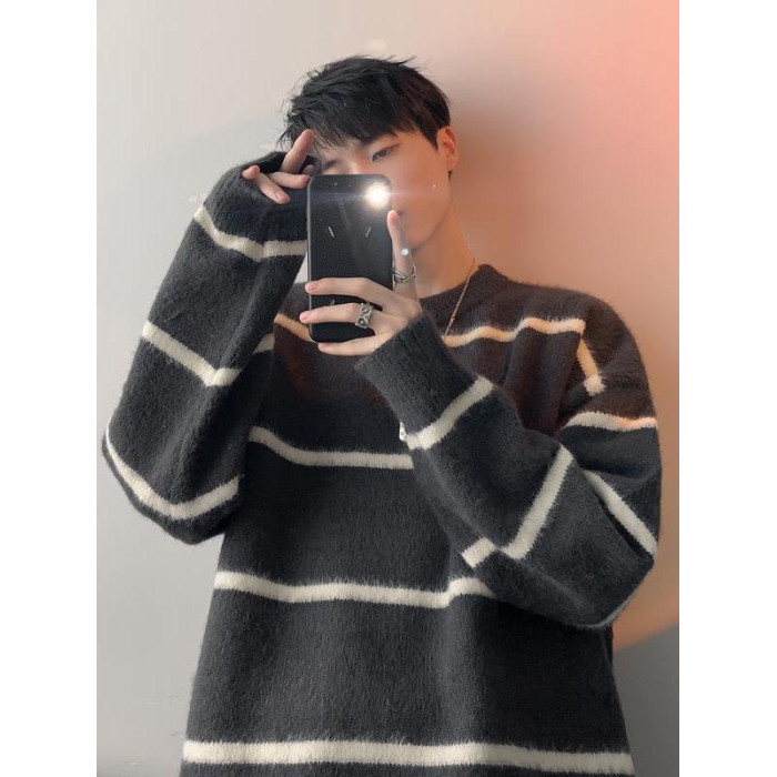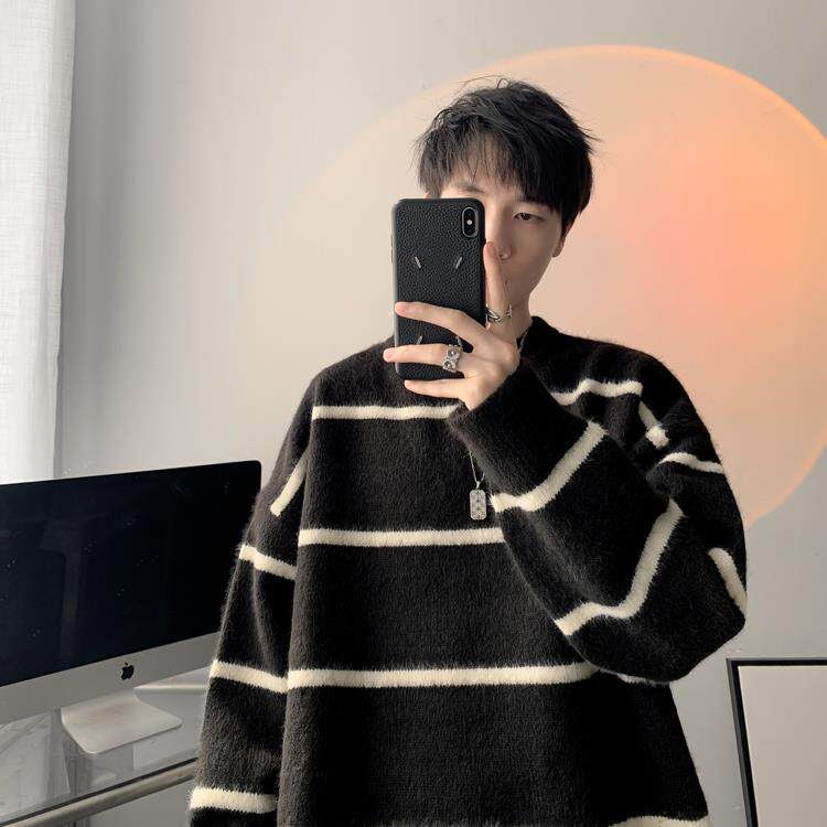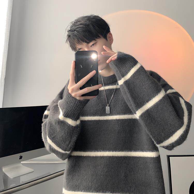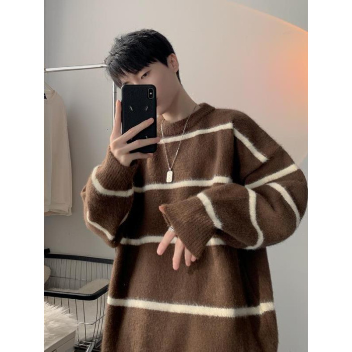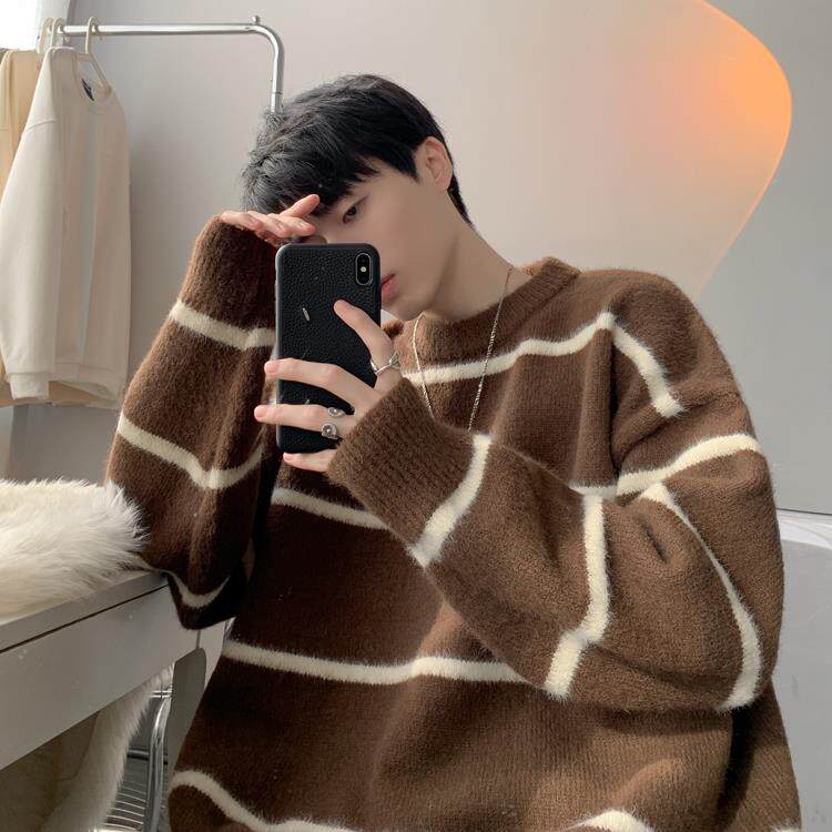 大碼300斤慵懶風條紋毛衣男秋冬季美式潮牌高級感軟糯毛絨針織衫2