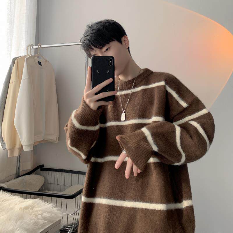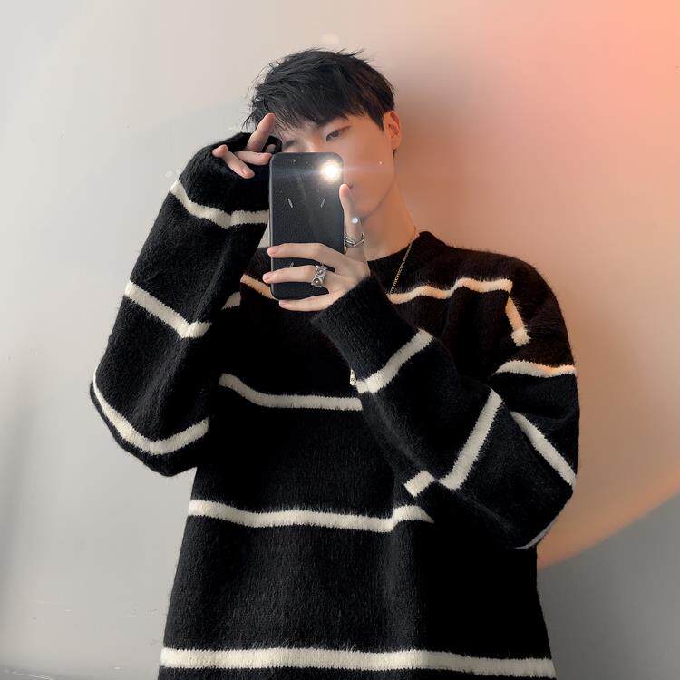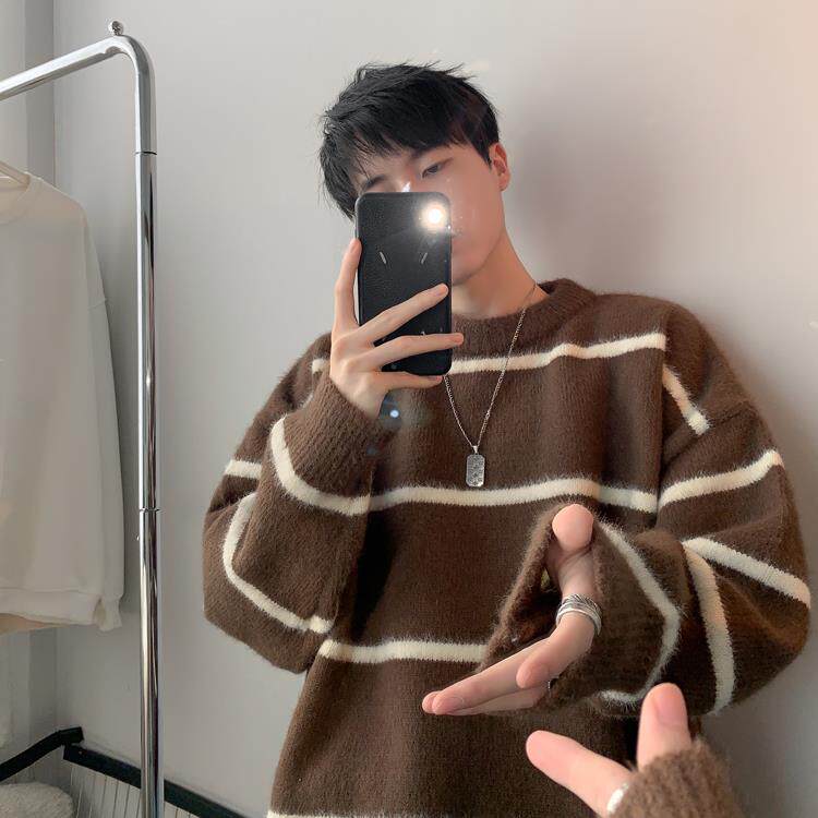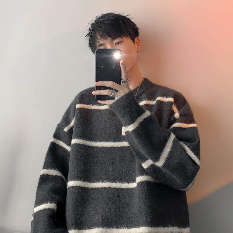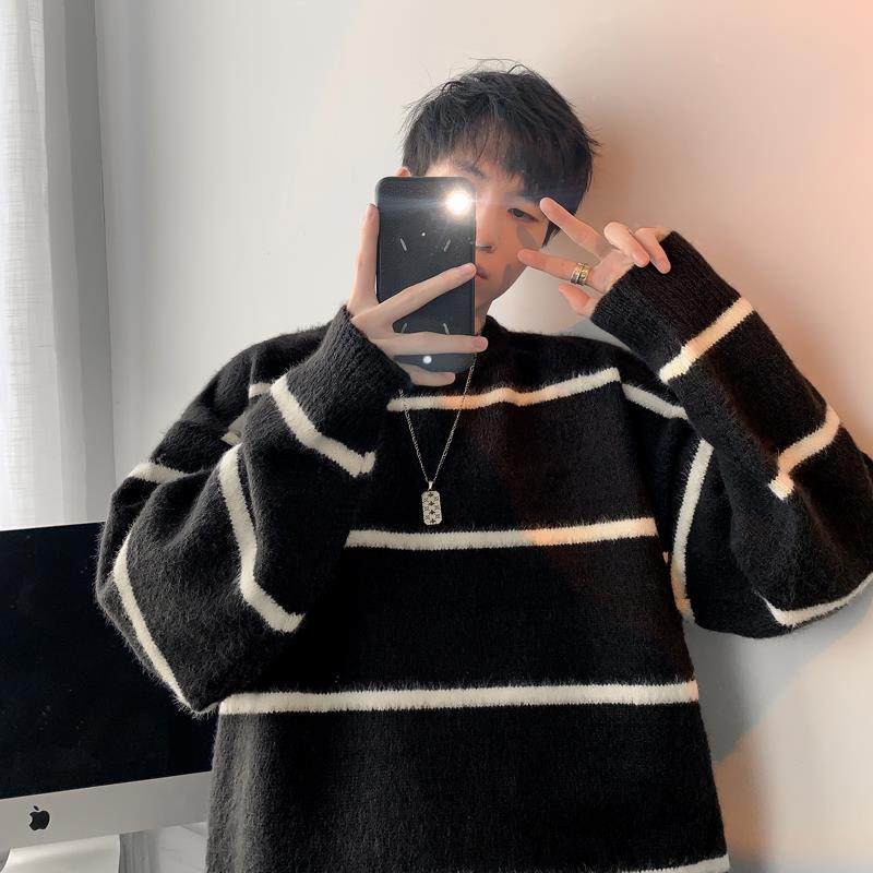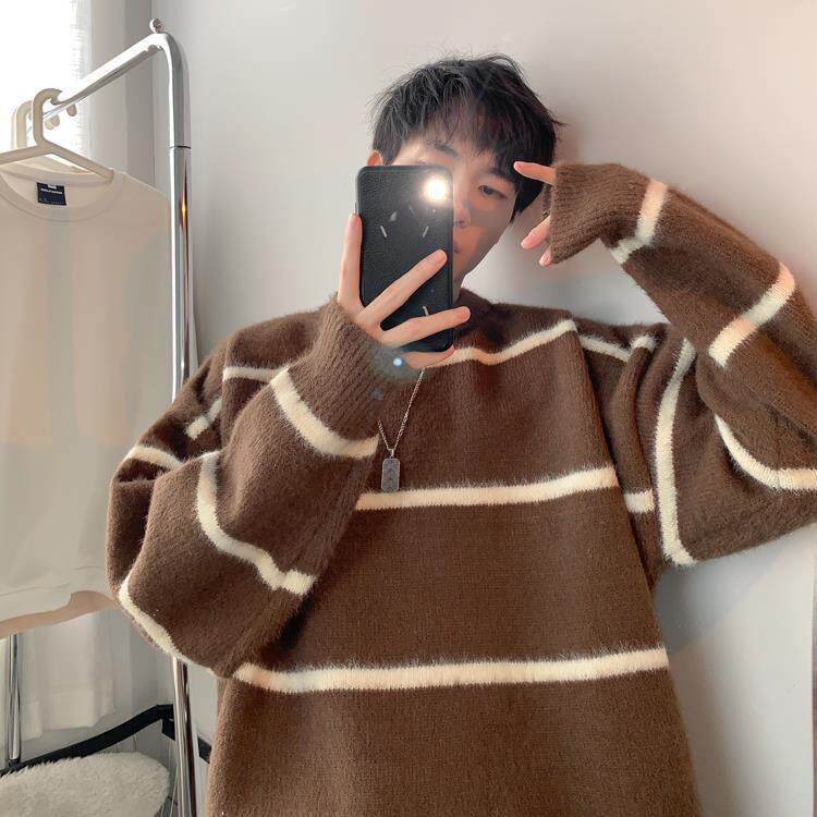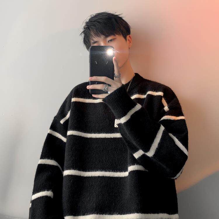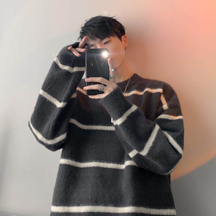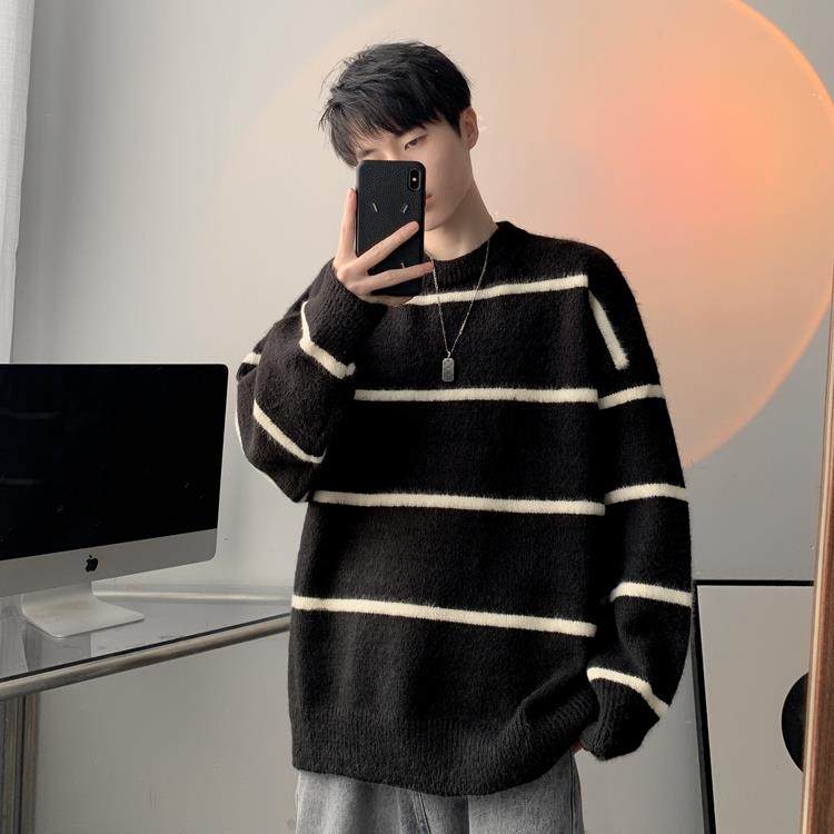 大碼300斤慵懶風條紋毛衣男秋冬季美式潮牌高級感軟糯毛絨針織衫2