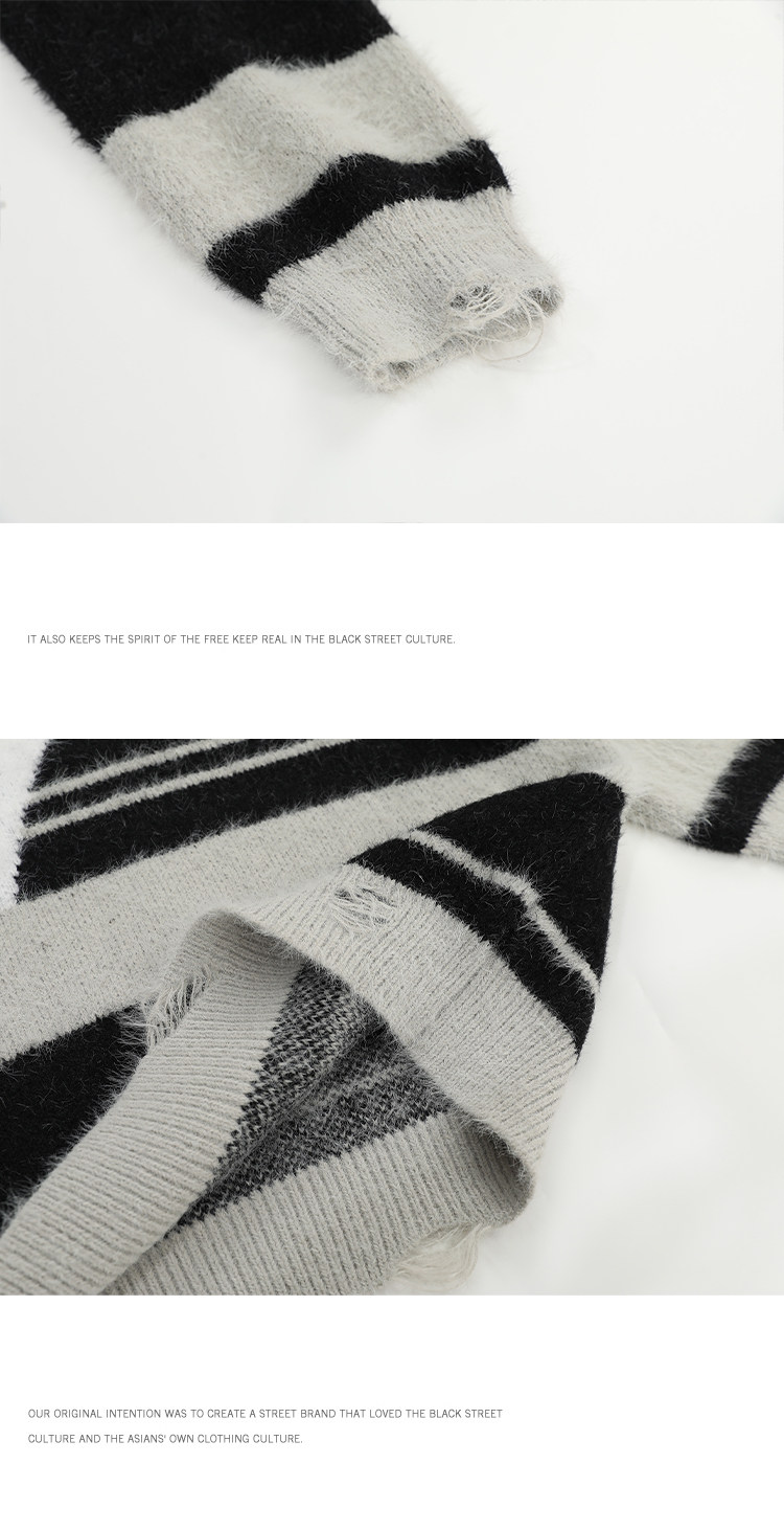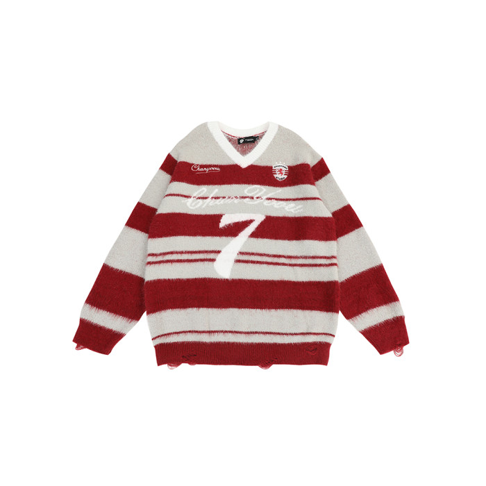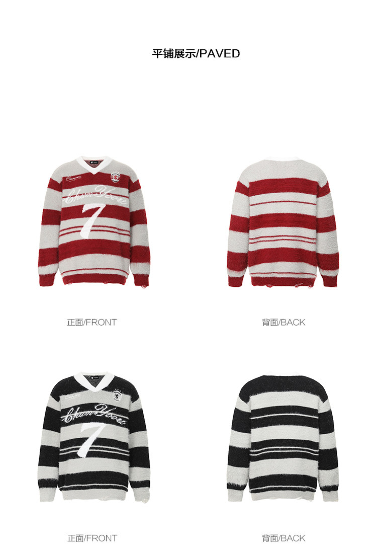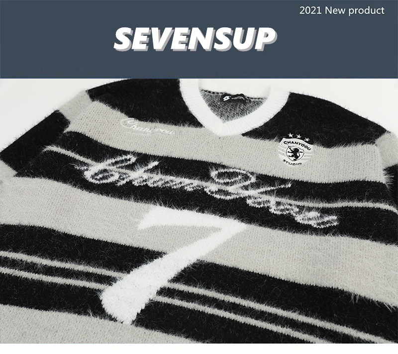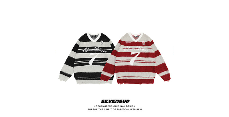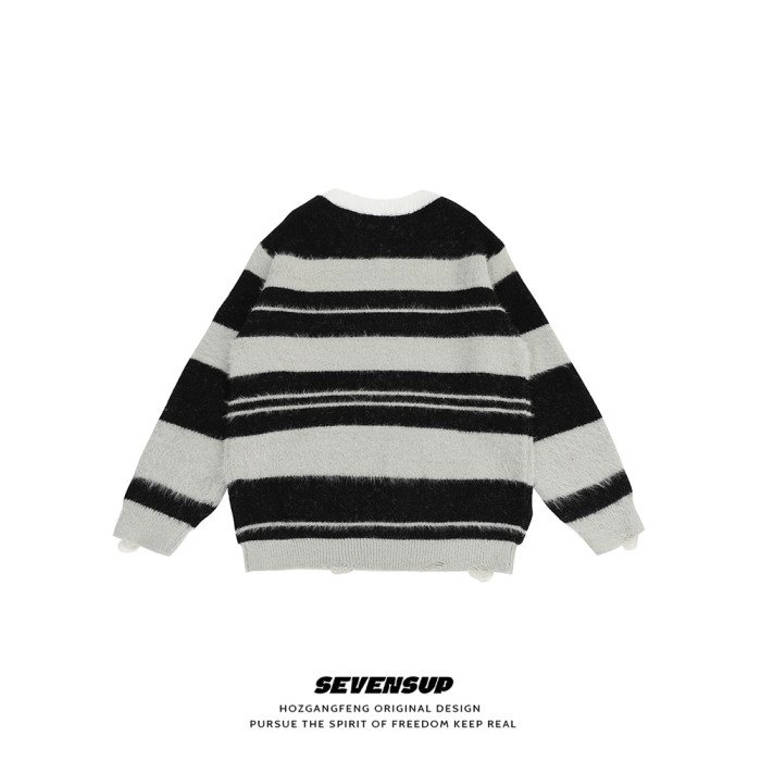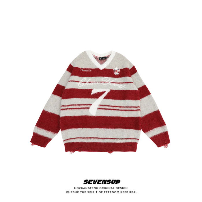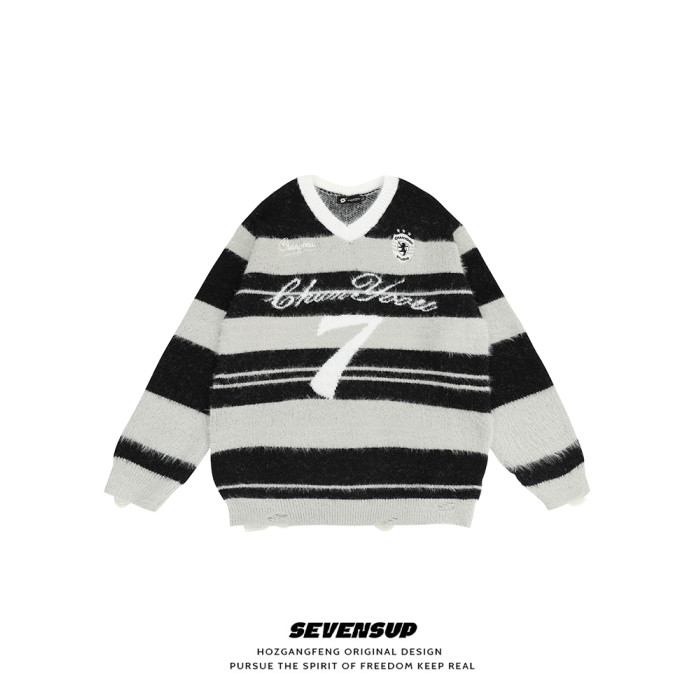 SEVENSUP美式學院風馬海毛條紋V領毛衣男秋冬慵懶風情侶針織球衣