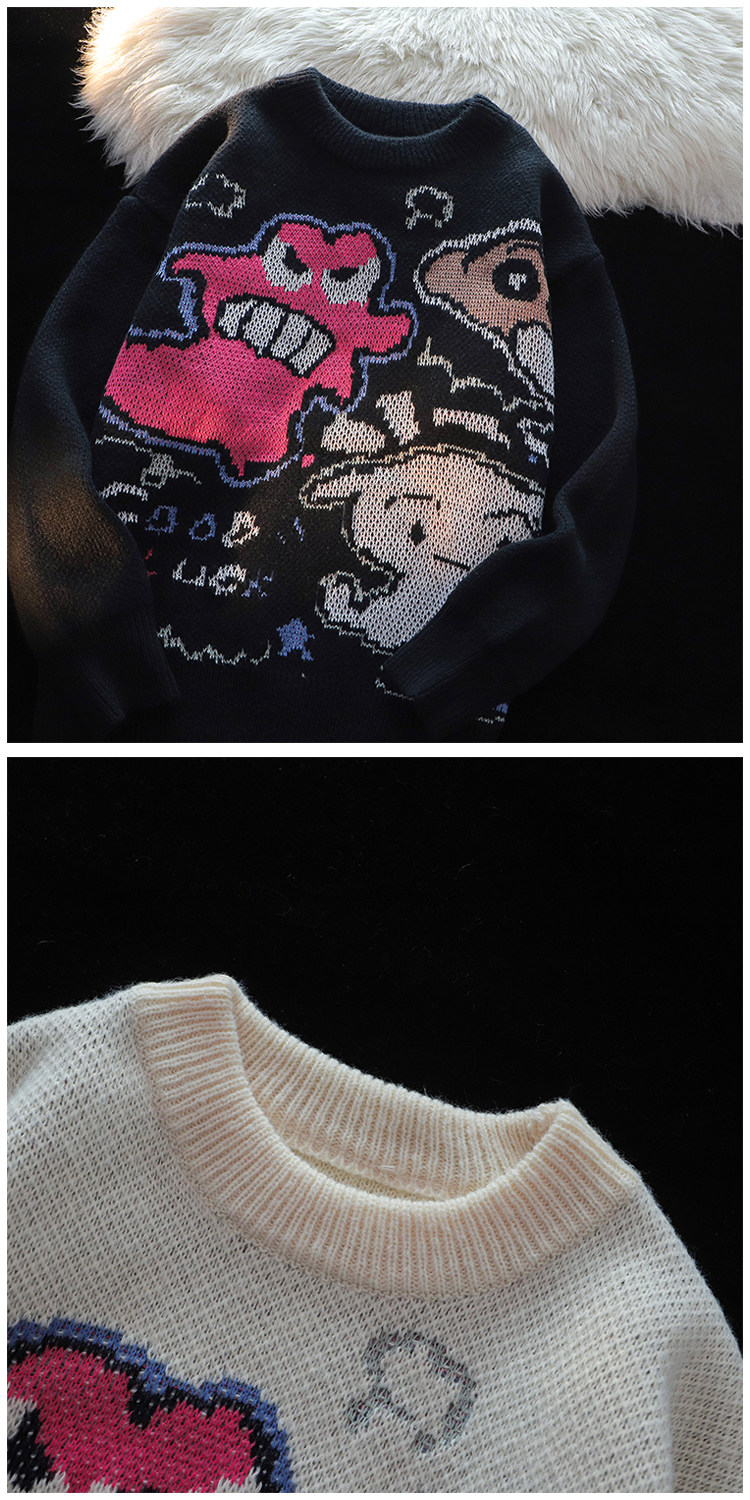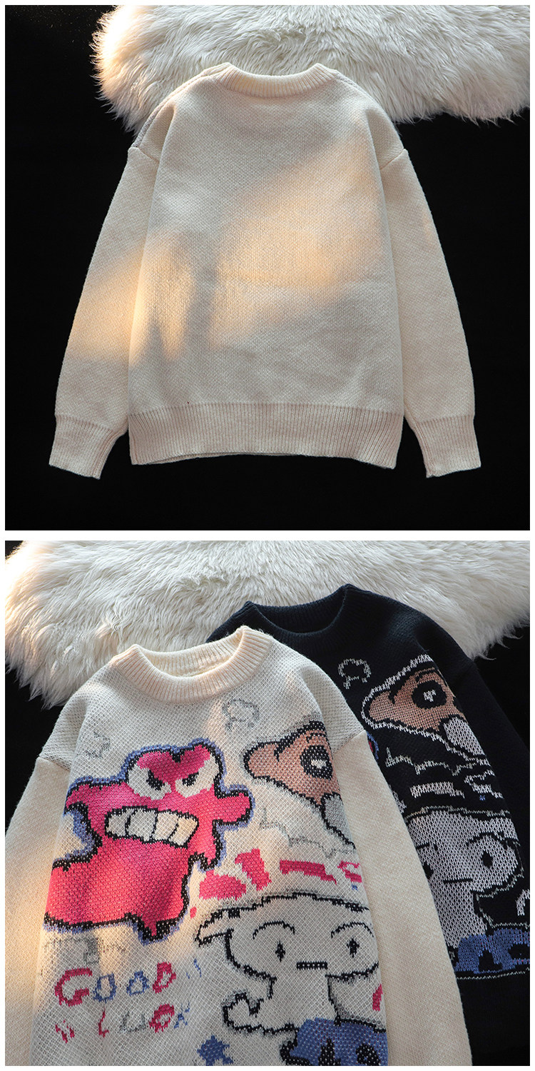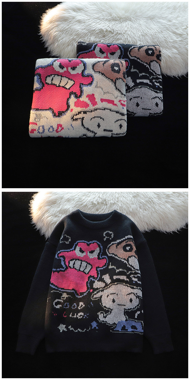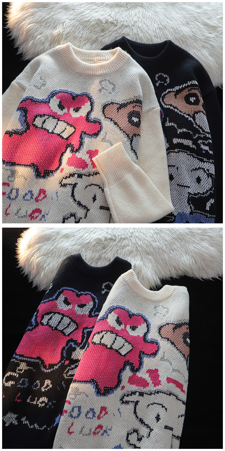 卡通蠟筆小新提花毛衣男女秋冬季寬松情侶上衣圓領情侶長袖針織衫