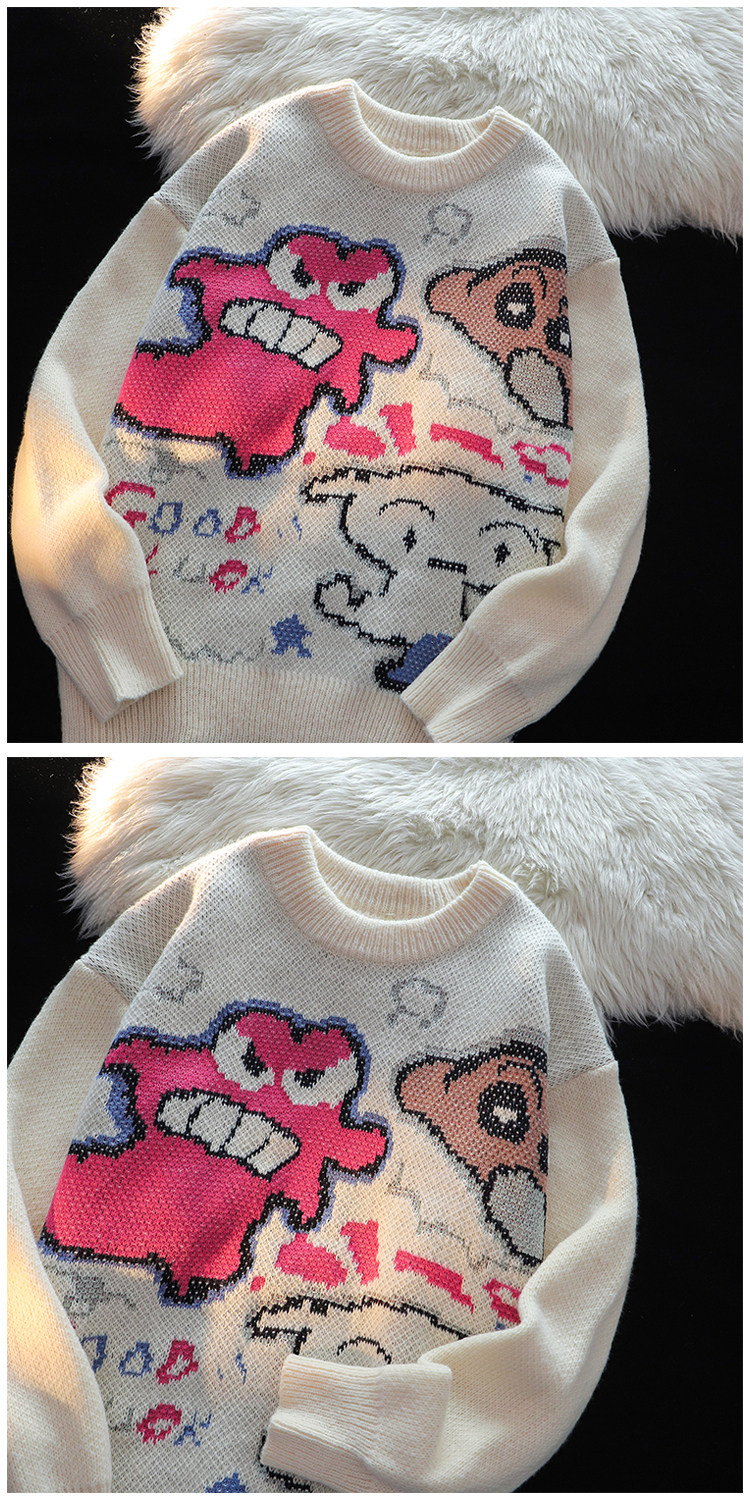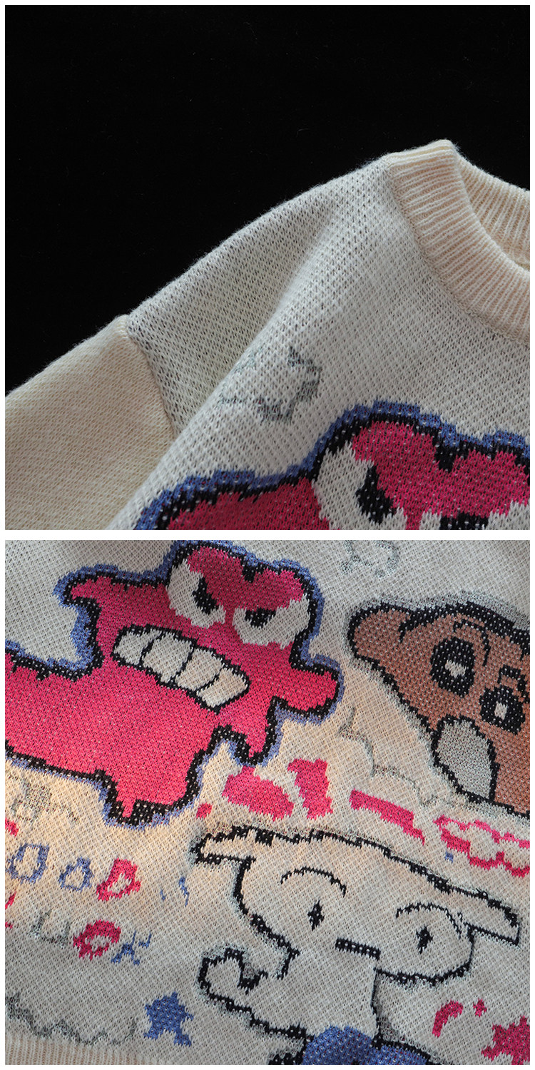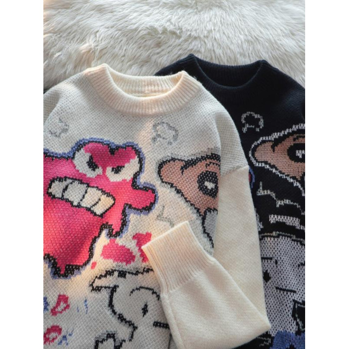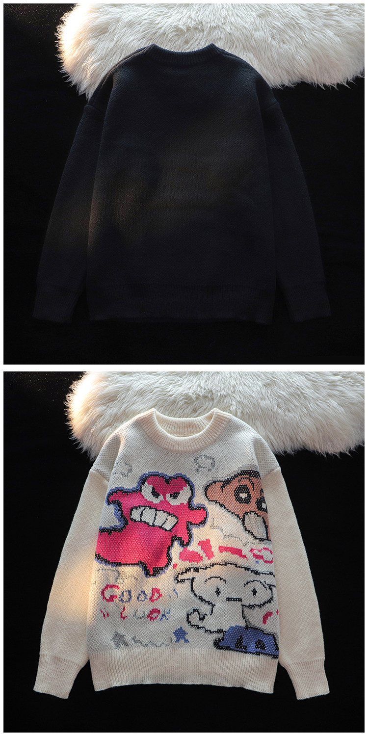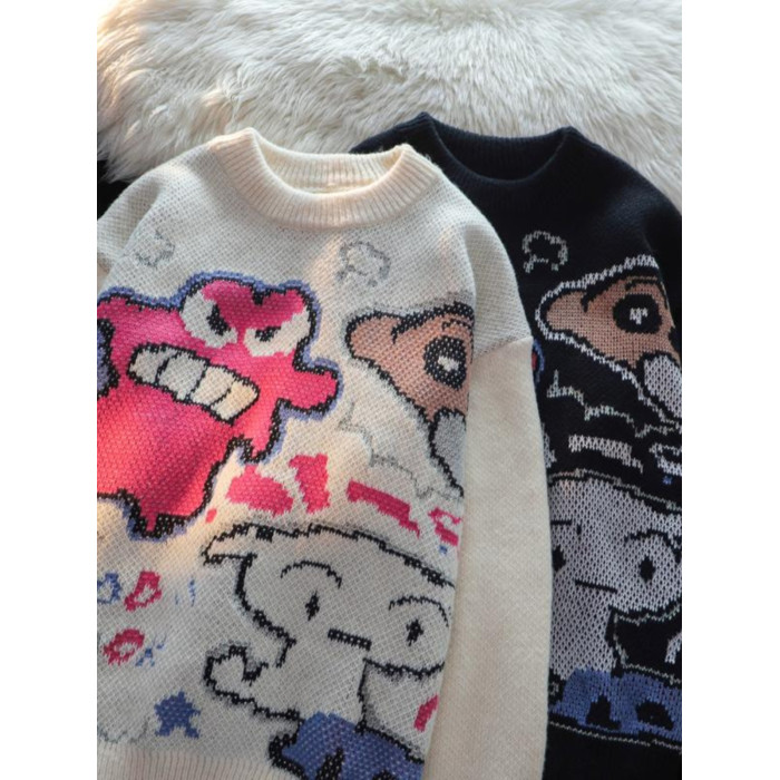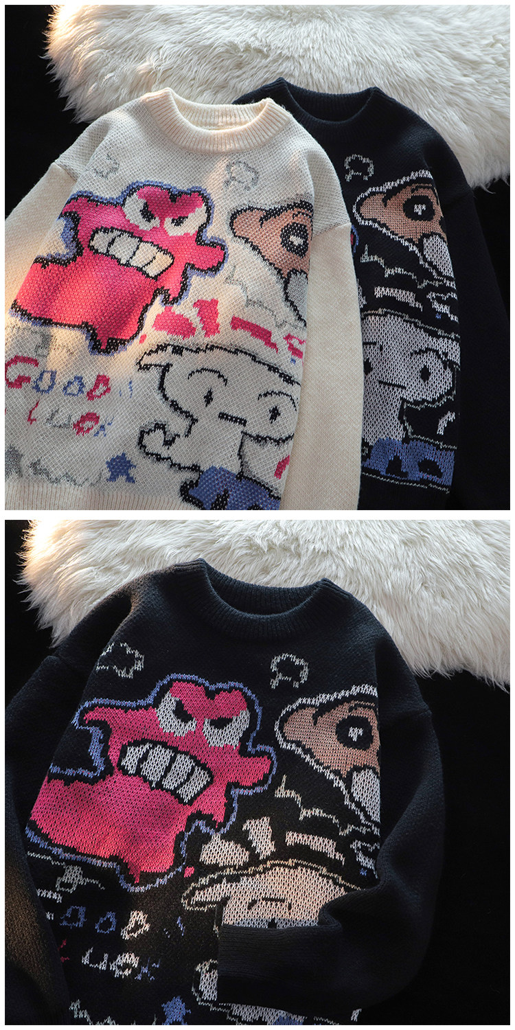 卡通蠟筆小新提花毛衣男女秋冬季寬松情侶上衣圓領情侶長袖針織衫