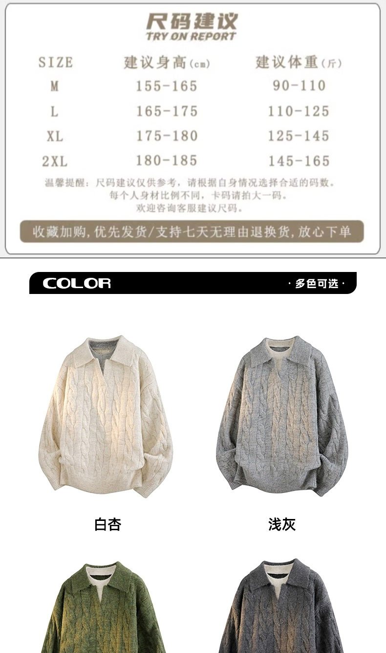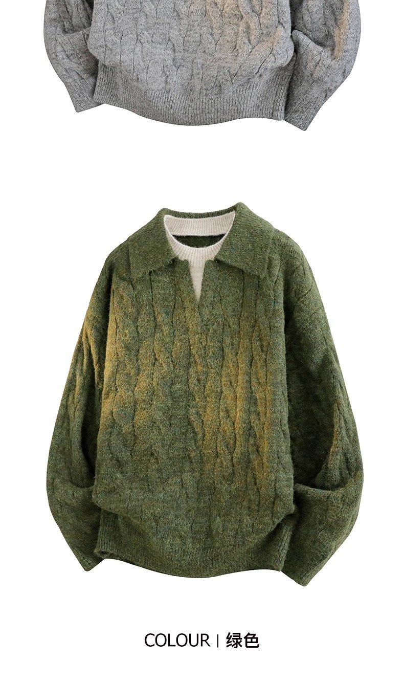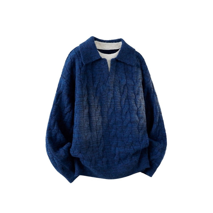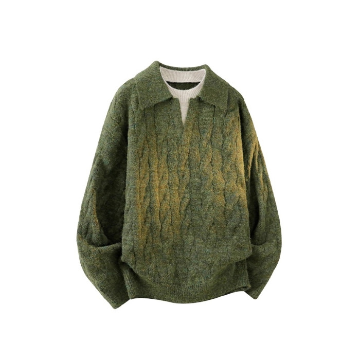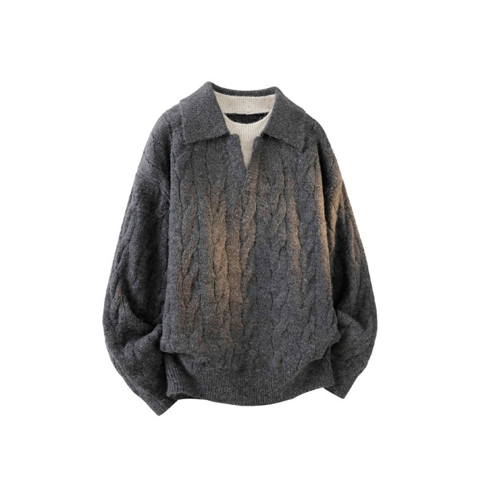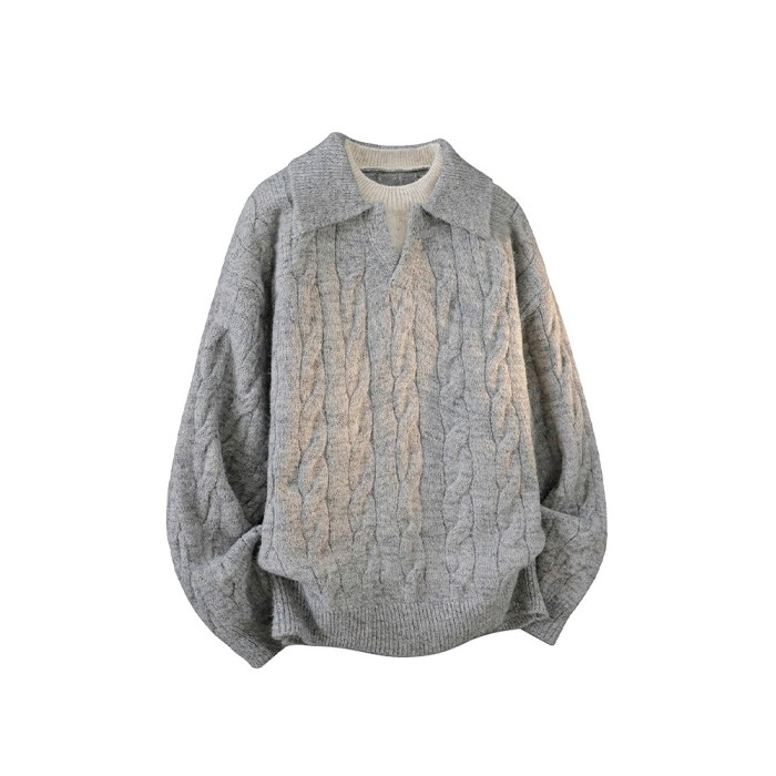 老錢風假兩件翻領毛衣男秋冬慵懶風內搭保暖寬松休閒上衣針織線衫