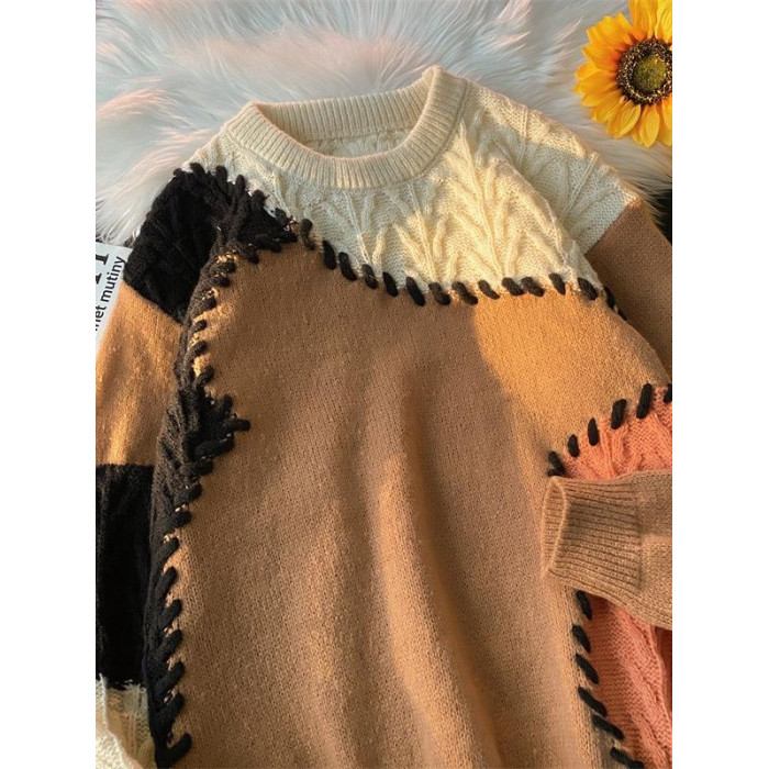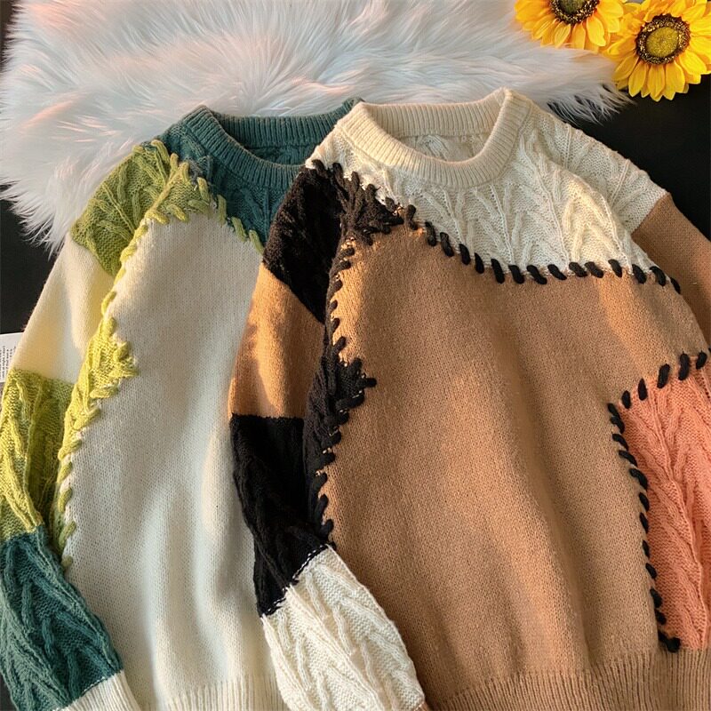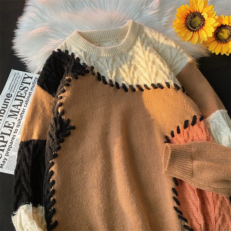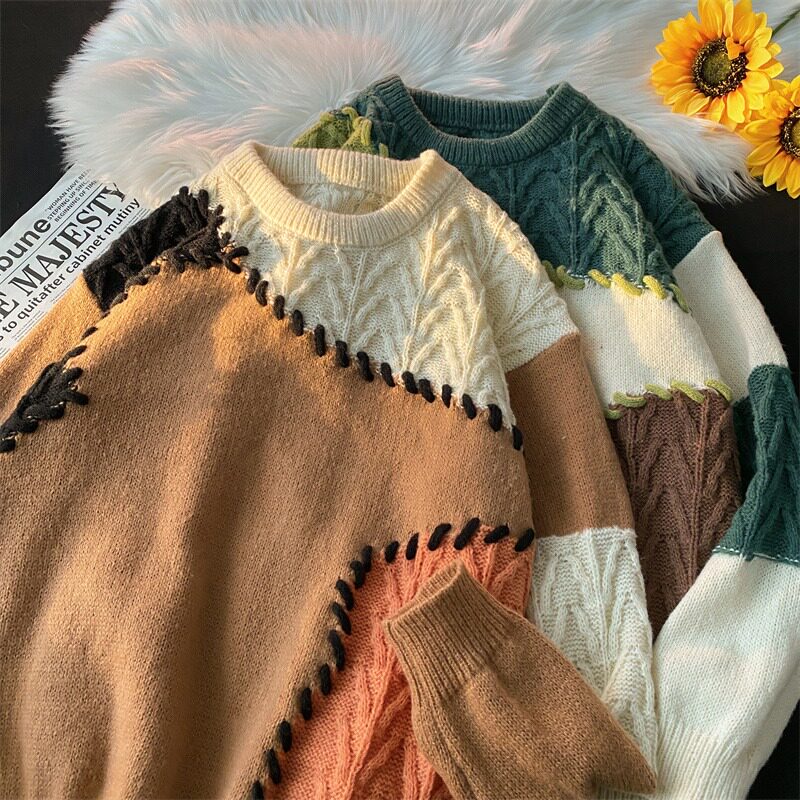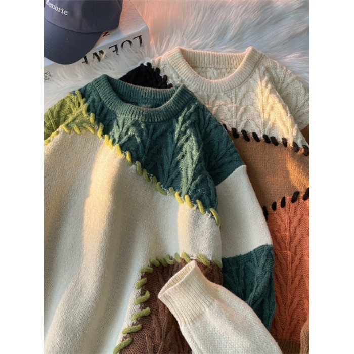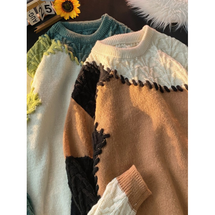 日系復古不規則撞色慵懶風毛衣男秋冬潮牌寬松圓領手工編製針織衫