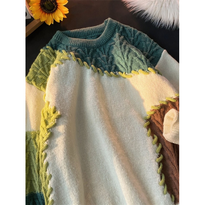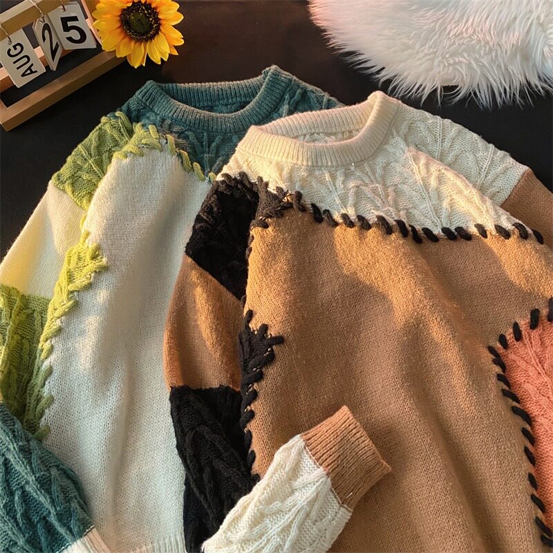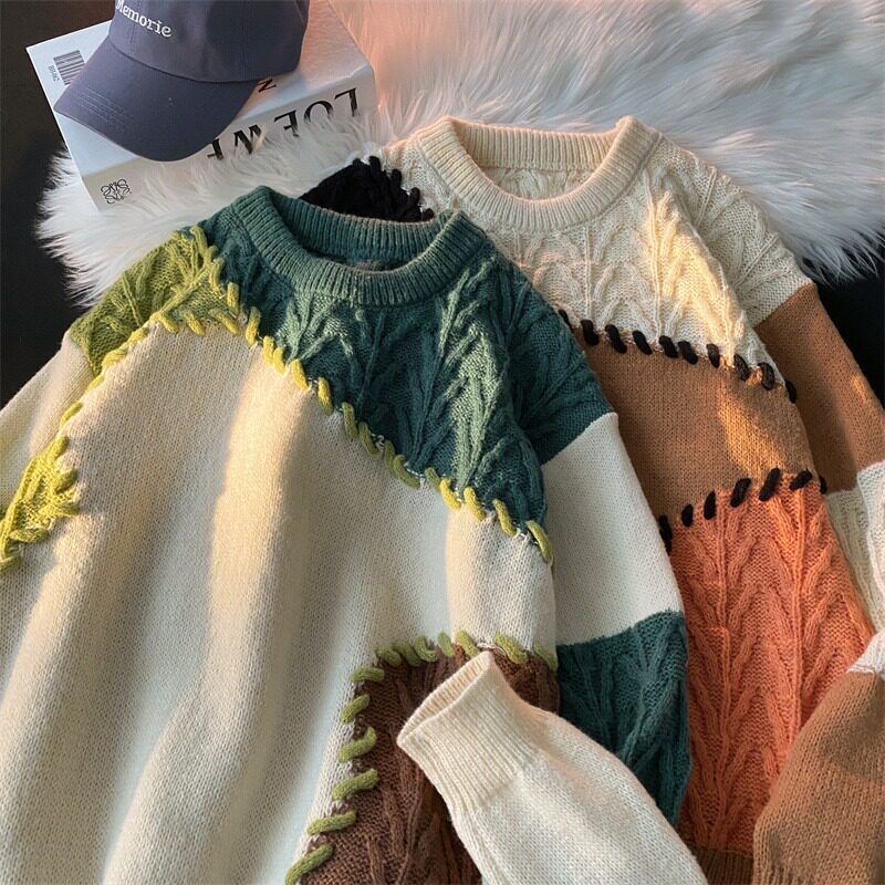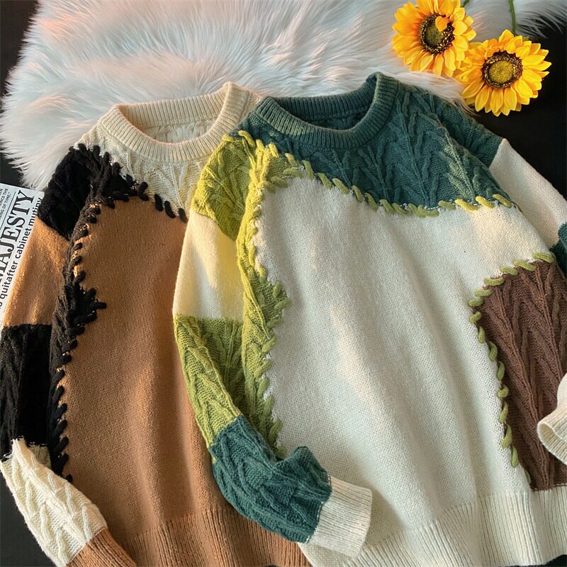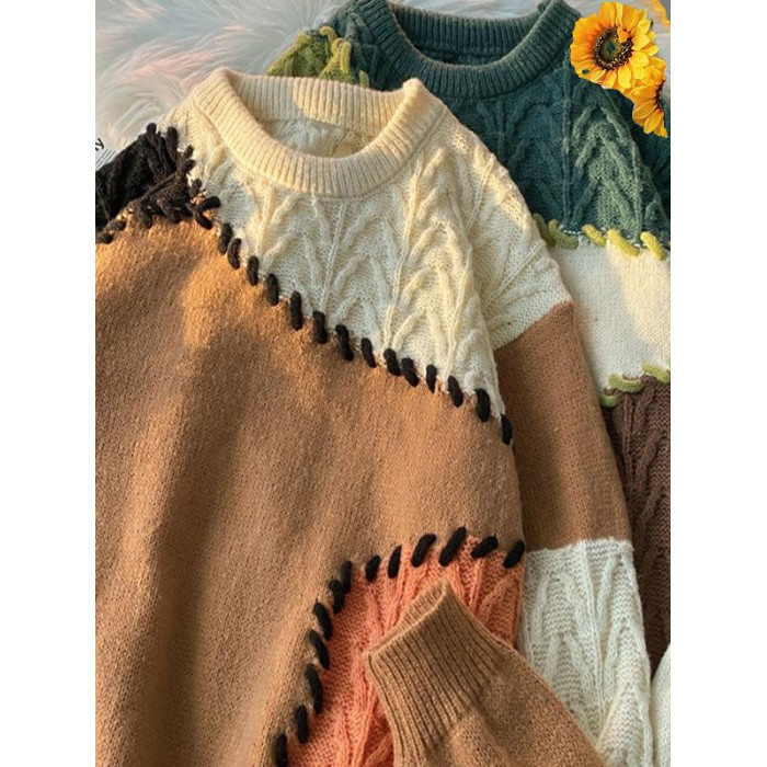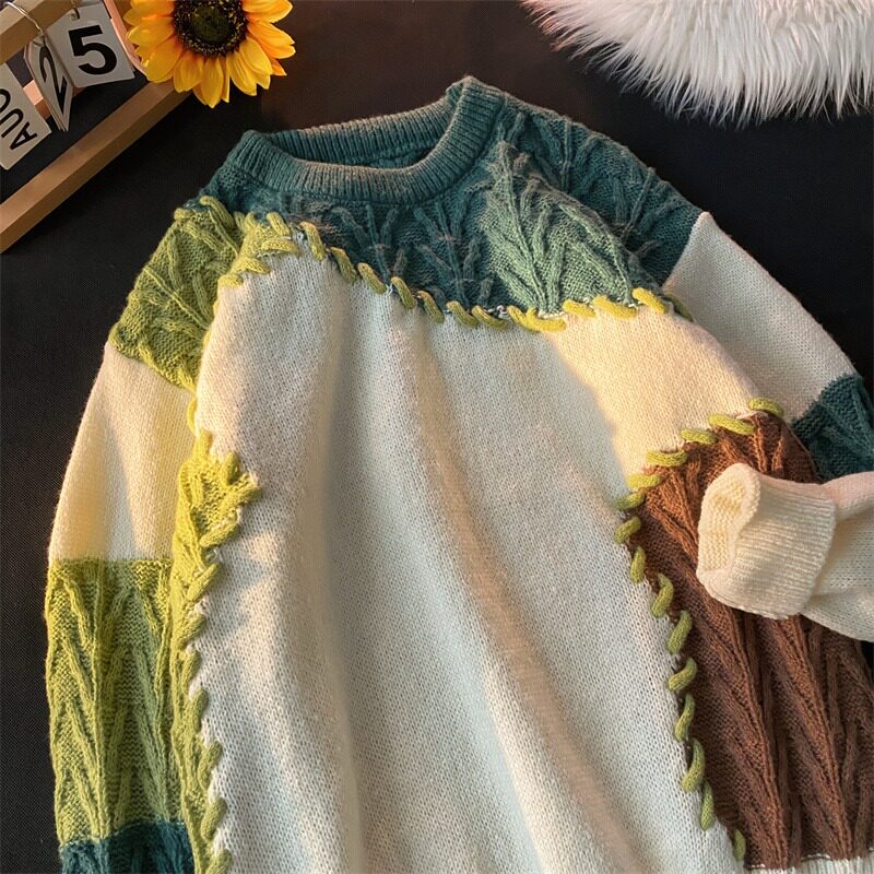 日系復古不規則撞色慵懶風毛衣男秋冬潮牌寬松圓領手工編製針織衫