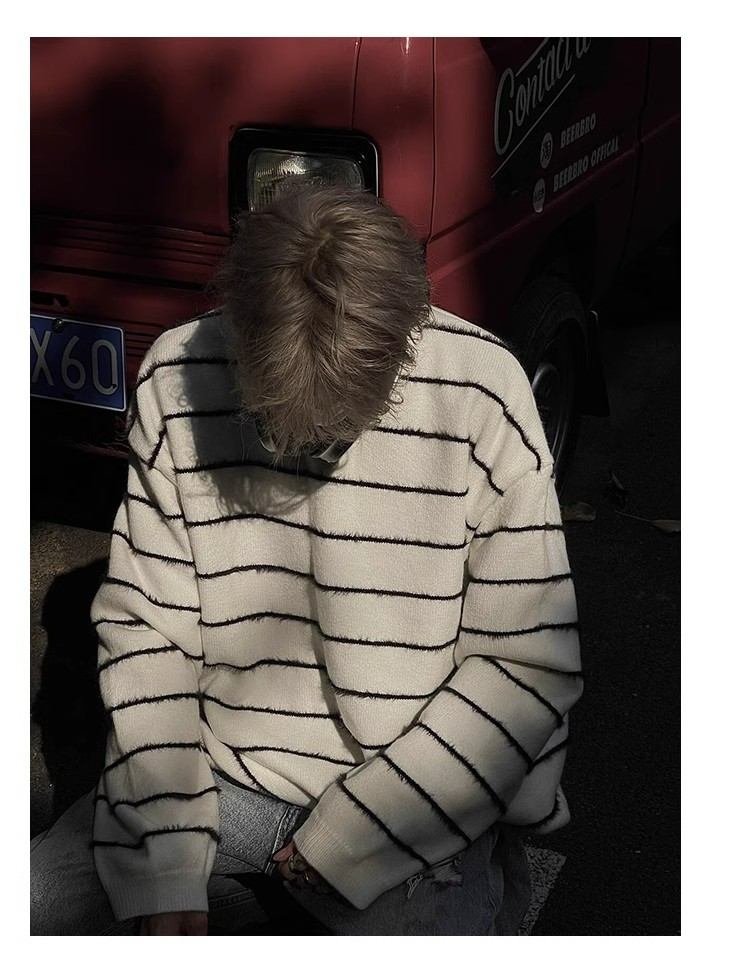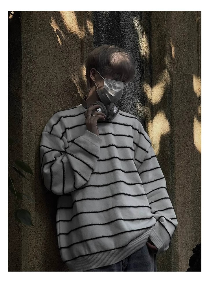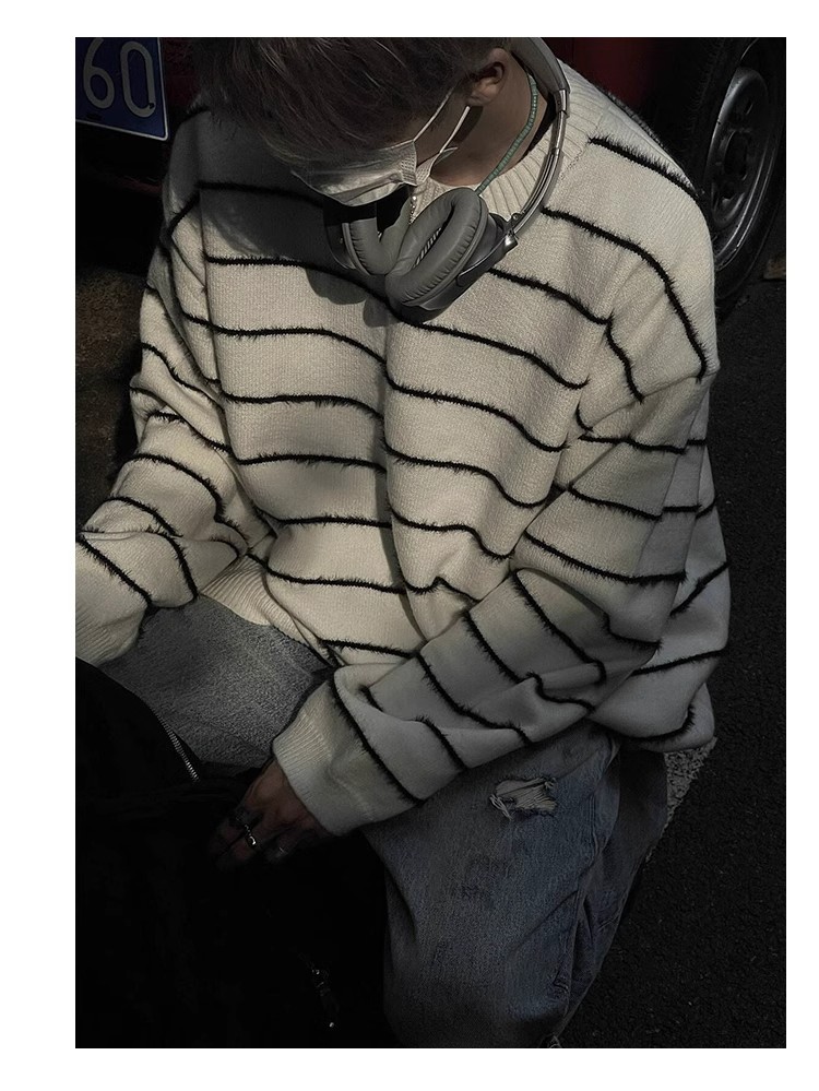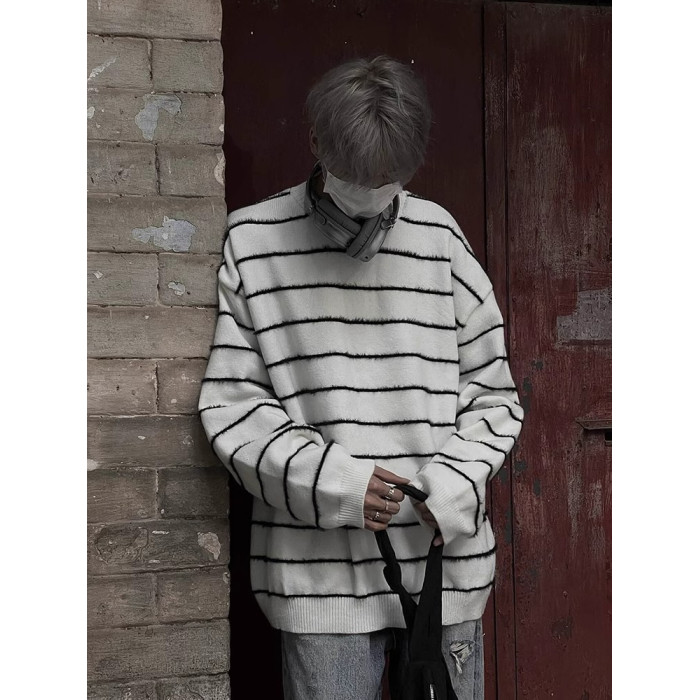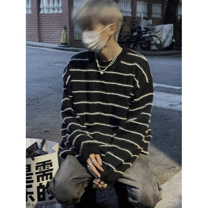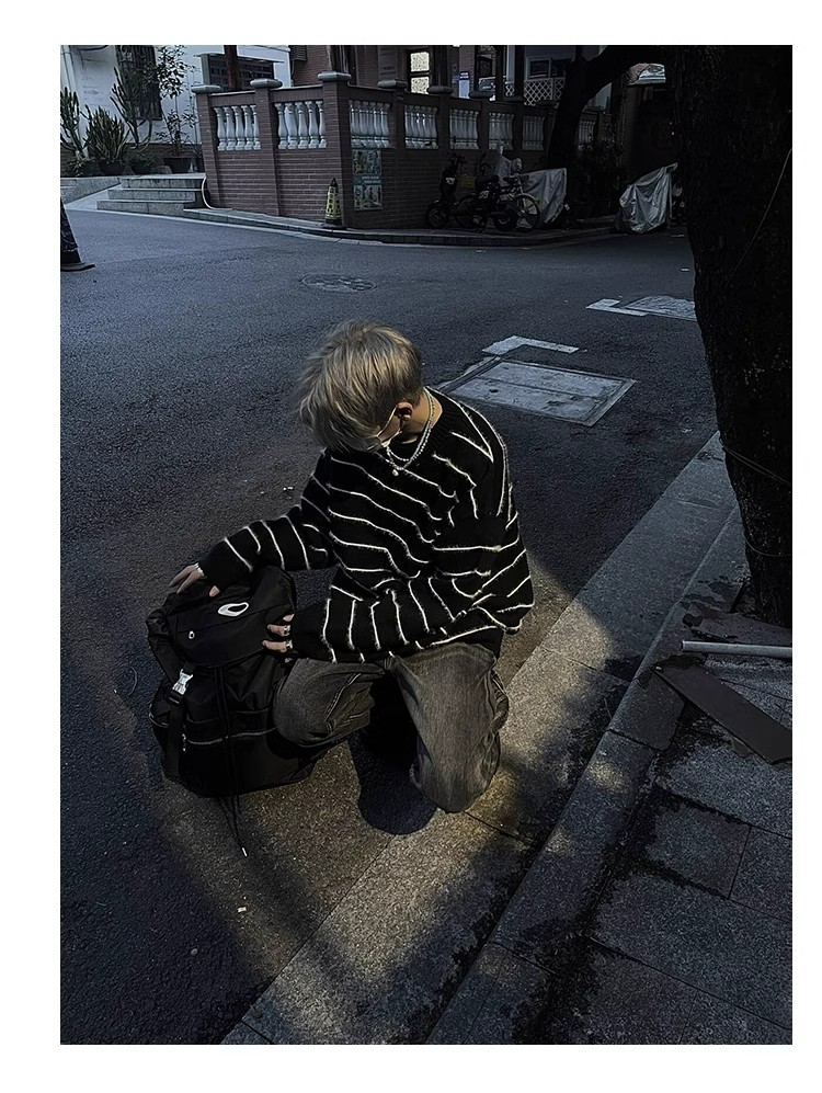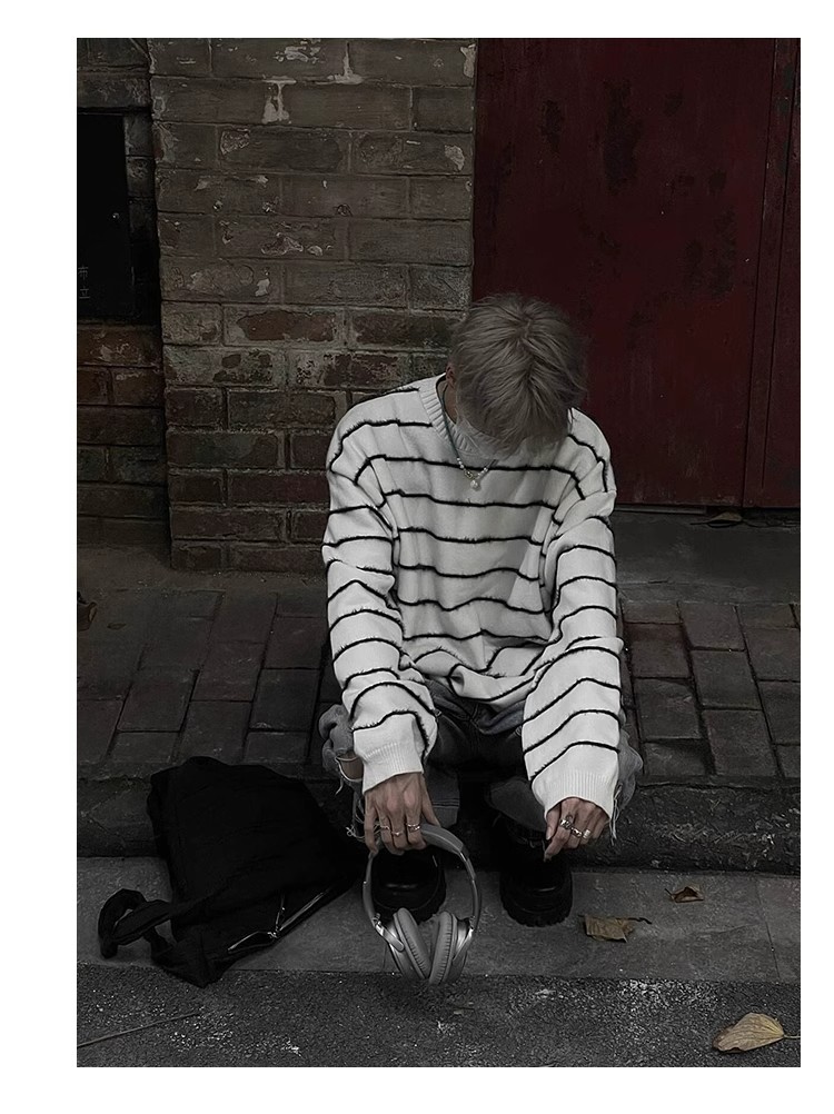 美式小衆設計感黑白條紋寬松套頭毛衣男女春秋休閒百搭針織衫上衣