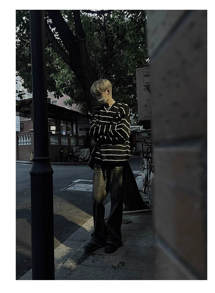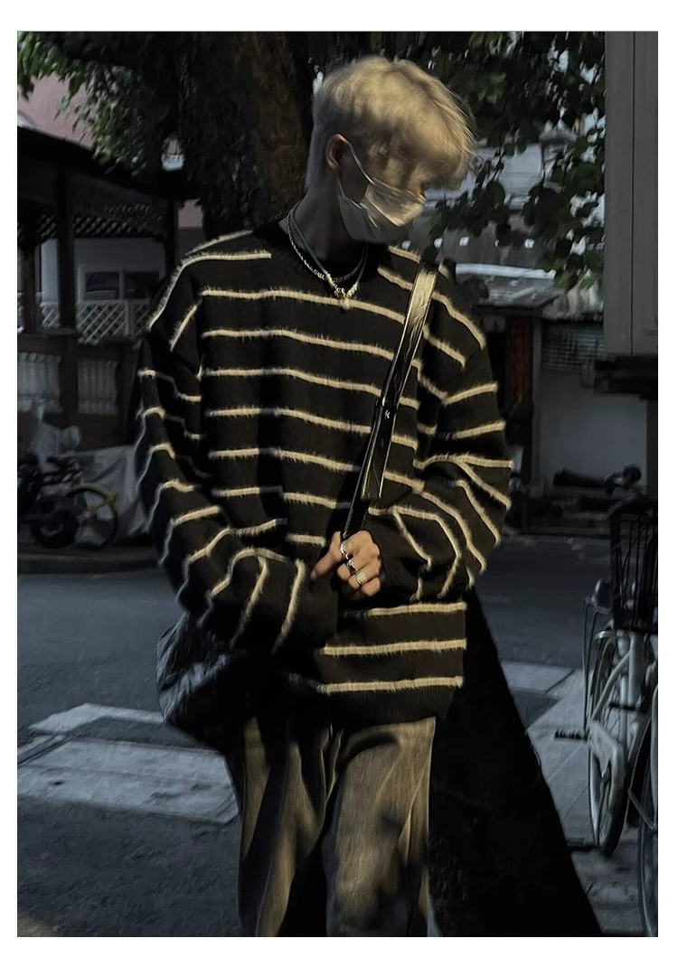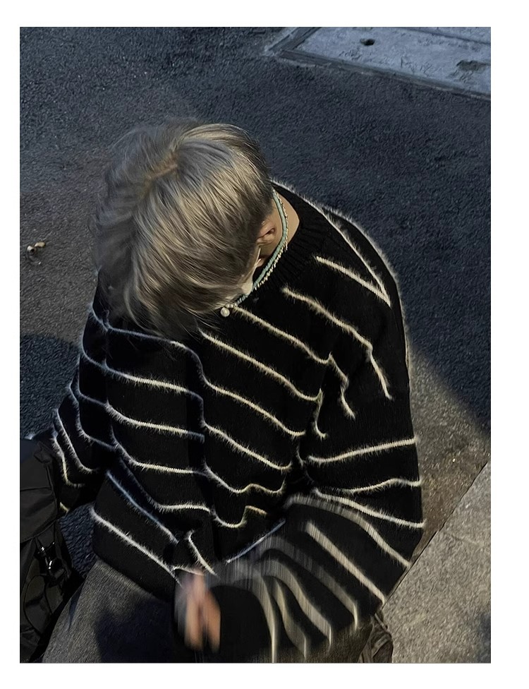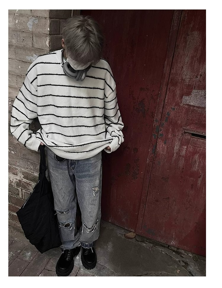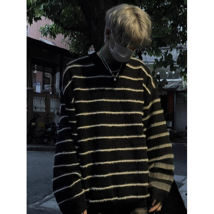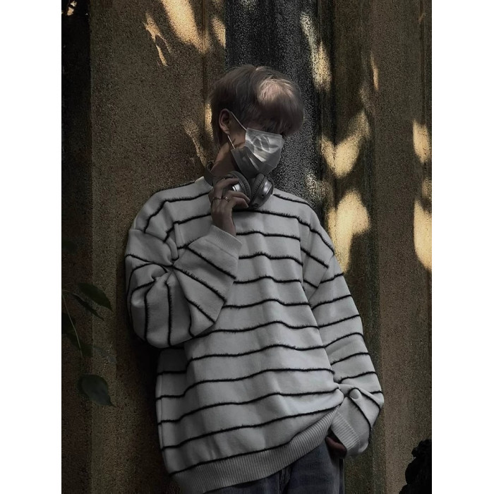 美式小衆設計感黑白條紋寬松套頭毛衣男女春秋休閒百搭針織衫上衣