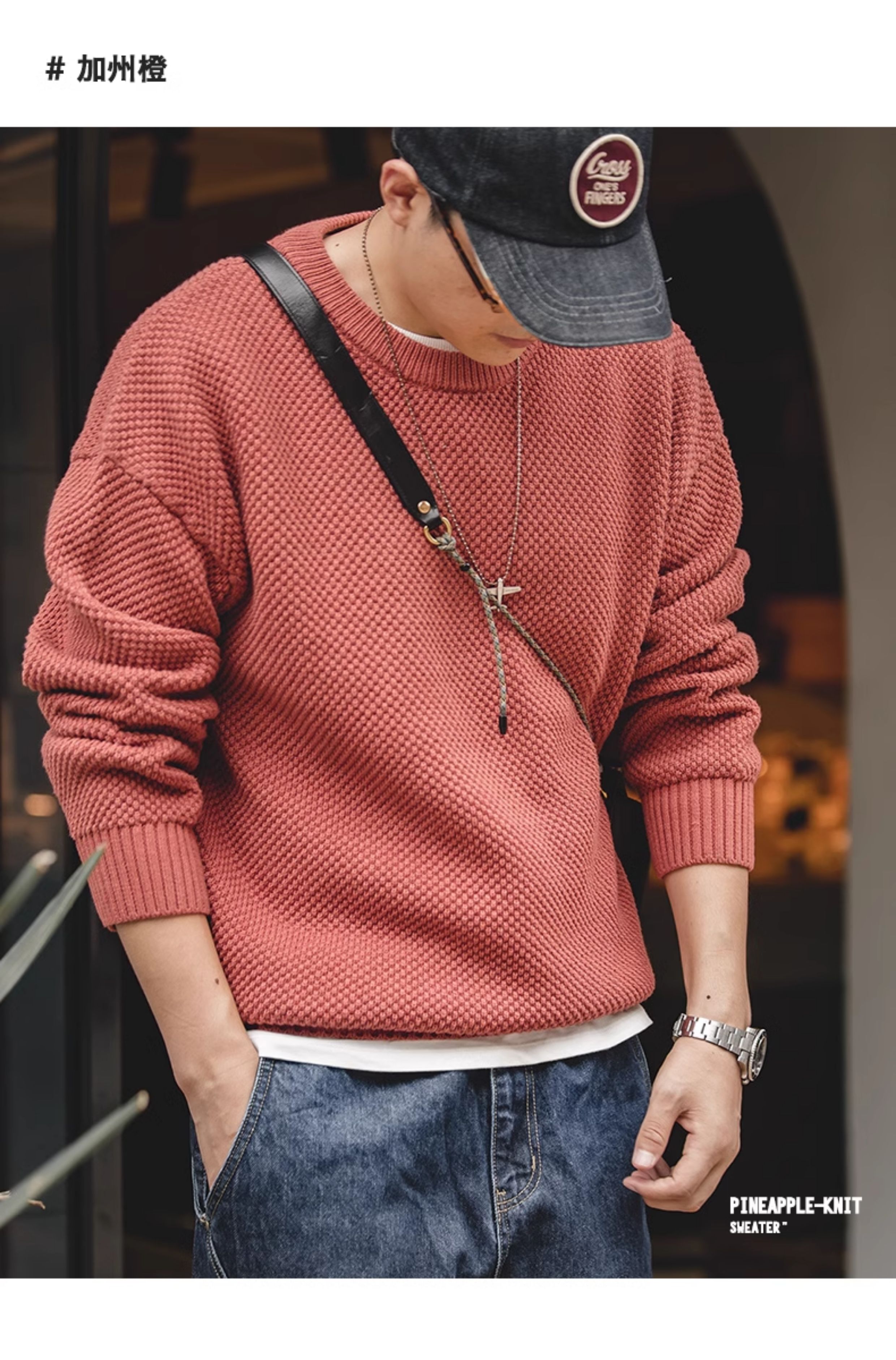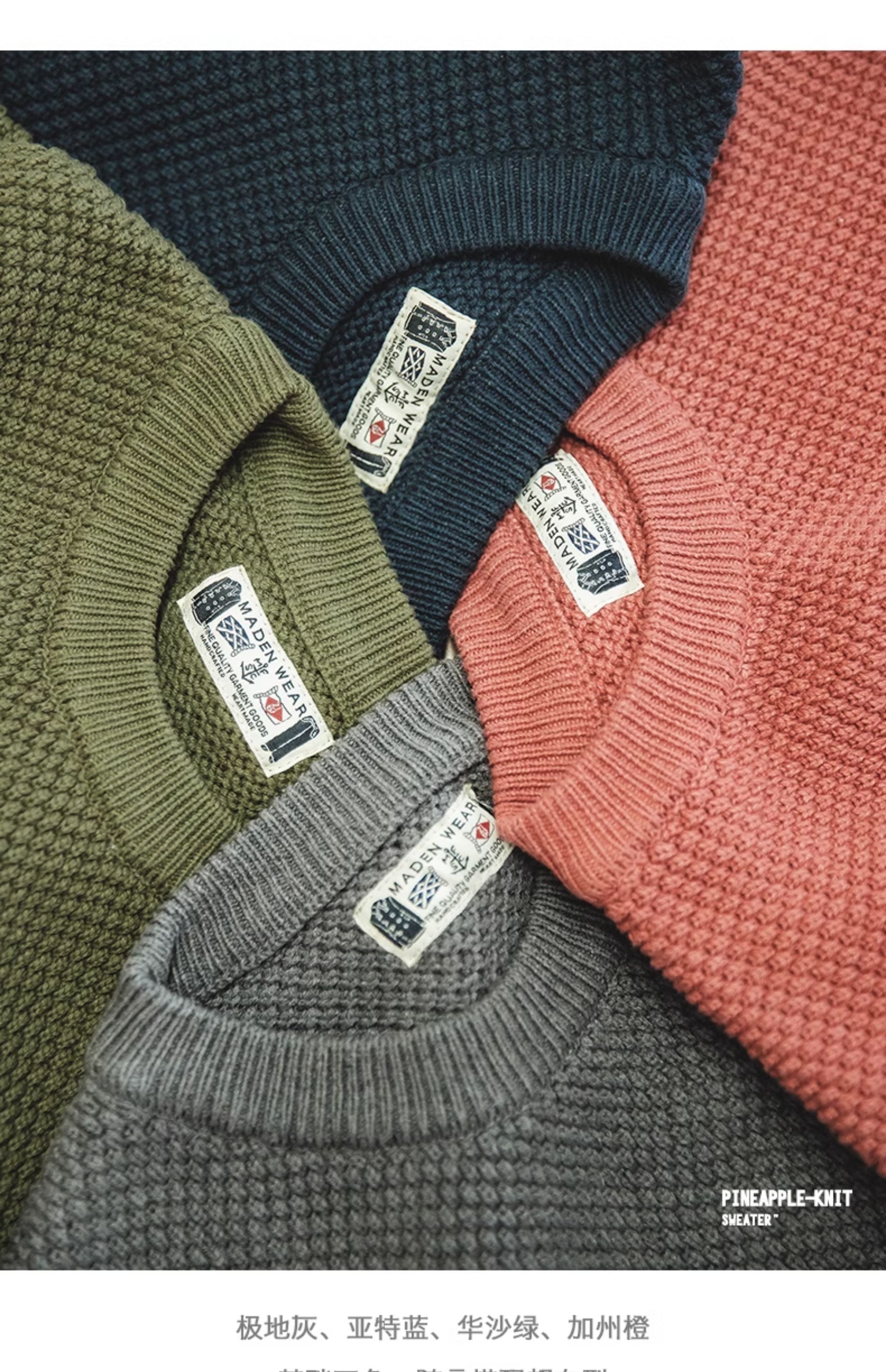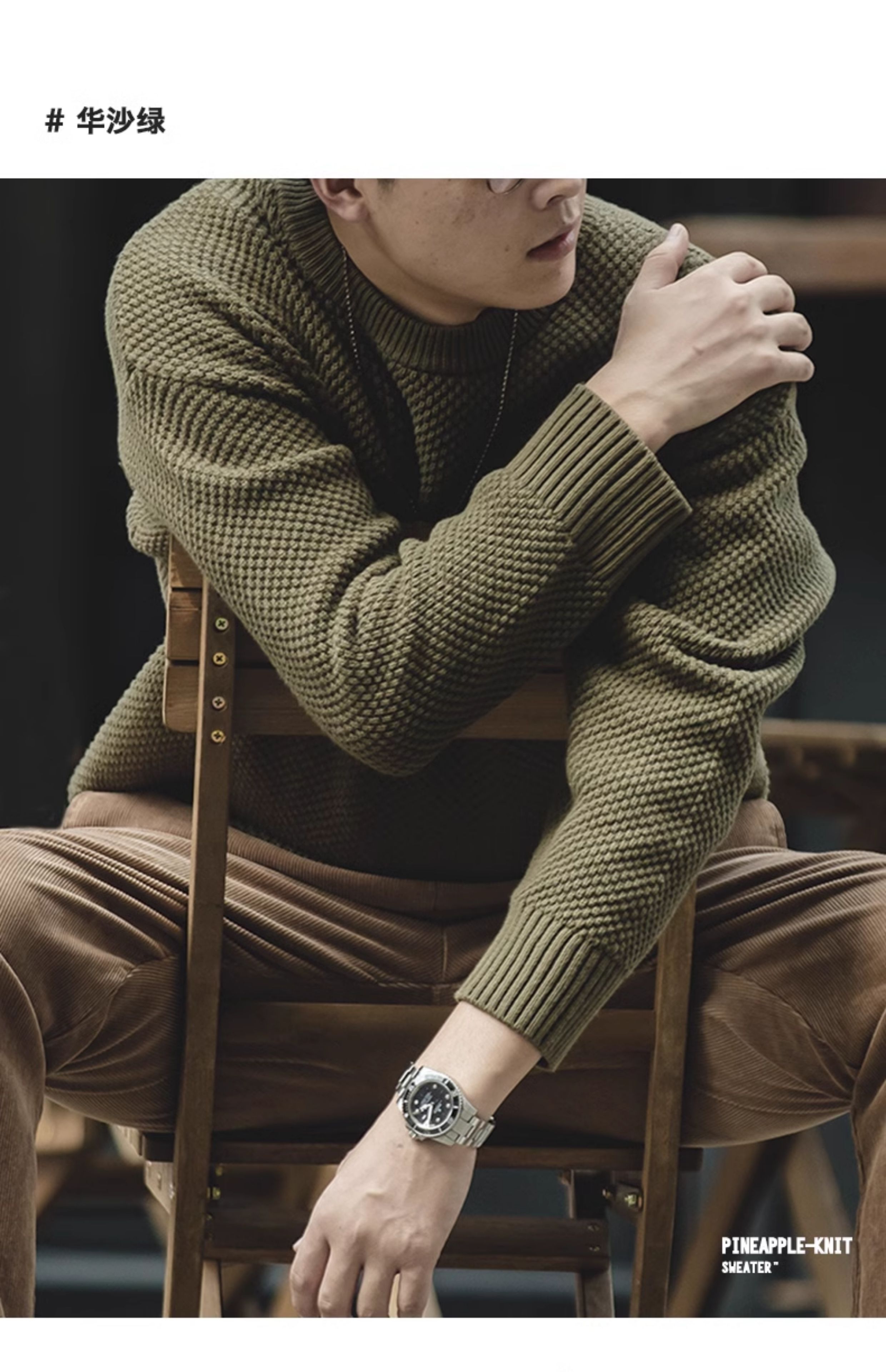 馬登工裝美式復古重磅菠蘿紋毛衣加厚圓領內搭慵懶針織衫男衣秋
