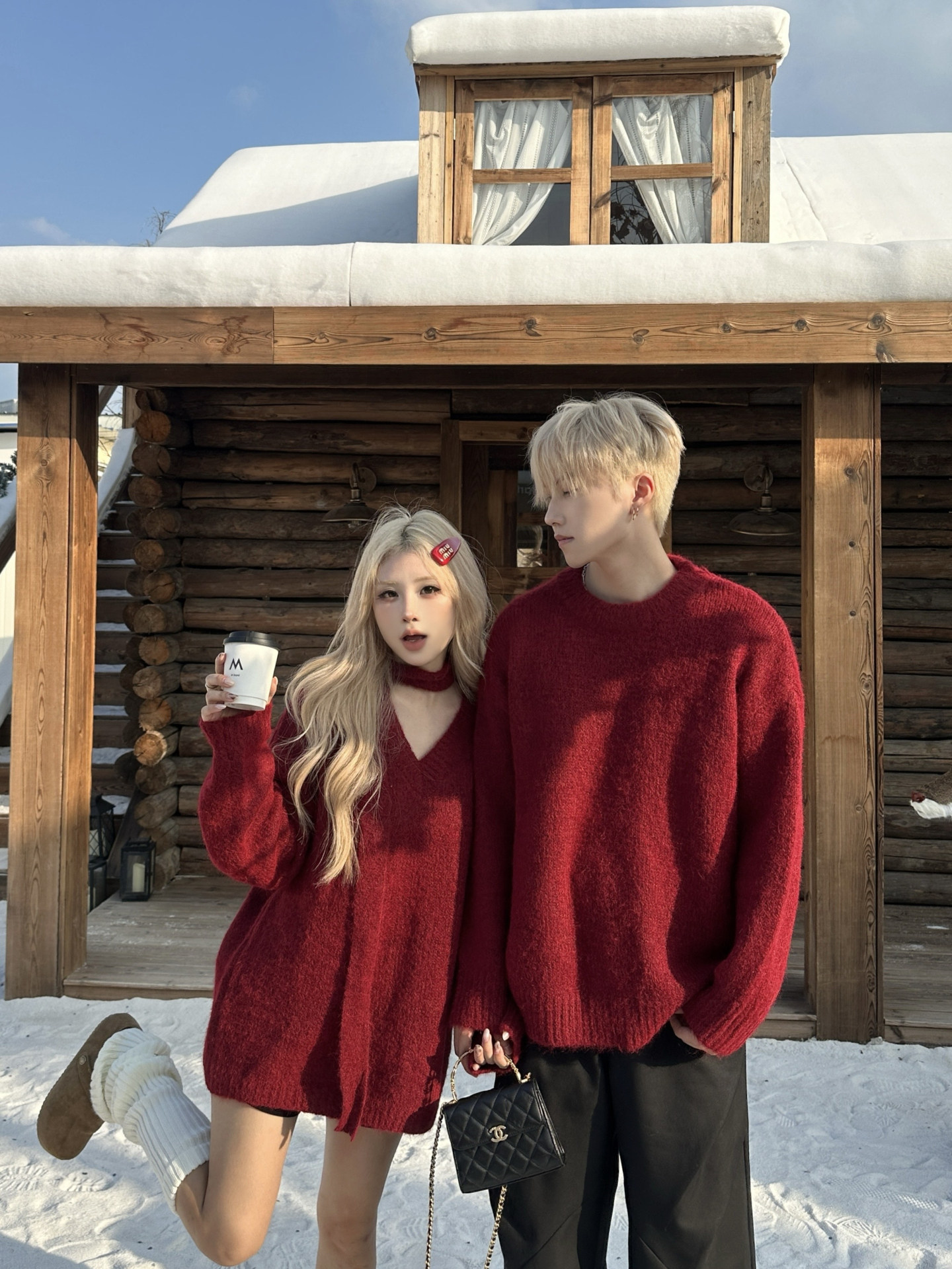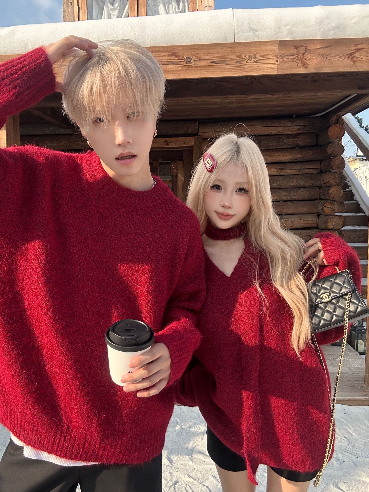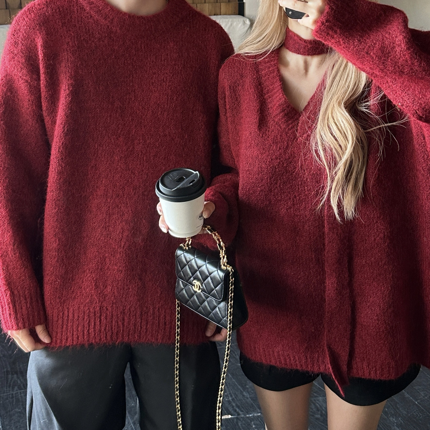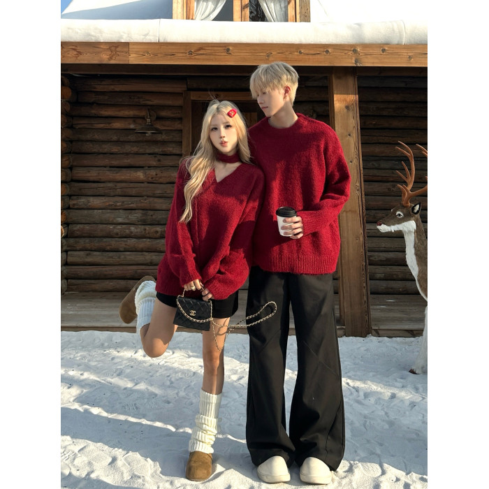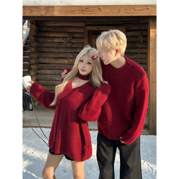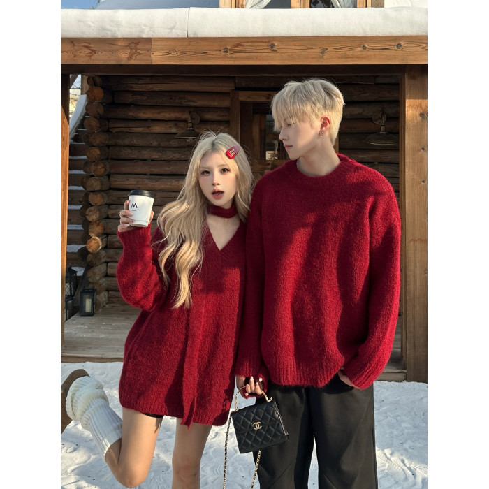 小衆設計感毛衣男女情侶裝秋冬V領新年穿搭紅色慵嬾風針織衫上衣