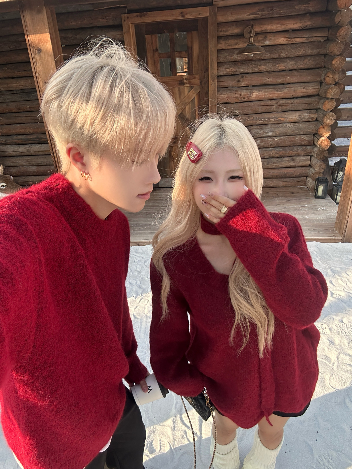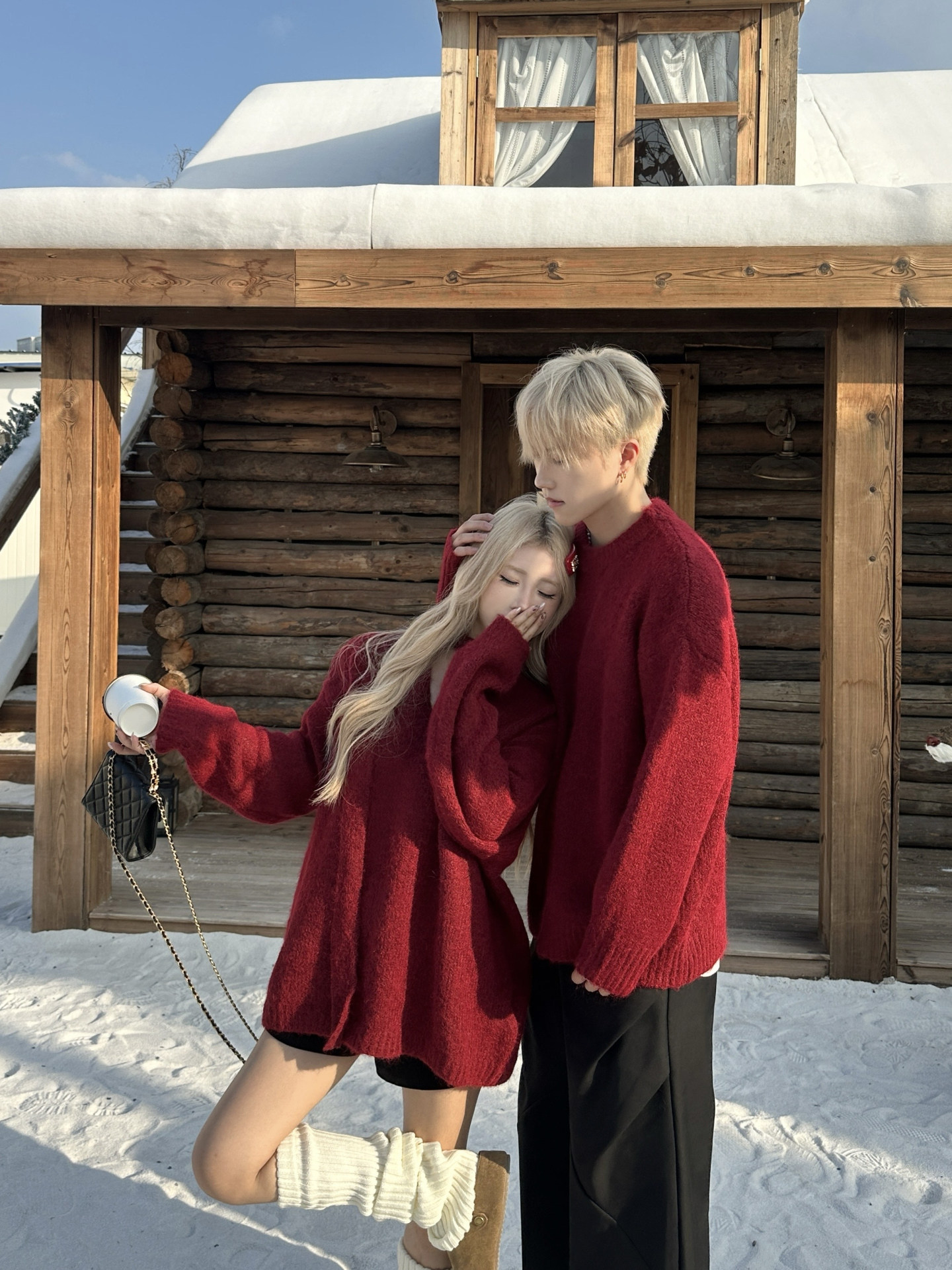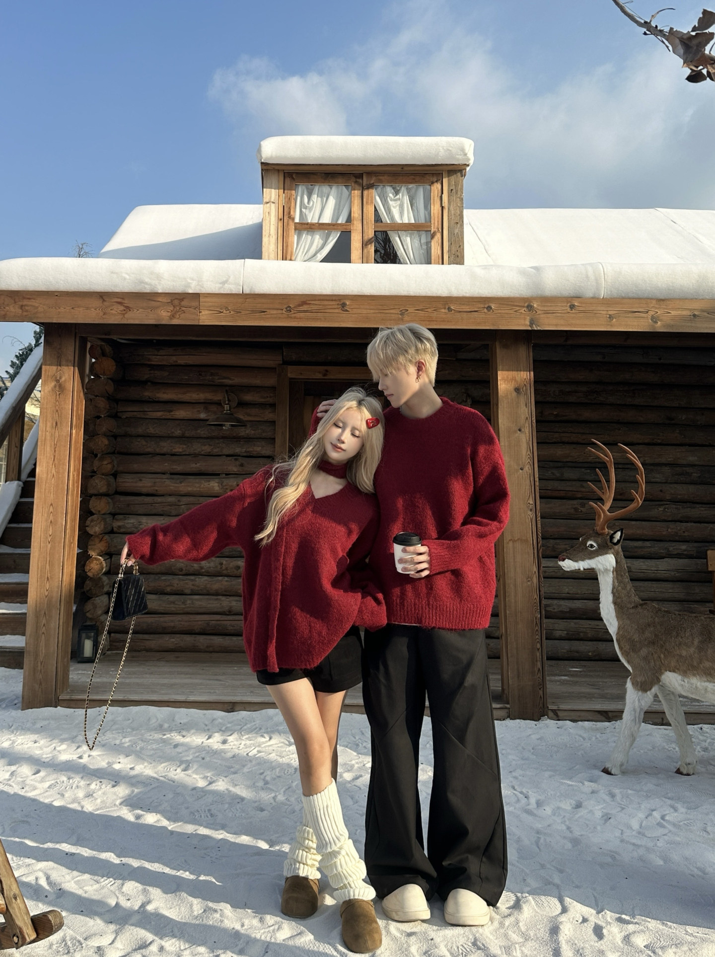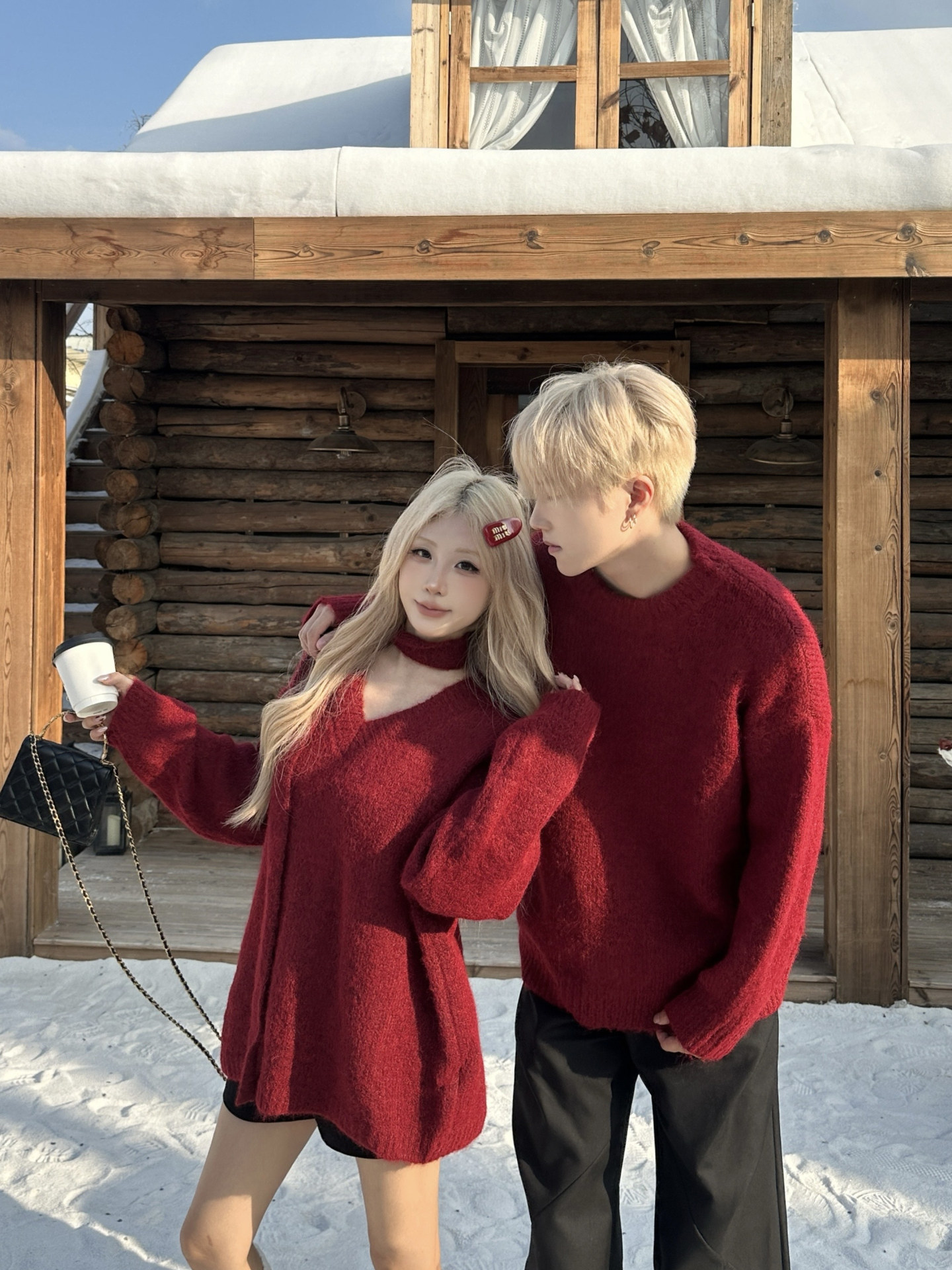 小衆設計感毛衣男女情侶裝秋冬V領新年穿搭紅色慵嬾風針織衫上衣