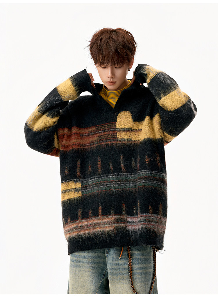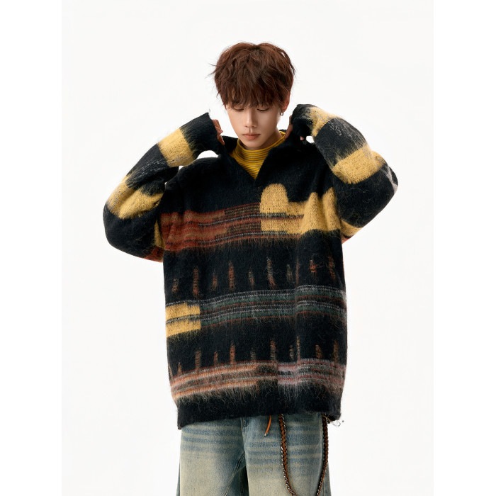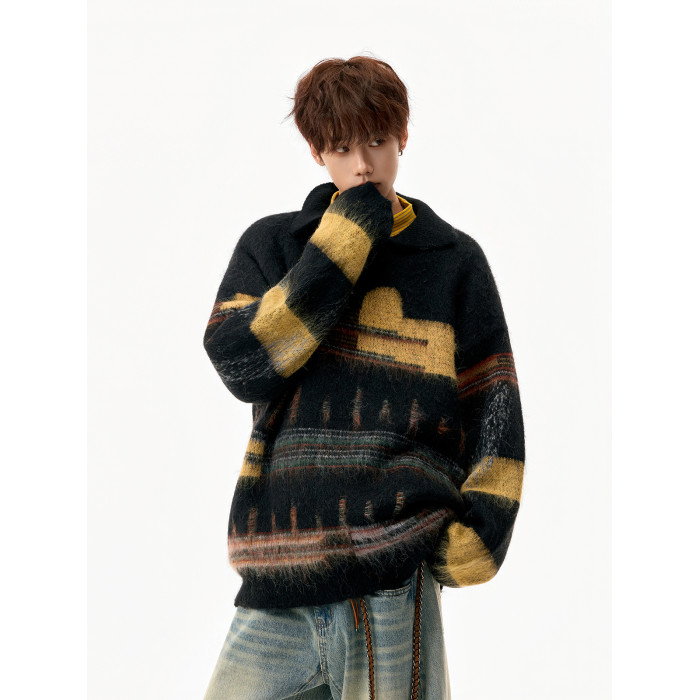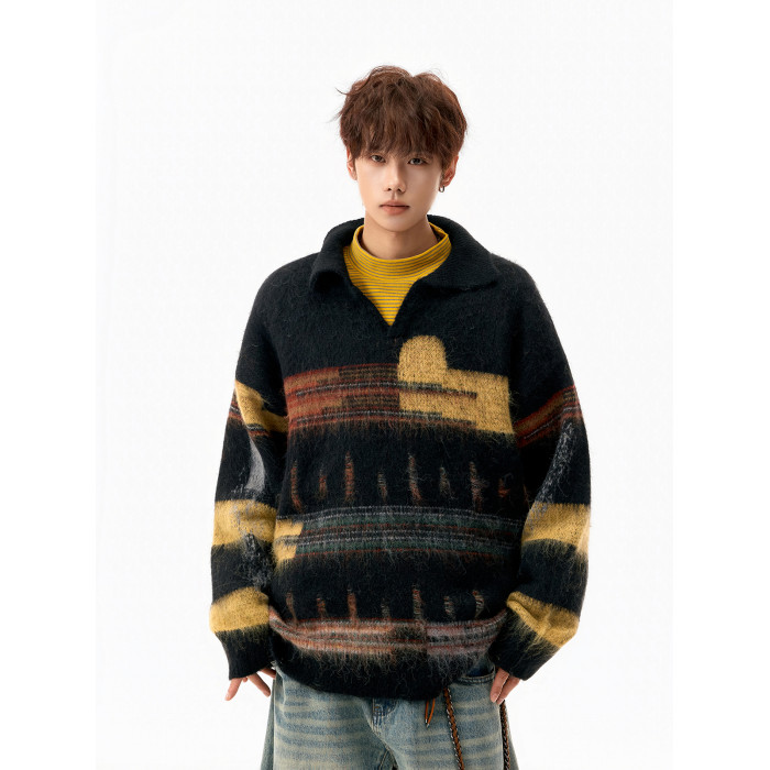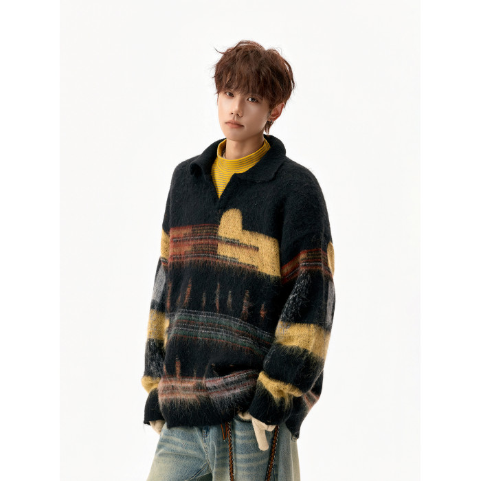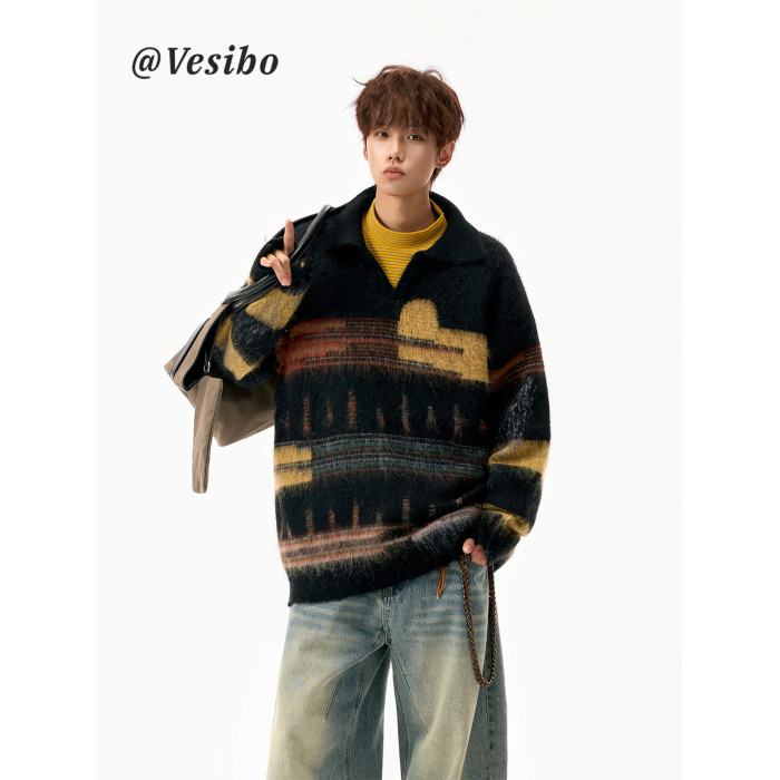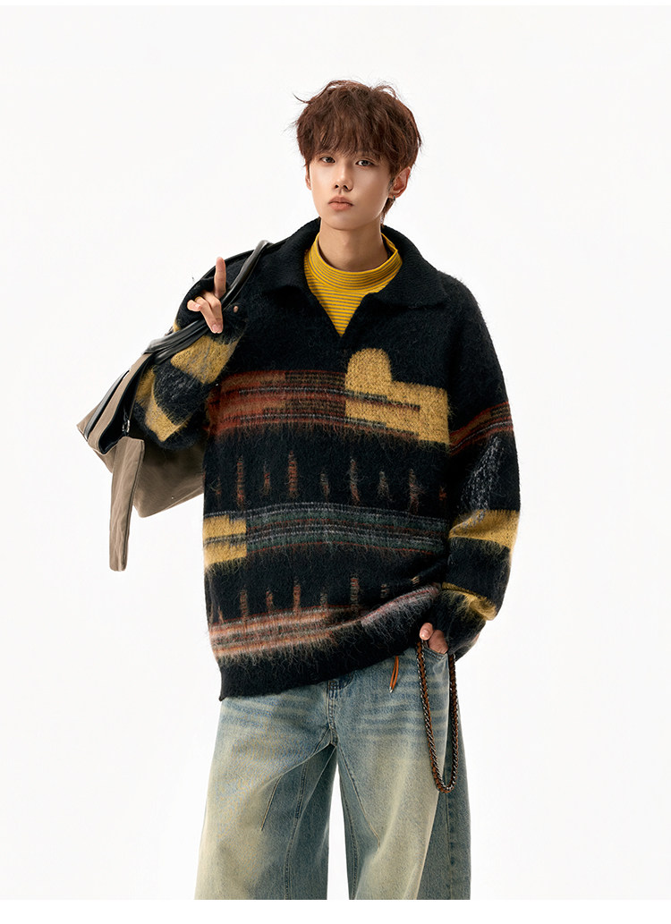 美式撞色Polo領針織衫男冬季潮牌設計感破洞毛衣高街百搭套頭上衣