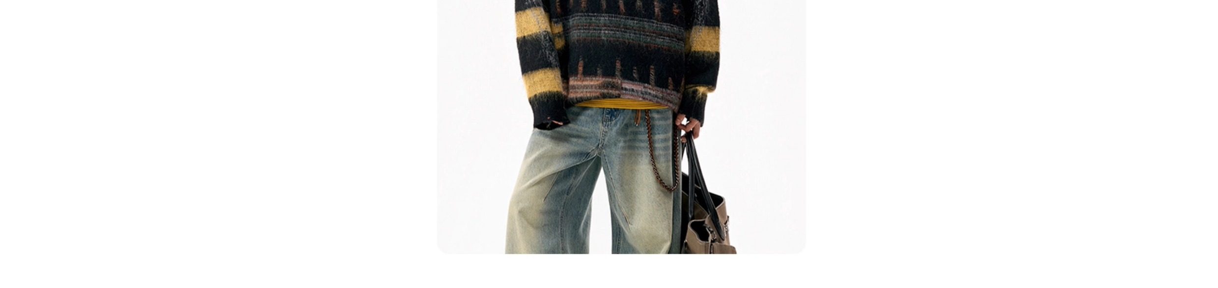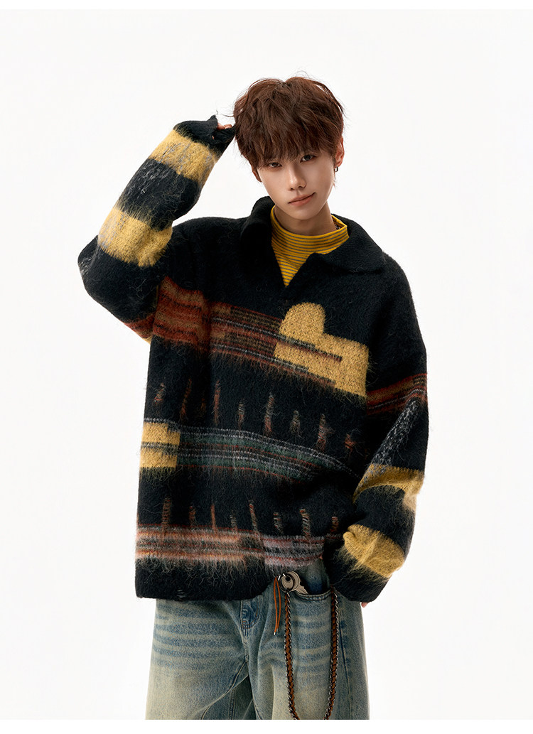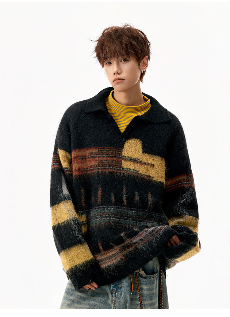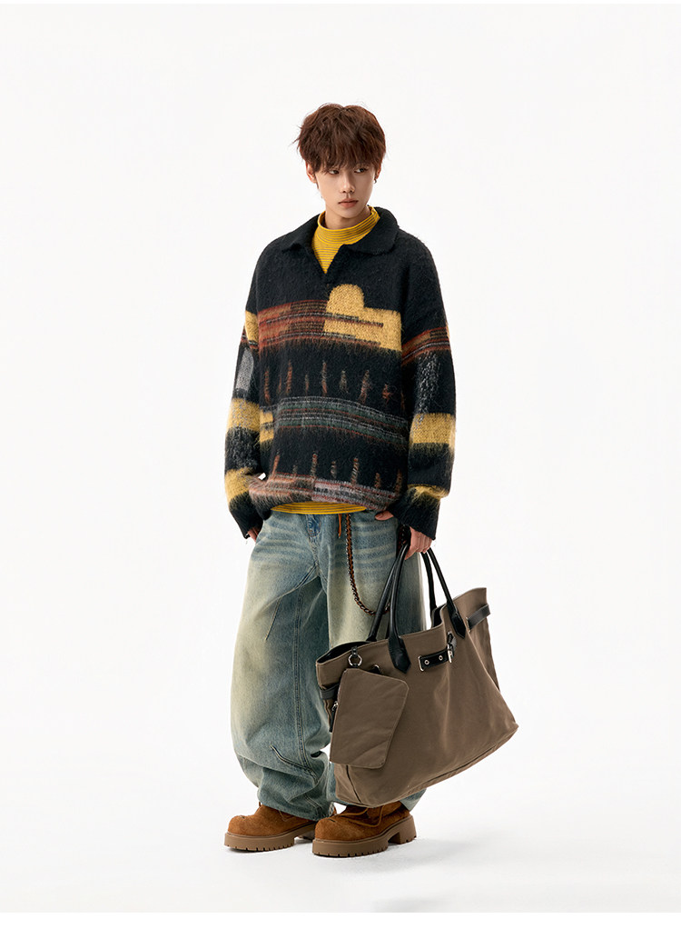 美式撞色Polo領針織衫男冬季潮牌設計感破洞毛衣高街百搭套頭上衣