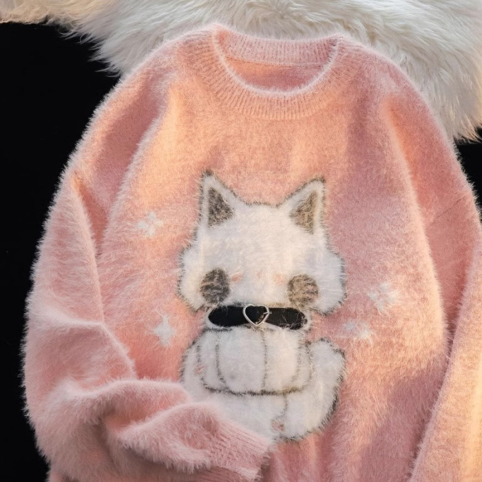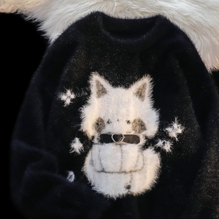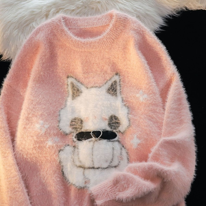 美式復古軟糯可愛貓咪毛絨絨毛衣男女秋冬加絨寬松慵懶風針織外套