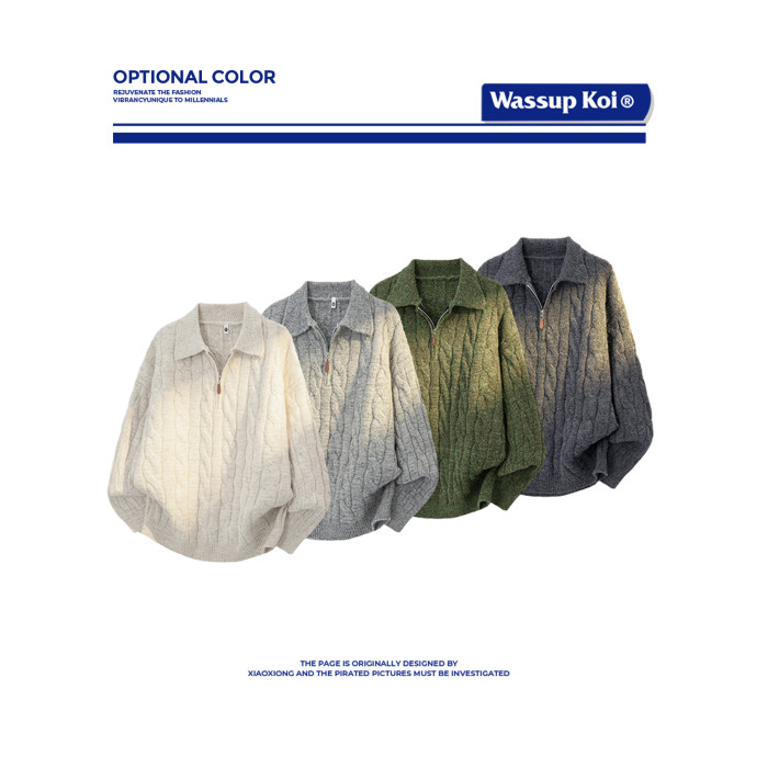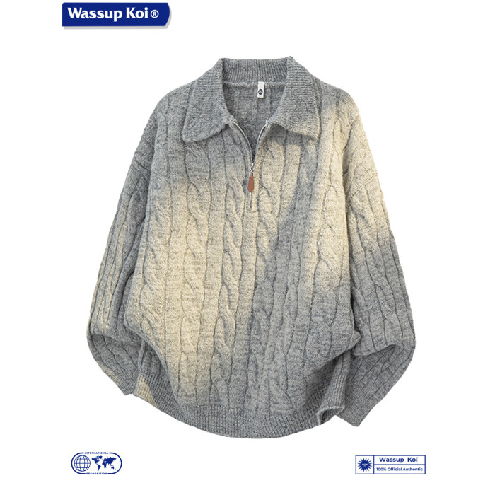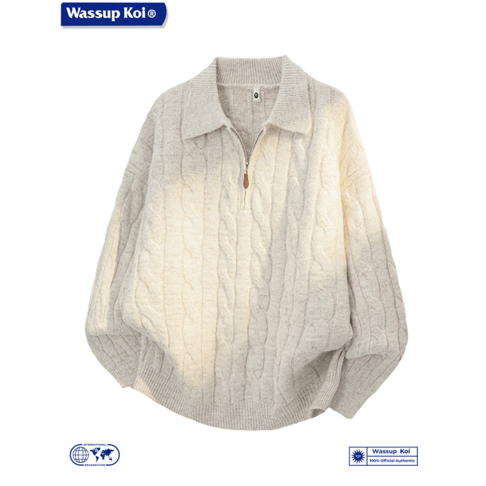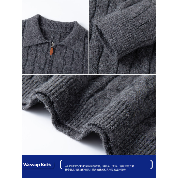 WASSUP KOI復古麻花半拉鍊POLO領針織衫男女慵懶寬松加厚保暖毛衣