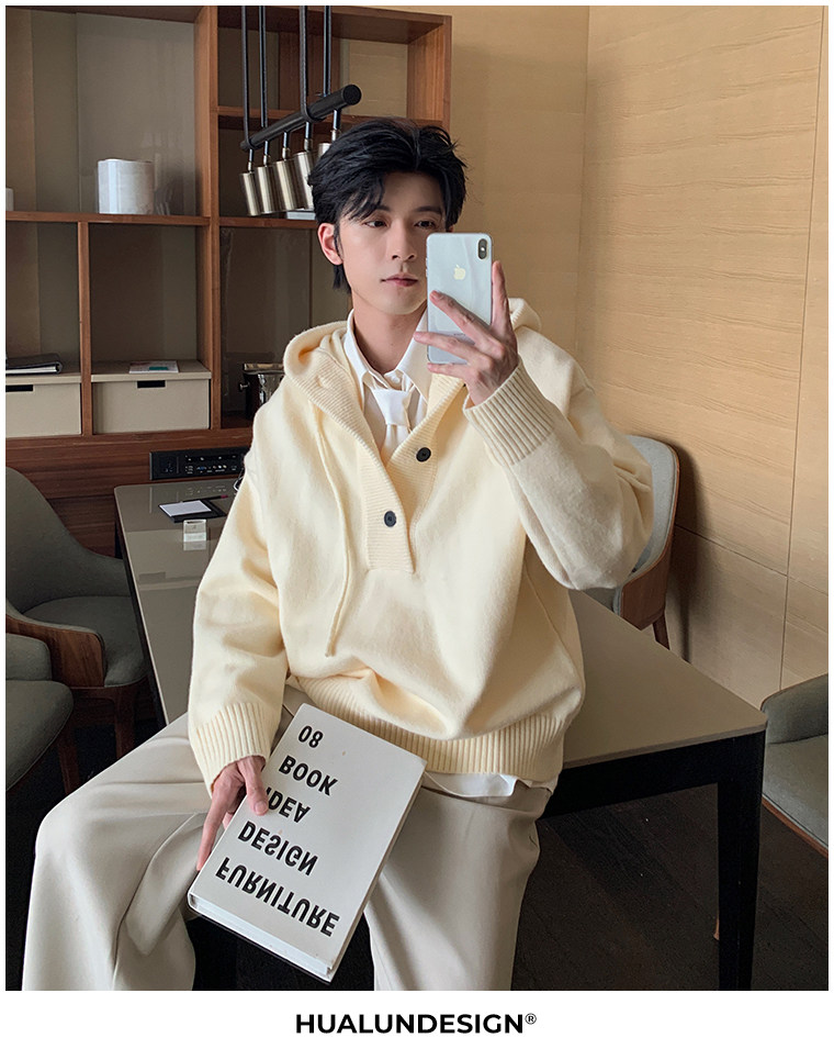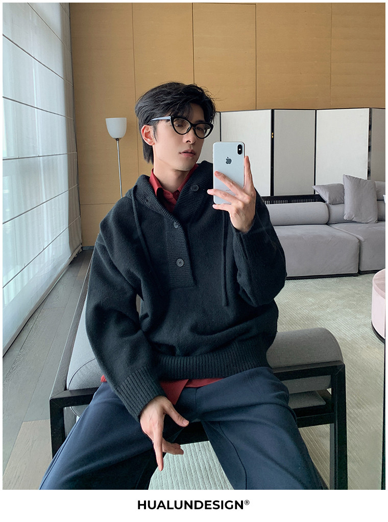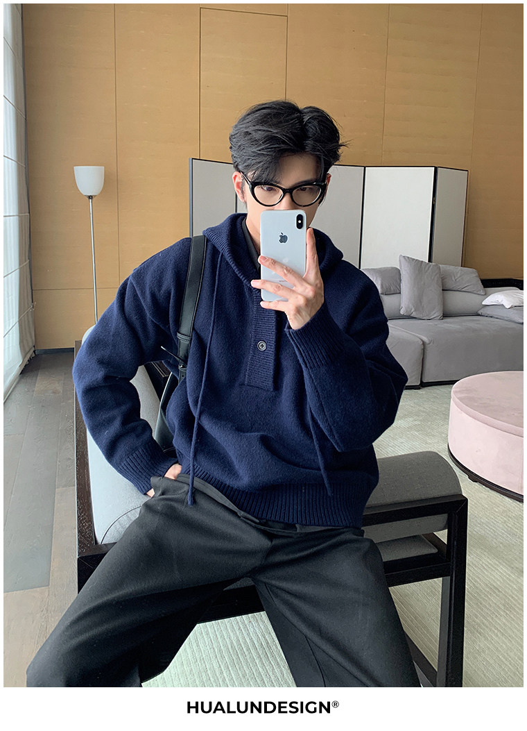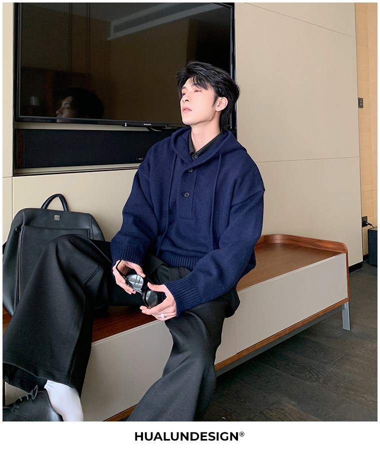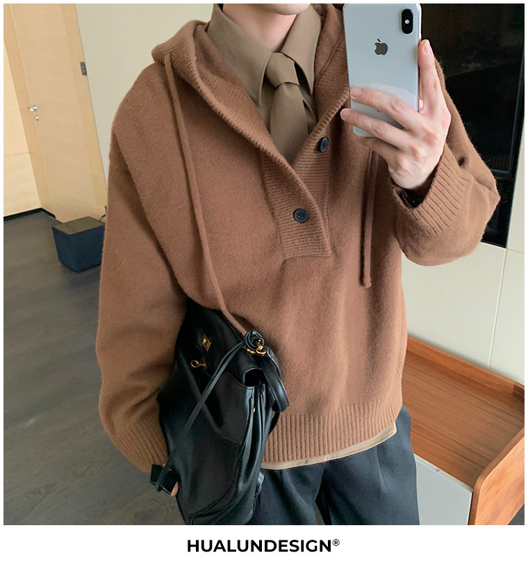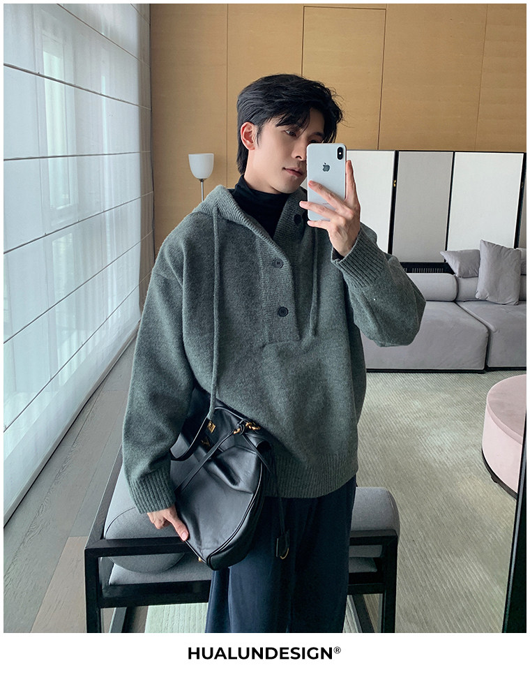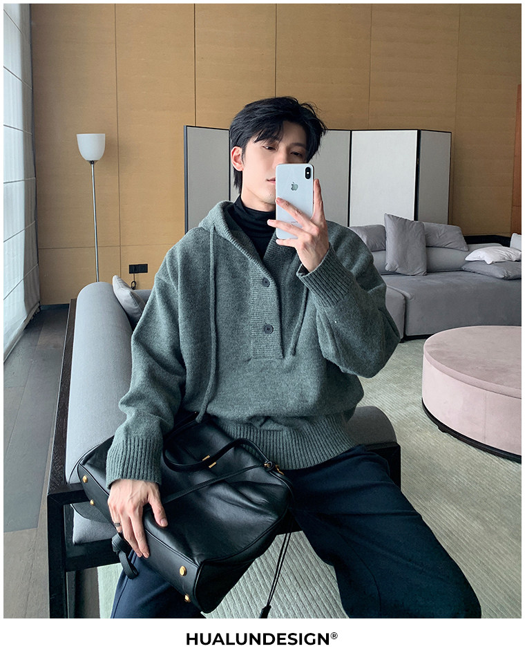 Hualun秋冬季超好看連帽毛衣男士半開衫針織衫男潮牌情侶套頭上衣