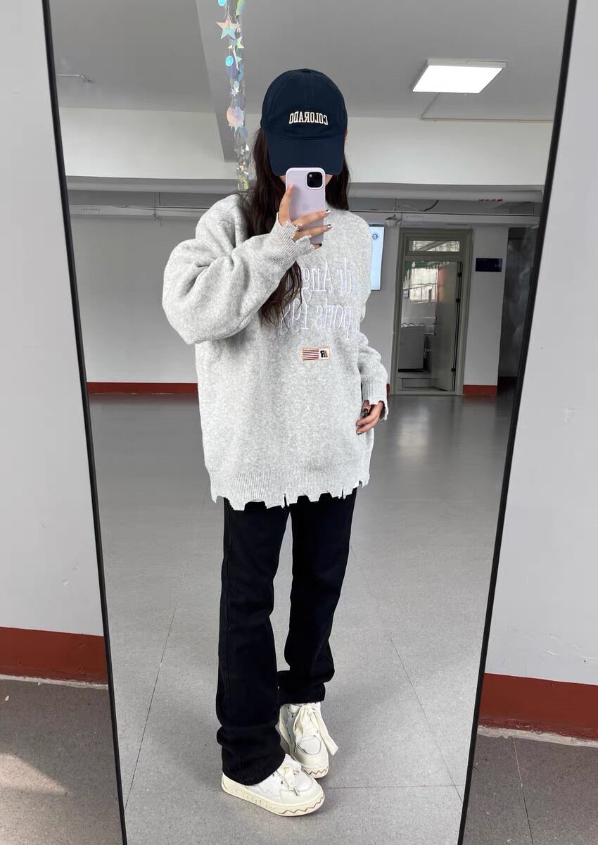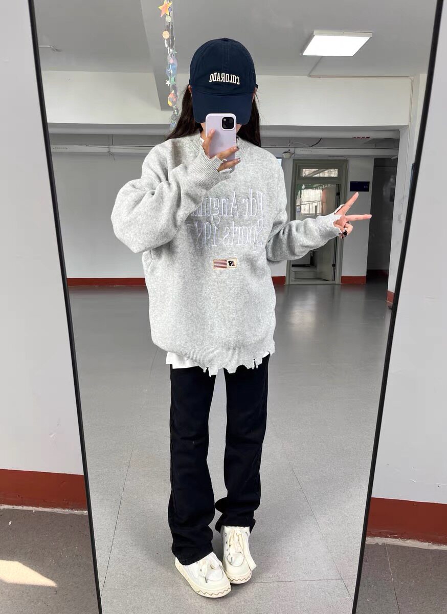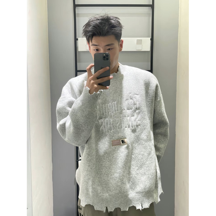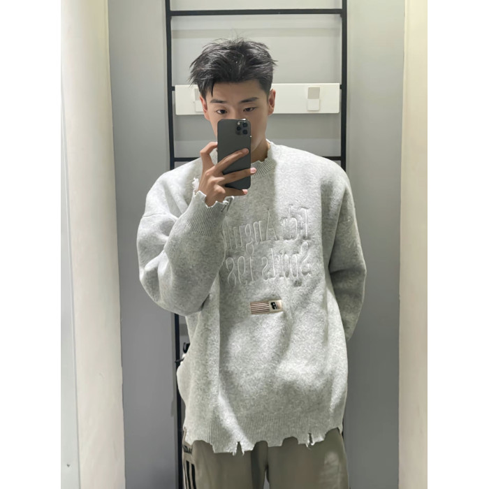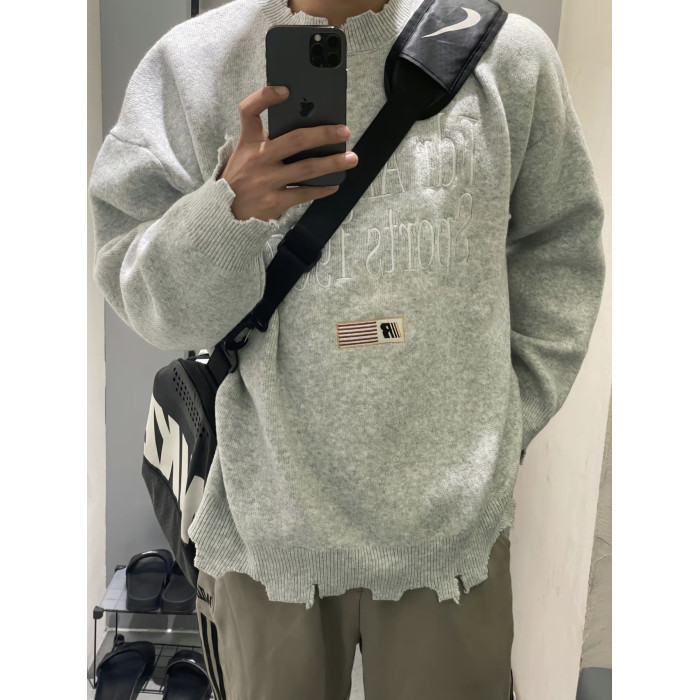 美式復古刺綉破壞設計毛衣男女秋冬潮牌小衆慵嬾風寬鬆軟糯針織衫
